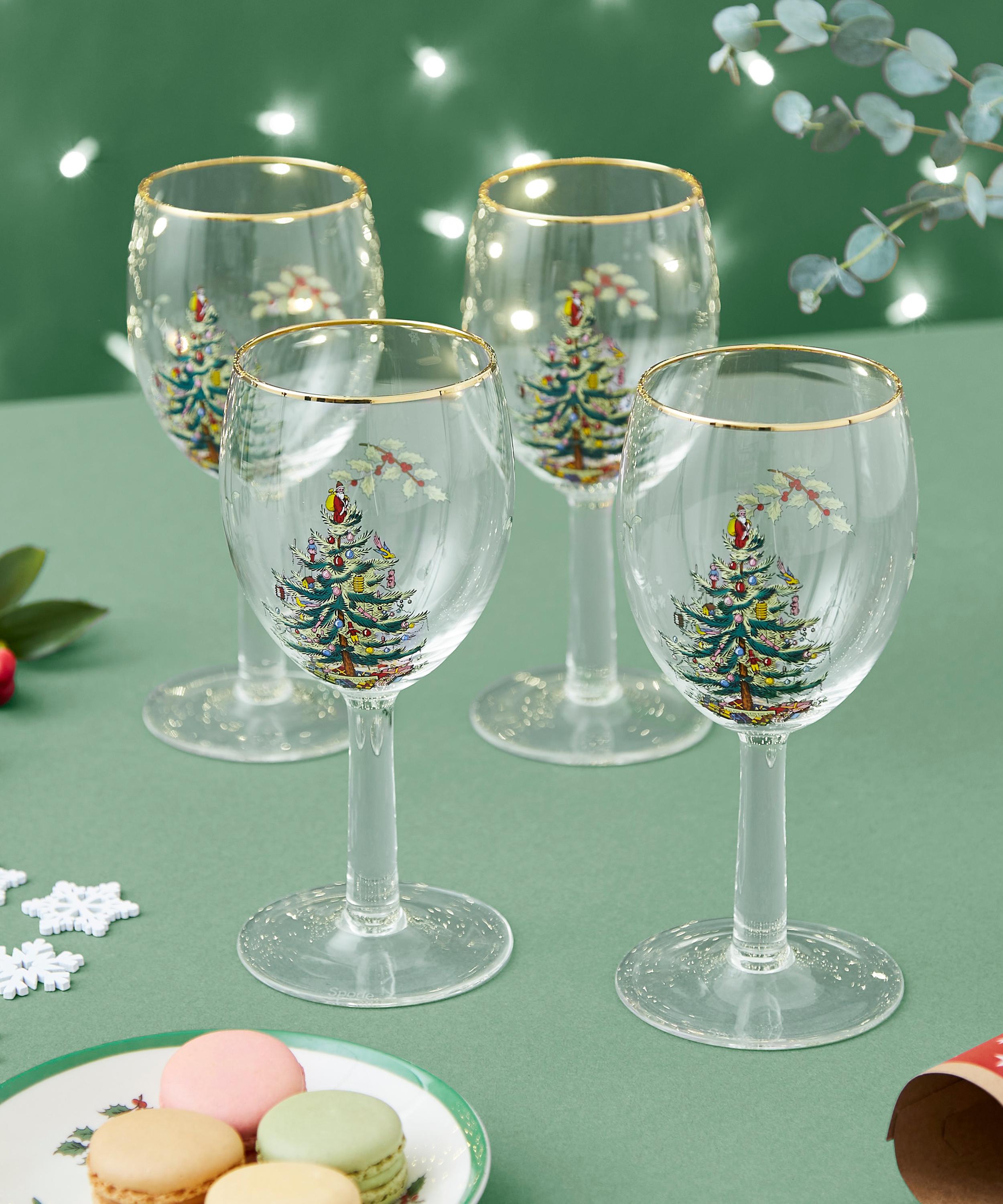 Bring festive finesse to your tablescape through the Christmas Tree wine glasses set from Spode, England's oldest porcelain manufacturer.