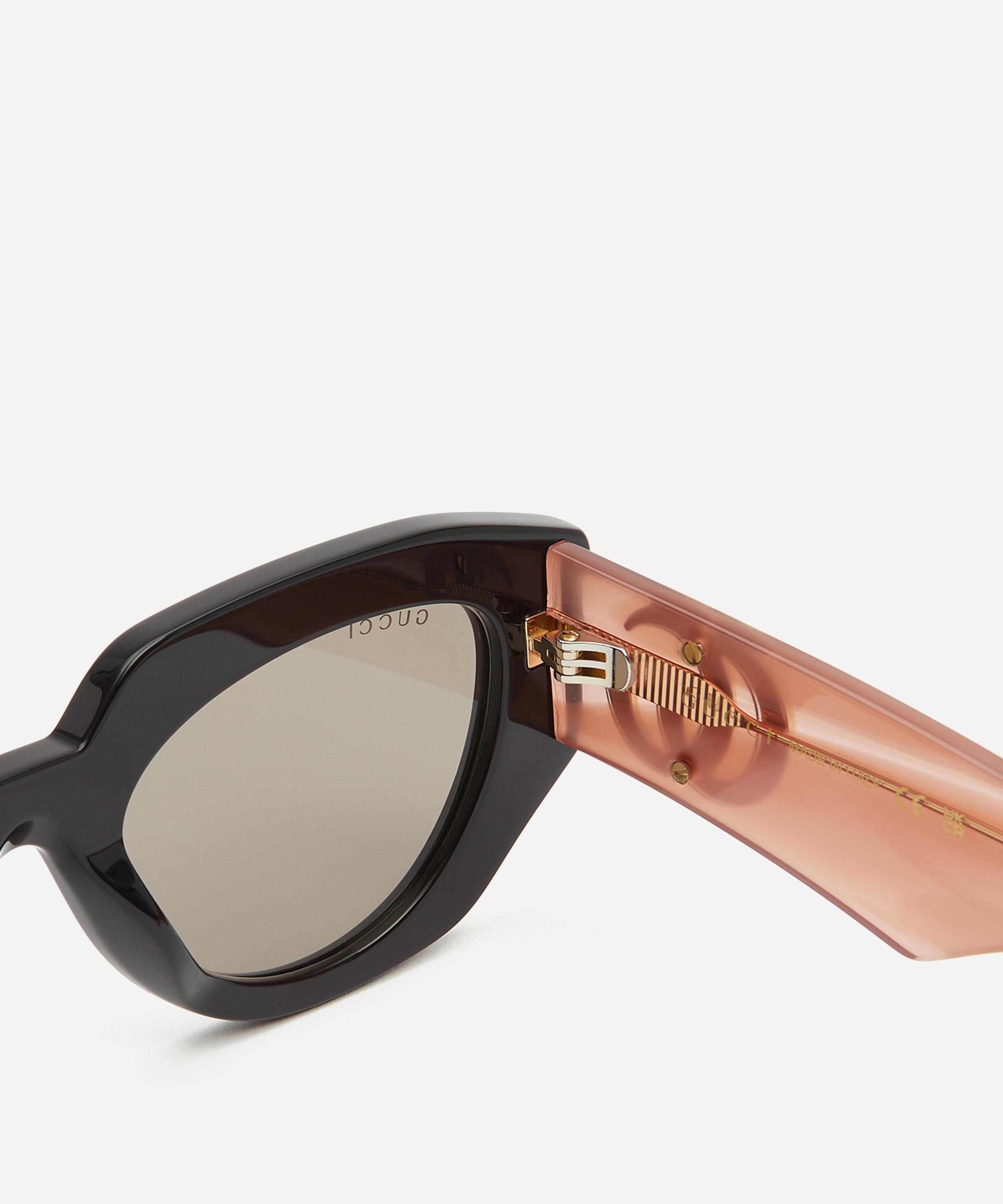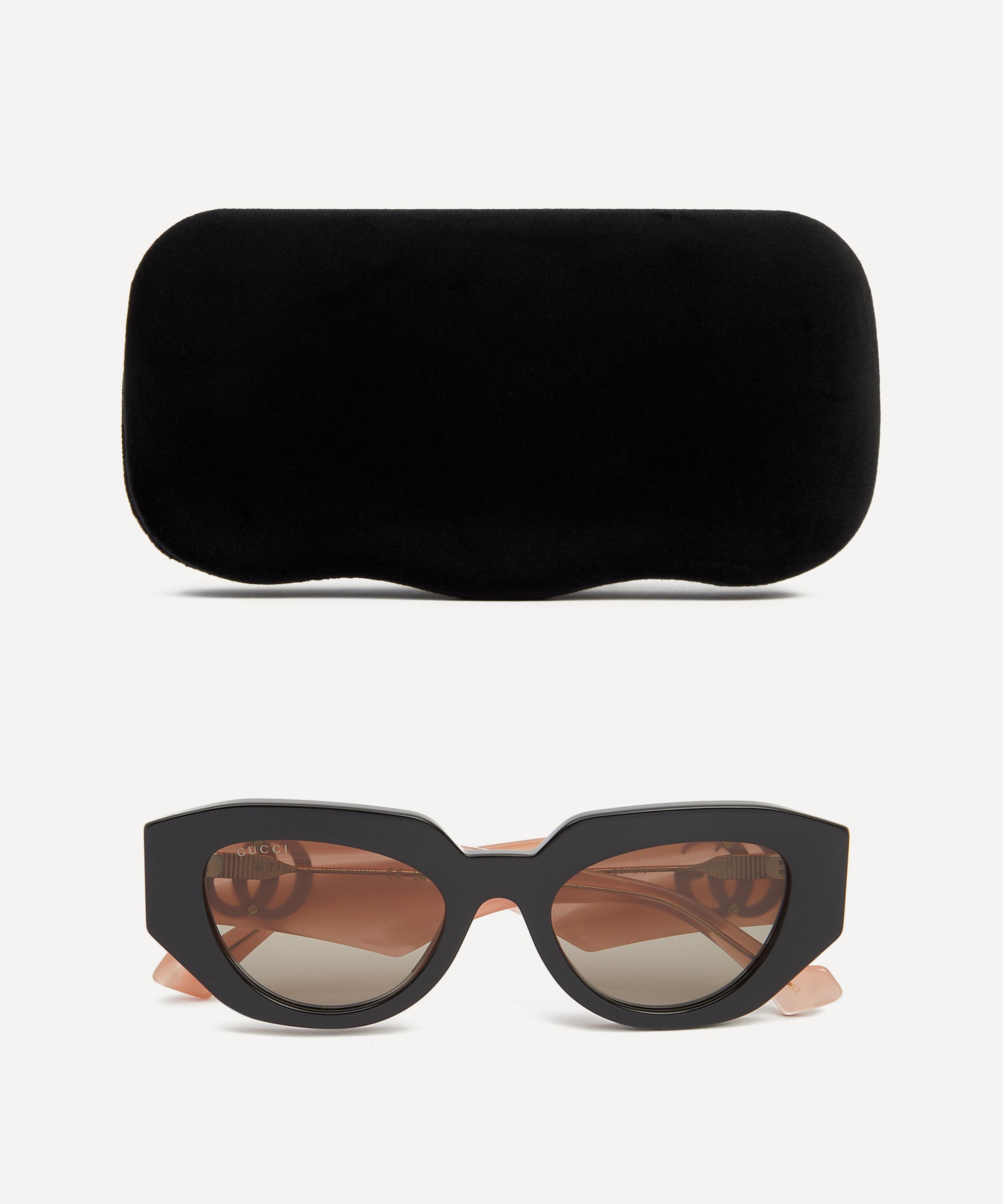 Meticulously crafted from glossy acetate in a black hue, this pair boast a chunky cat eye silhouette fitted with tinted lenses to shade and protect your eyes from UV light. Complete with the fashion house's iconic interlocking G logo fixed to the wide, light pink temples for an authentic finish, they offer a perfect blend of timeless elegance and modern luxury.