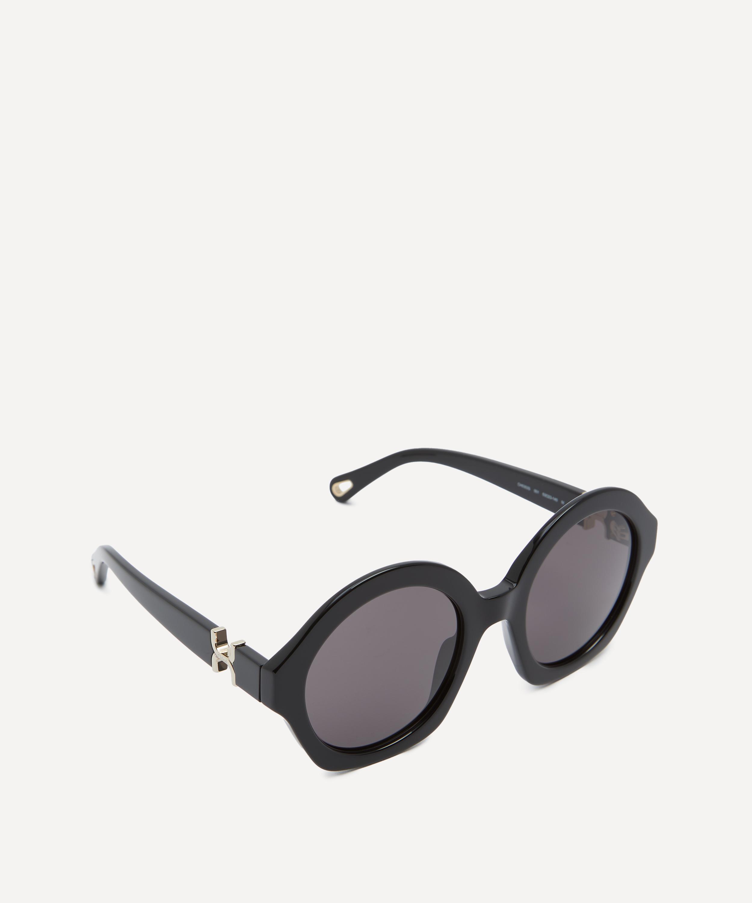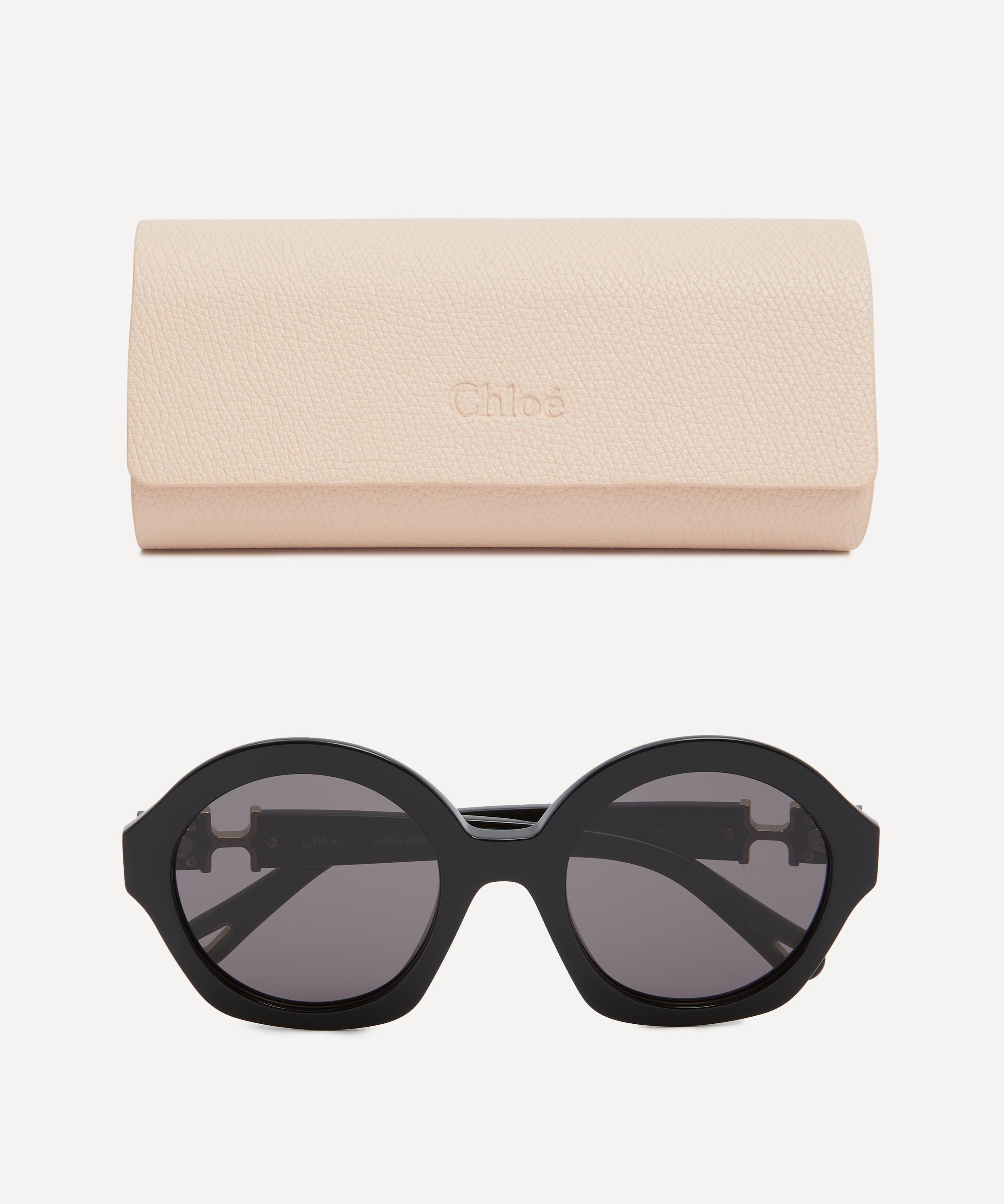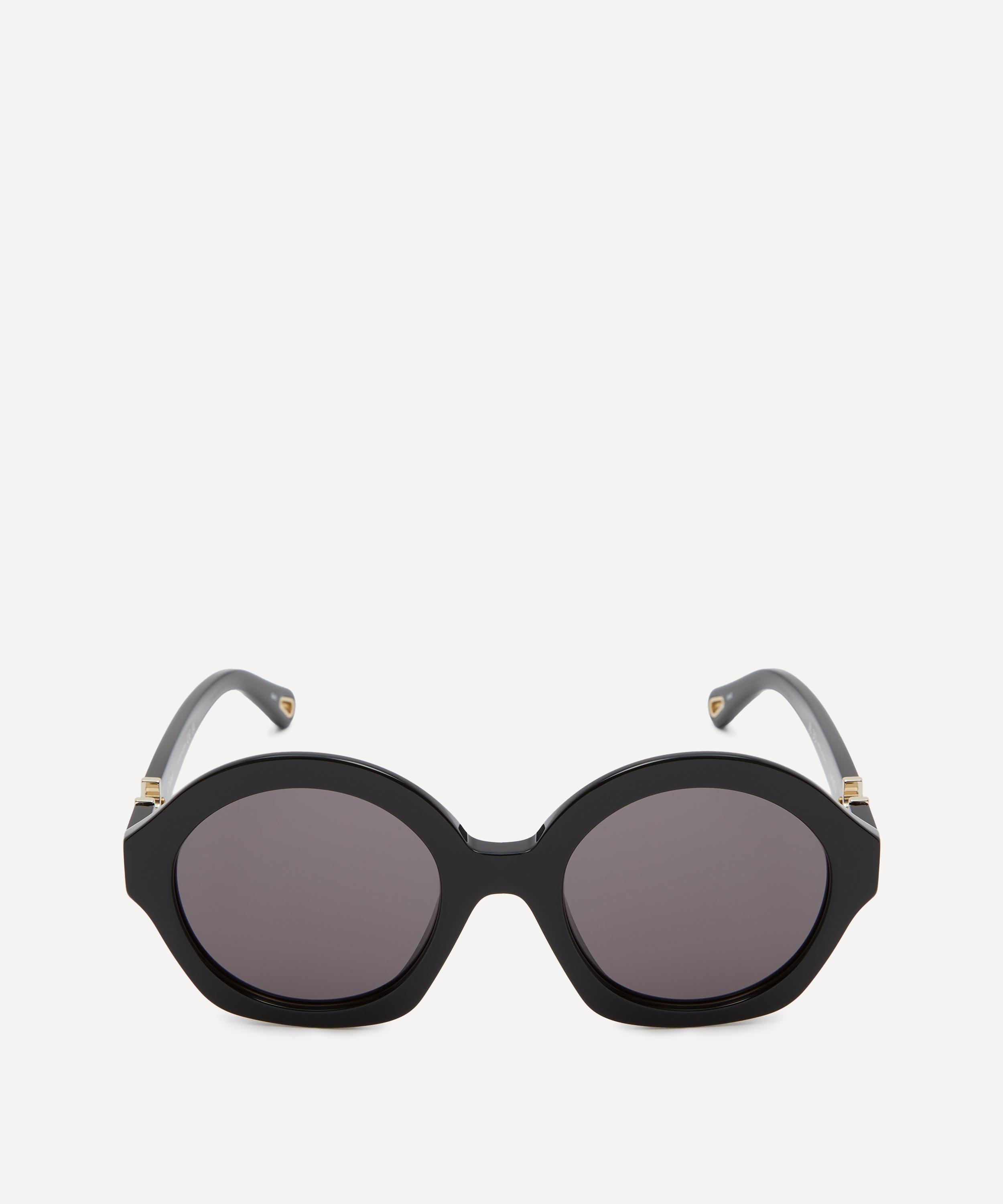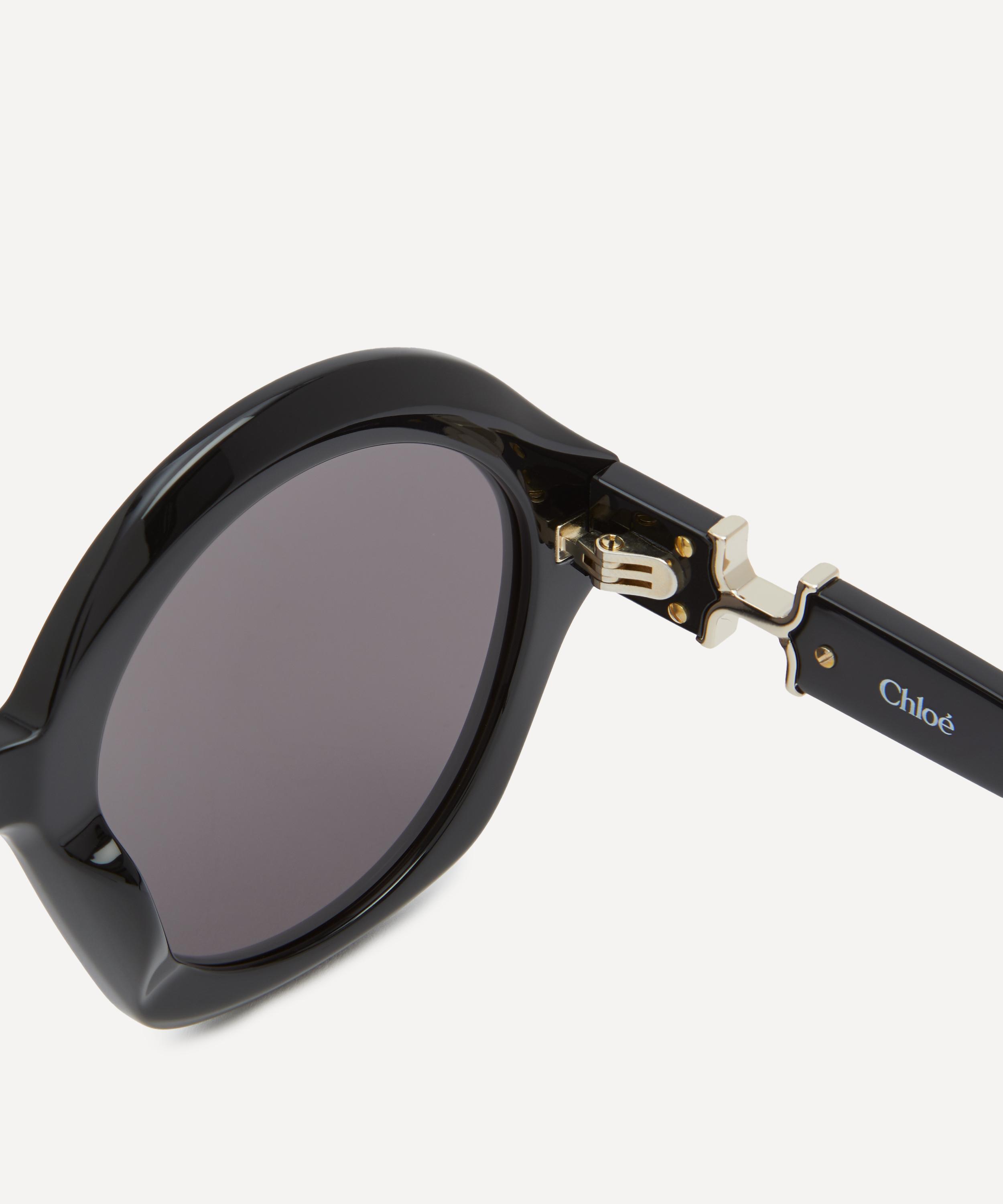 Crafted from glossy acetate in a classic black colourway, these bold frames have been fitted with grey-tinted lenses, and are complete with gold-tone details at the temples that further accentuate the style's glamorous, retro flair.