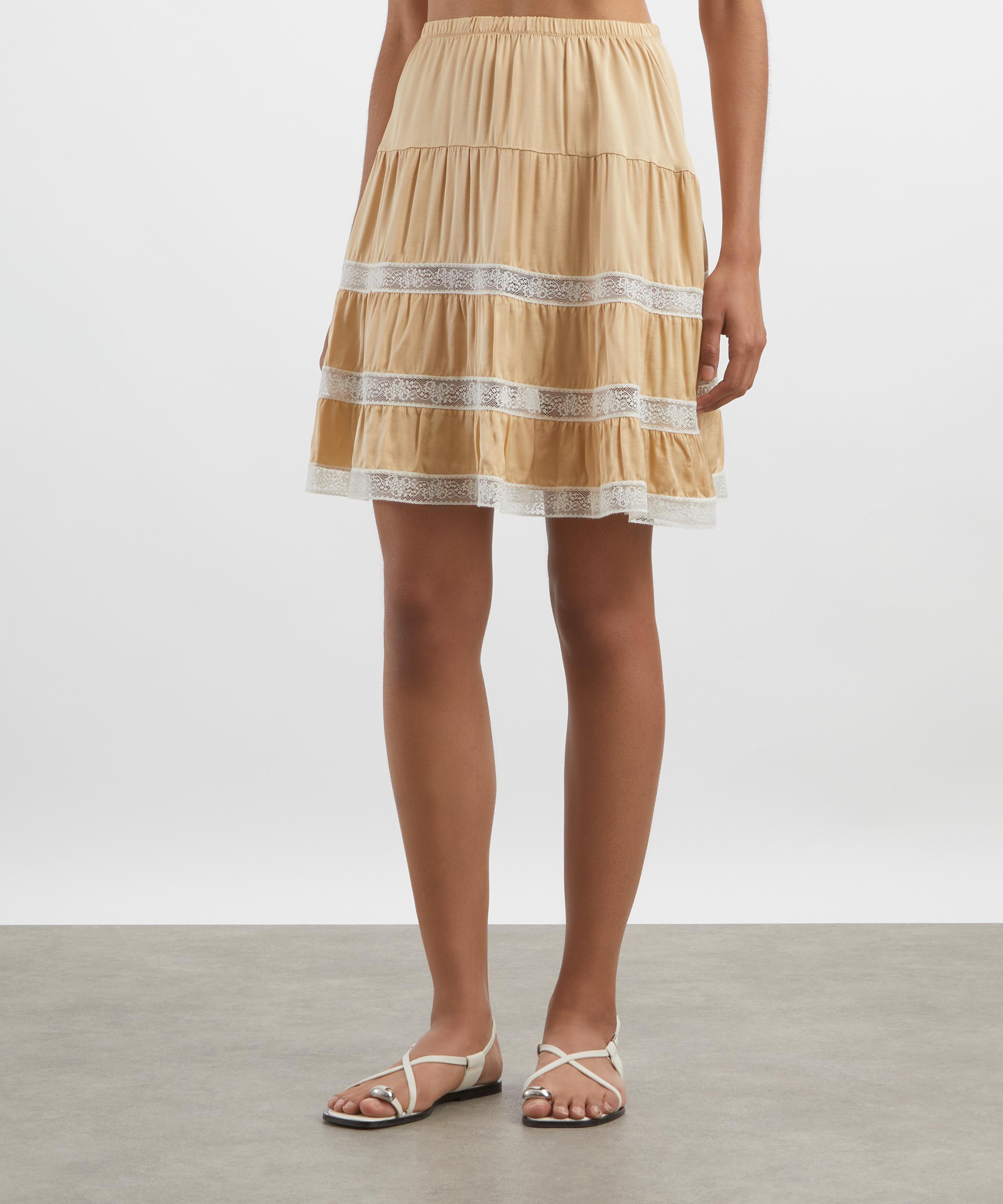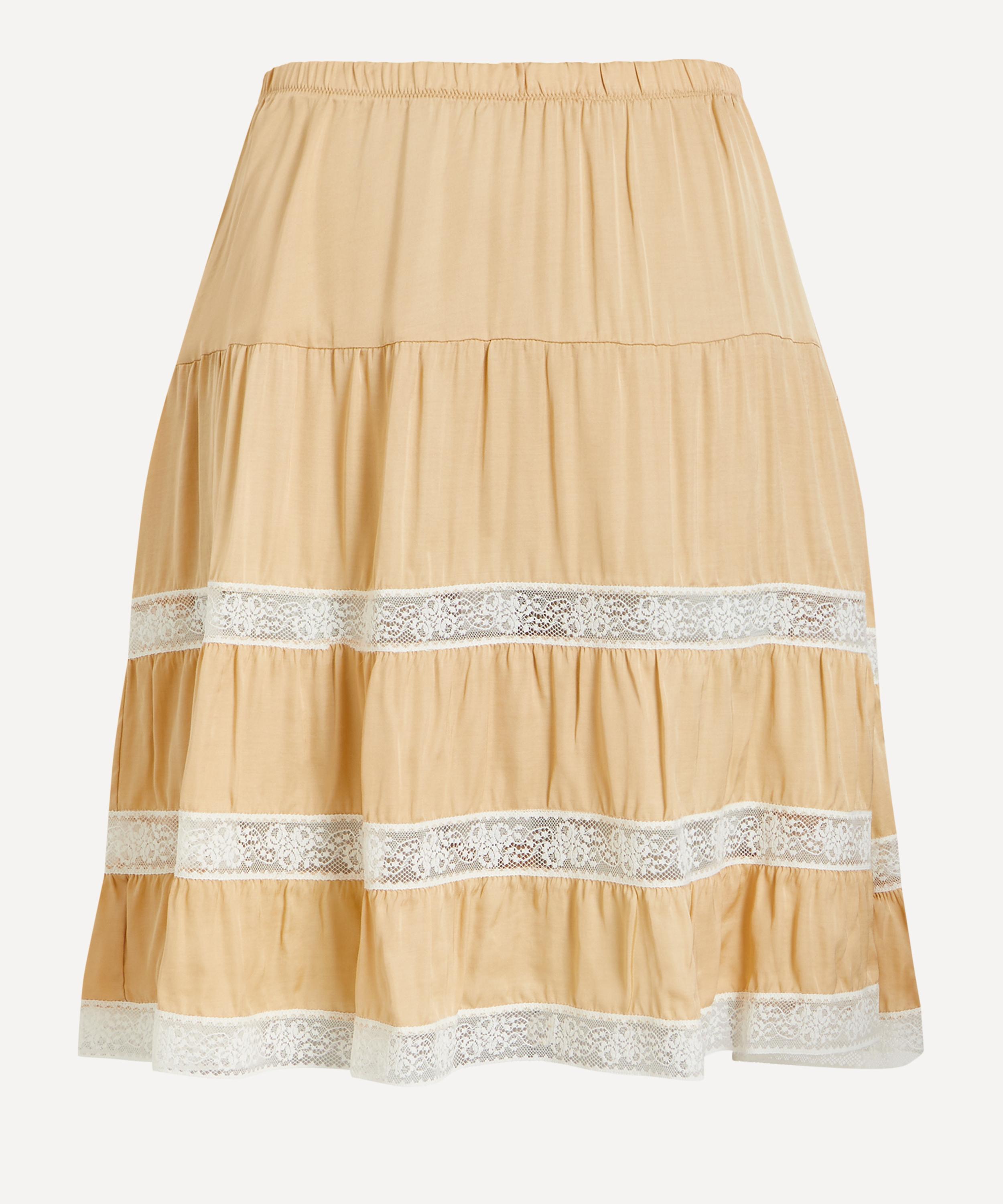 Crafted from lightweight satin, this midi skirt features an elegantly tiered construction complete with contrast white trims for a delicate touch.