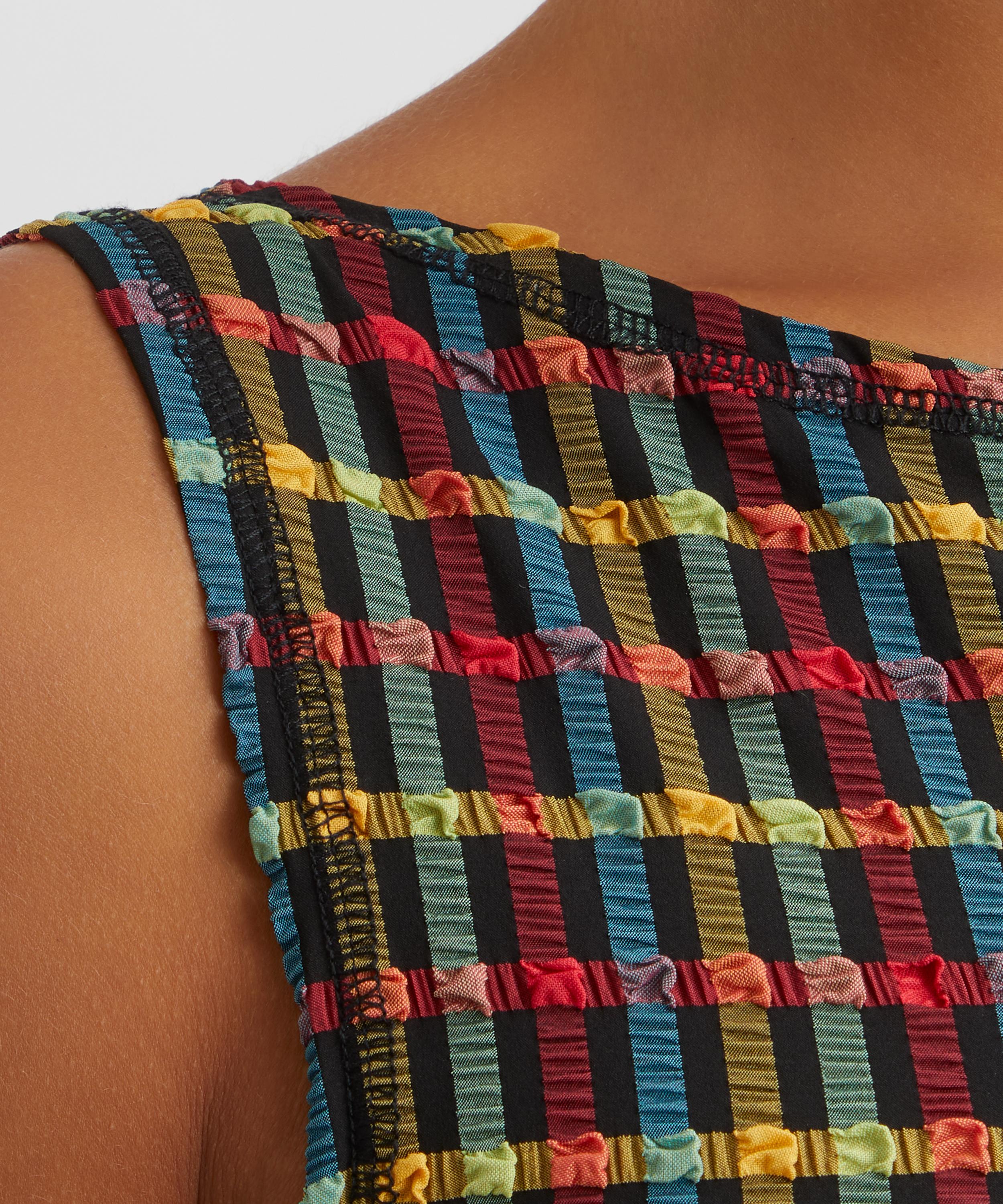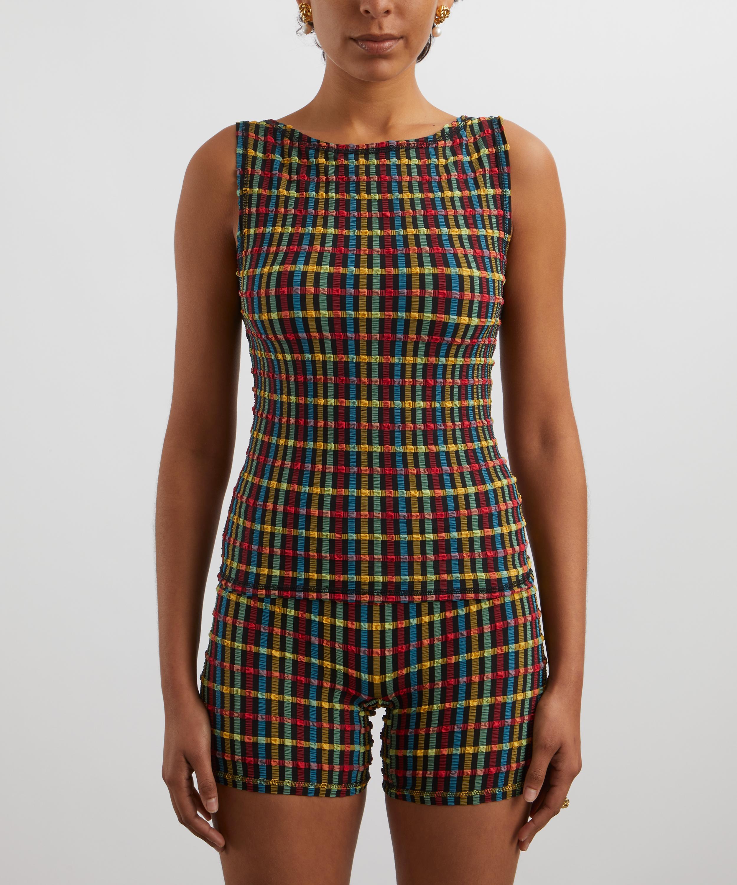 Slinky and sleeveless, this form-fitting tank top is crafted from seersucker fabric presenting a multi-coloured gingham pattern throughout. Finished with an elegant boat neckline, it’s made to be matched with the Cindy Shorts.