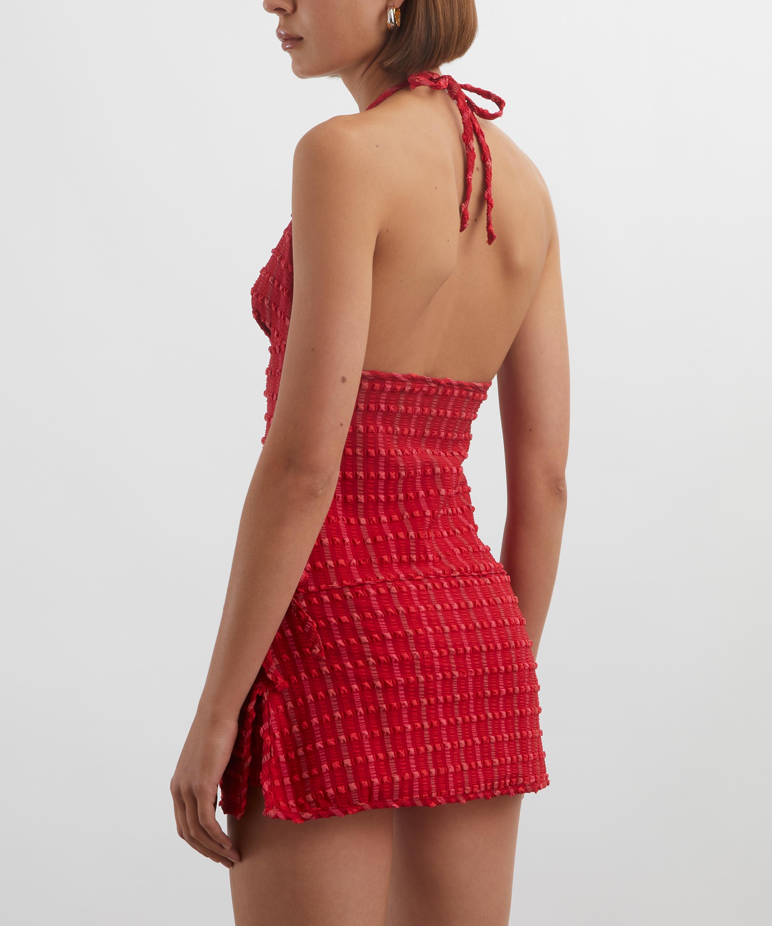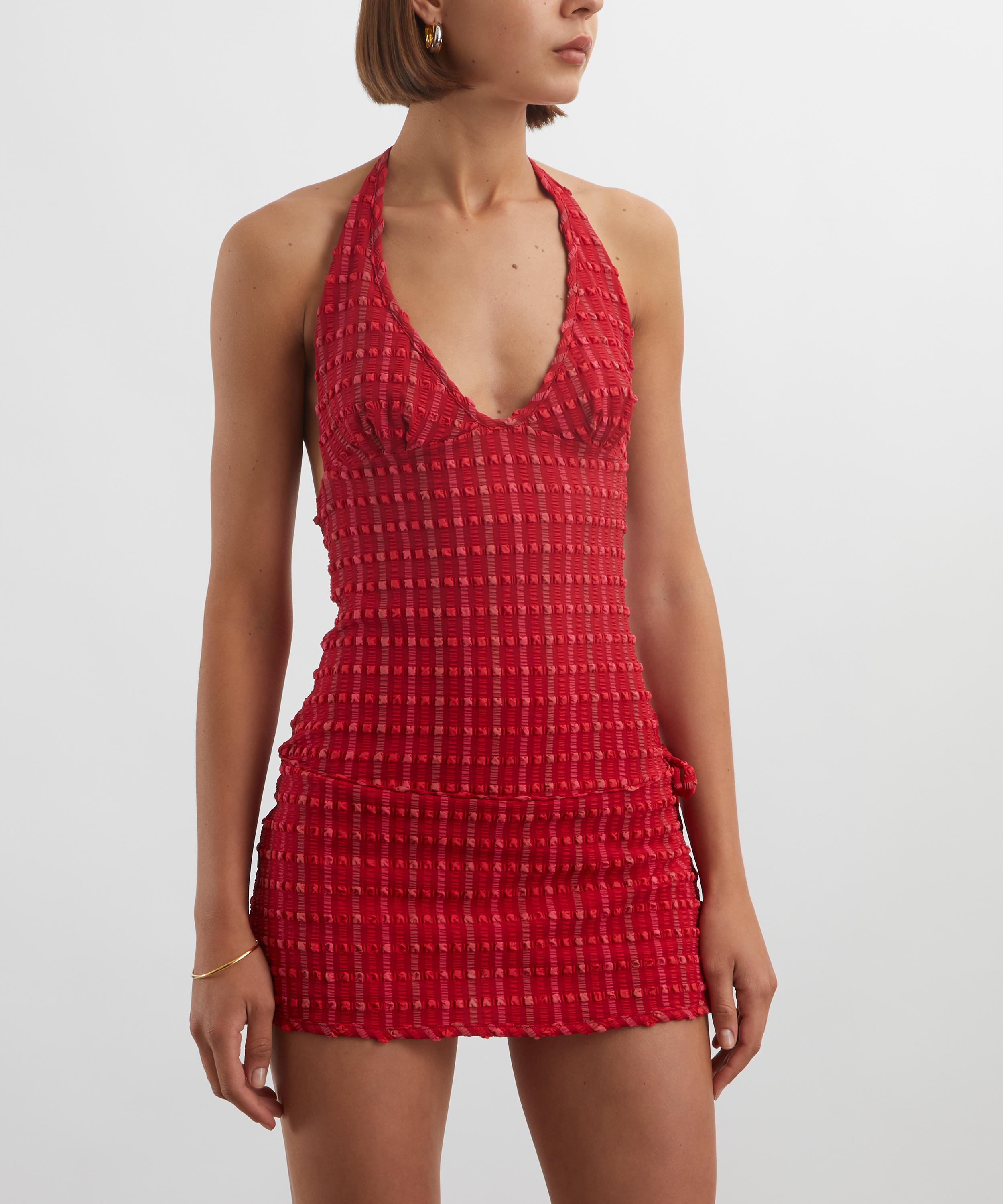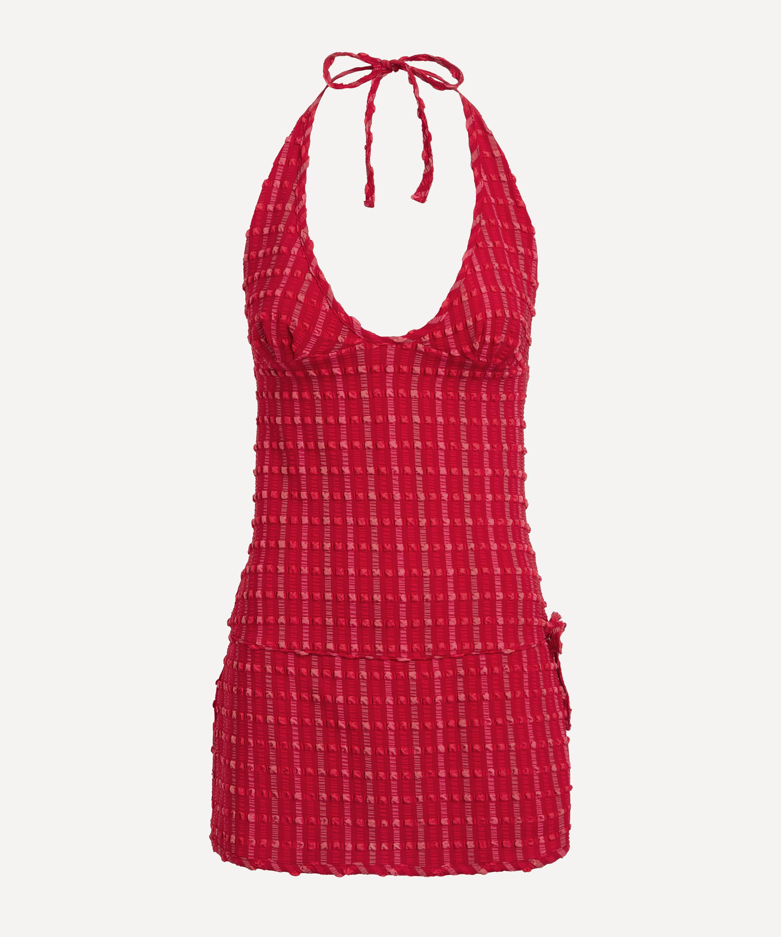 Crafted from soft, stretch gingham seersucker fabric that seamlessly sculpts the body, the Cindy Halter Skort Dress is a fitted style with a plunge neckline and an open back. Ultra-comfortable and chic, an adjustable neck tie ensures a customisable fit.