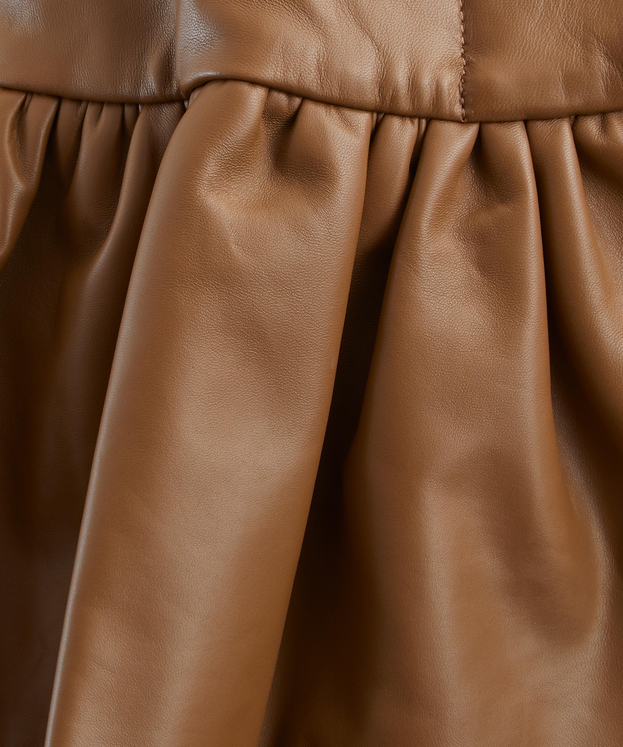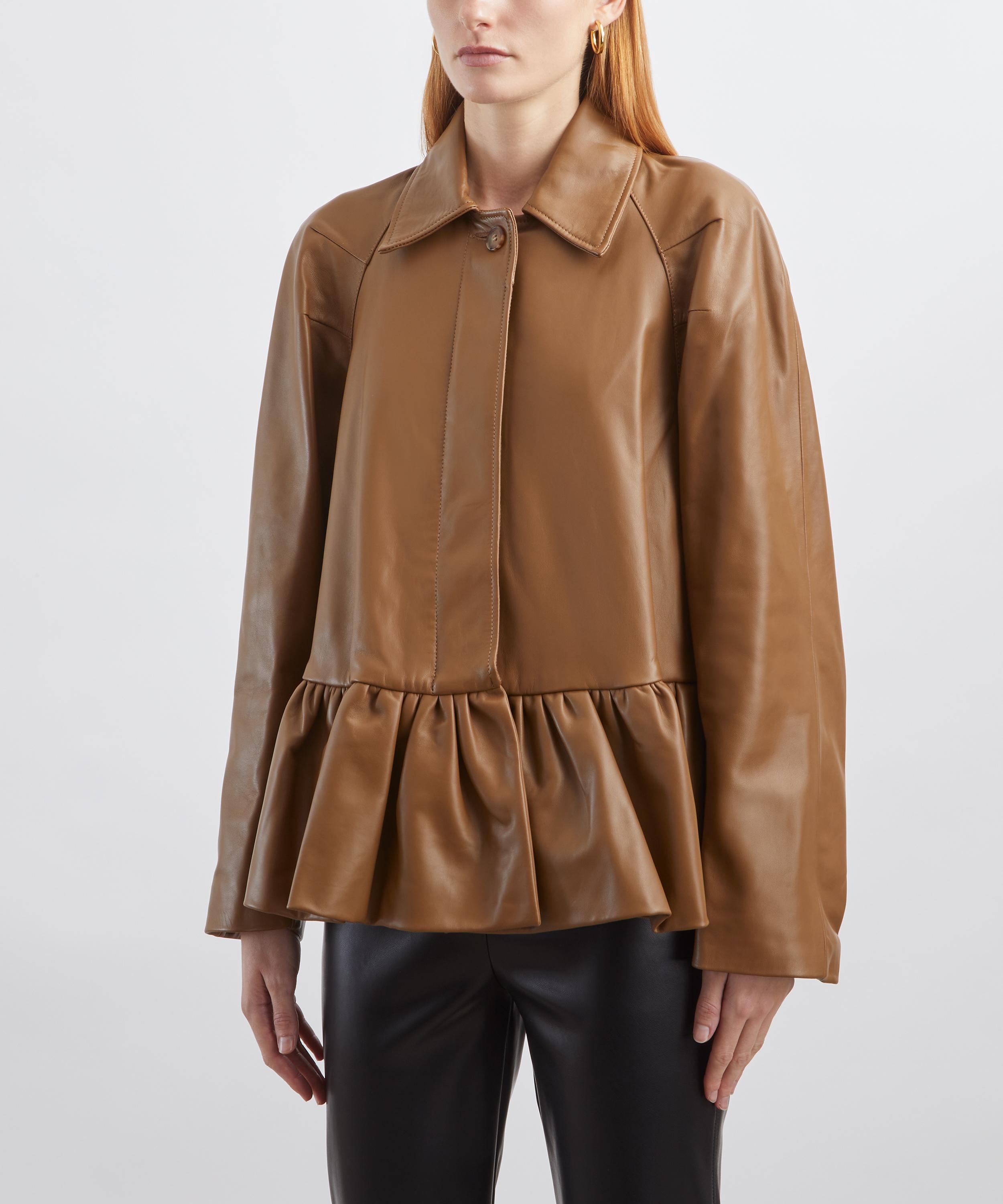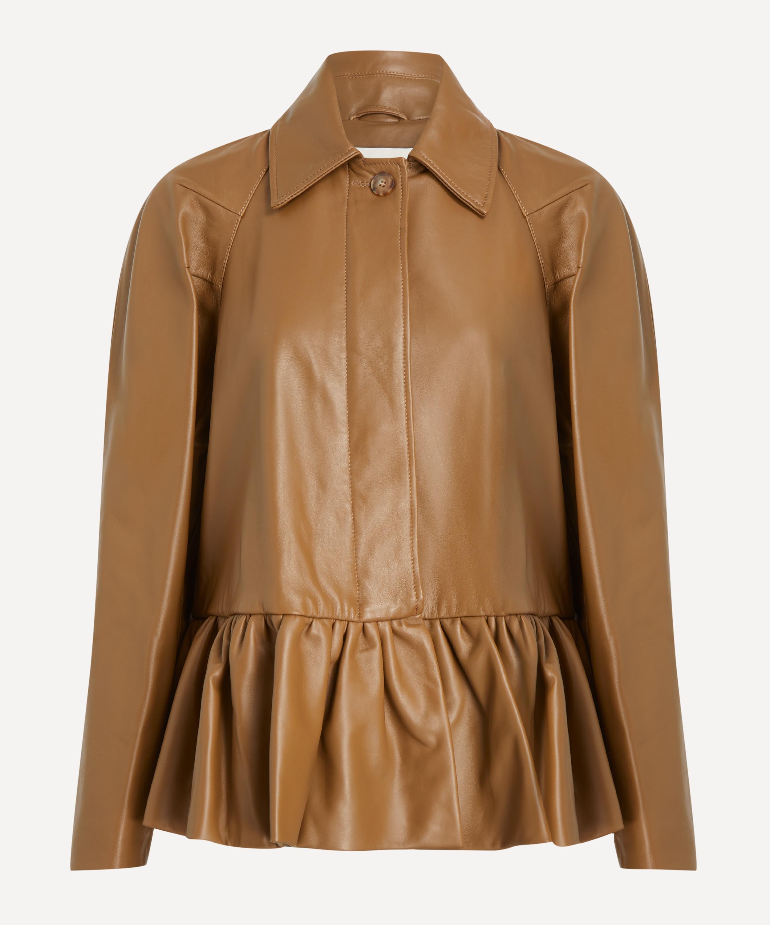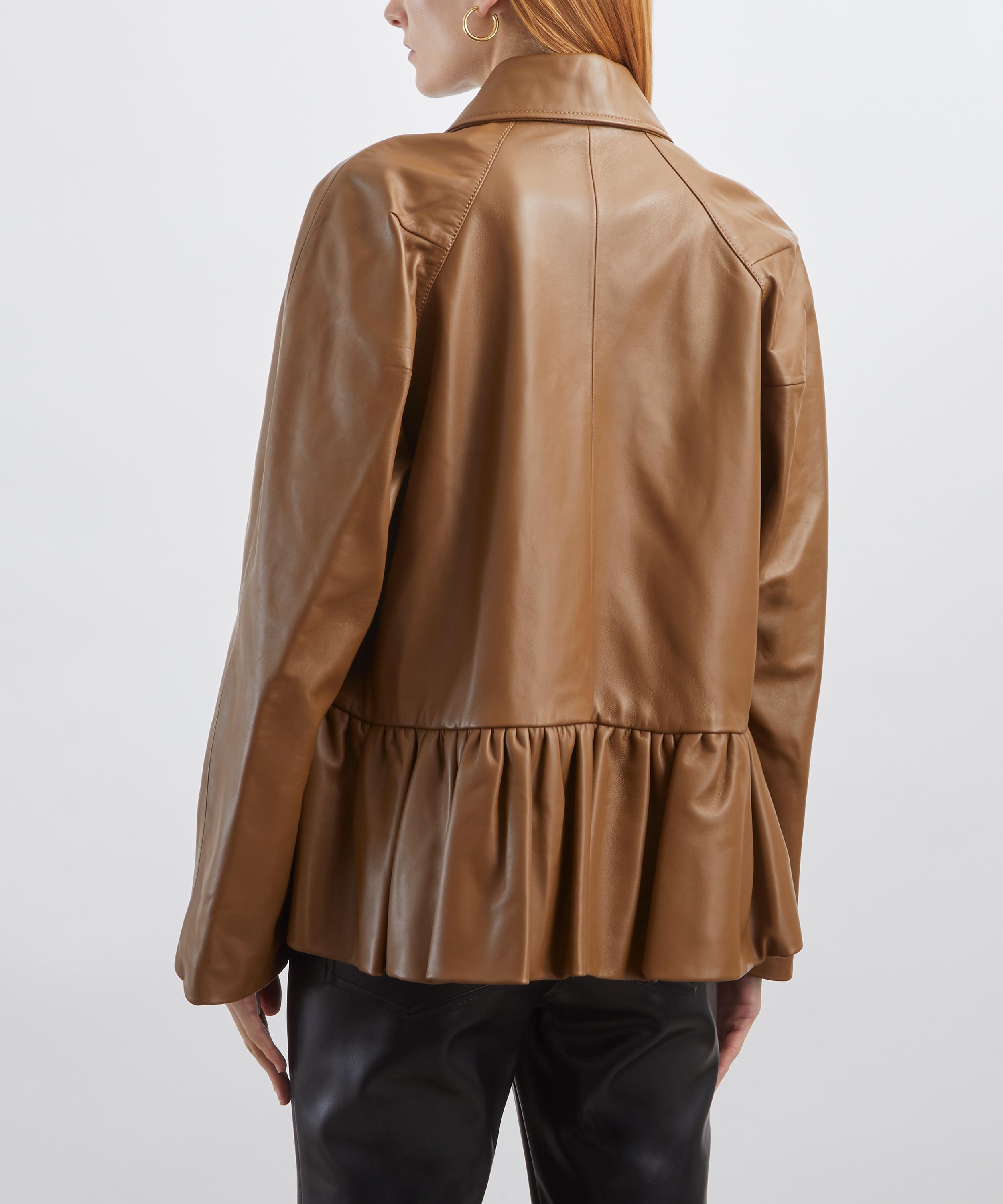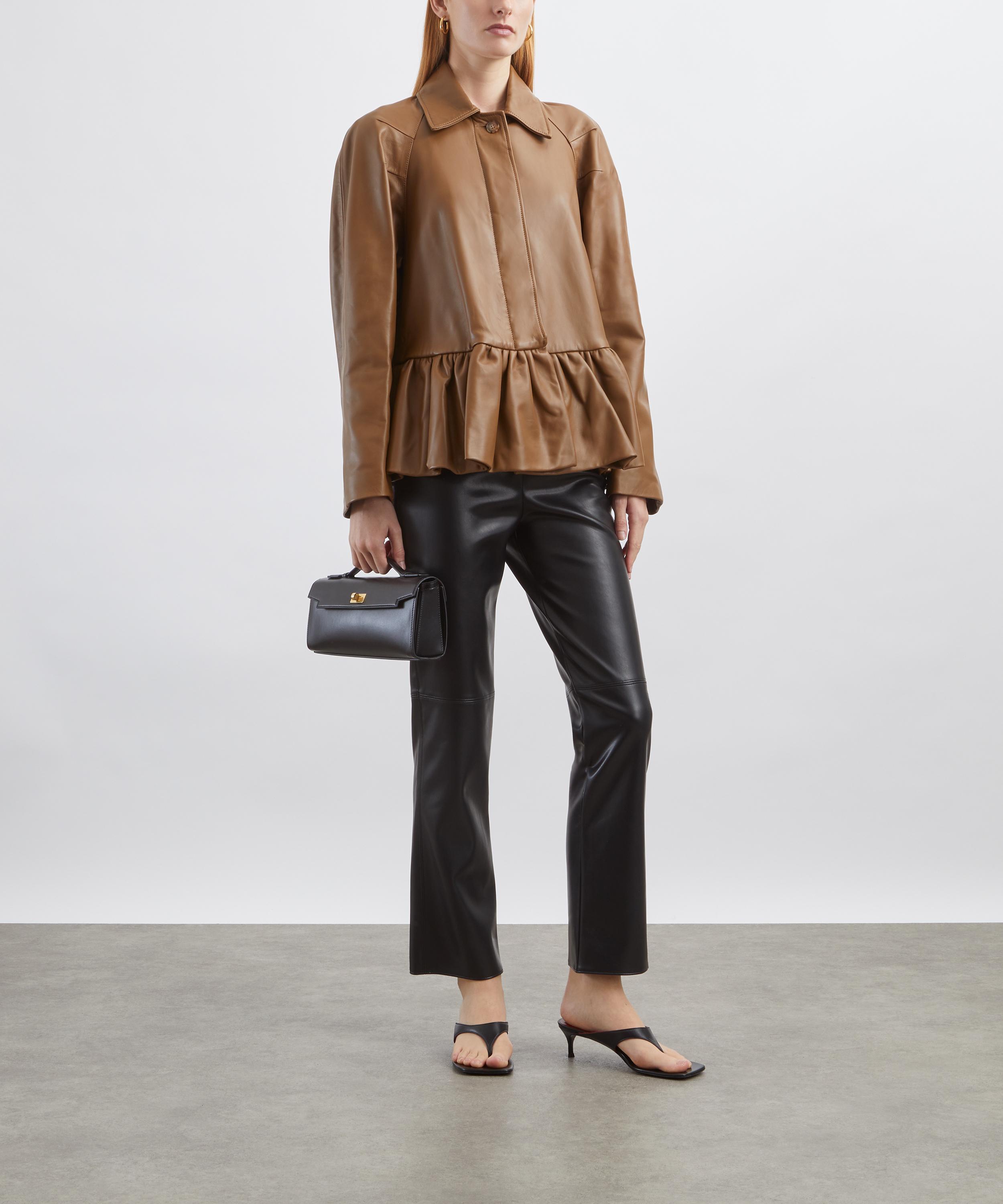 Expertly crafted from supple, buttery Nappa leather, the City jacket embodies modern elegance with its raglan sleeves, concealed button placket, and softly gathered peplum hem.