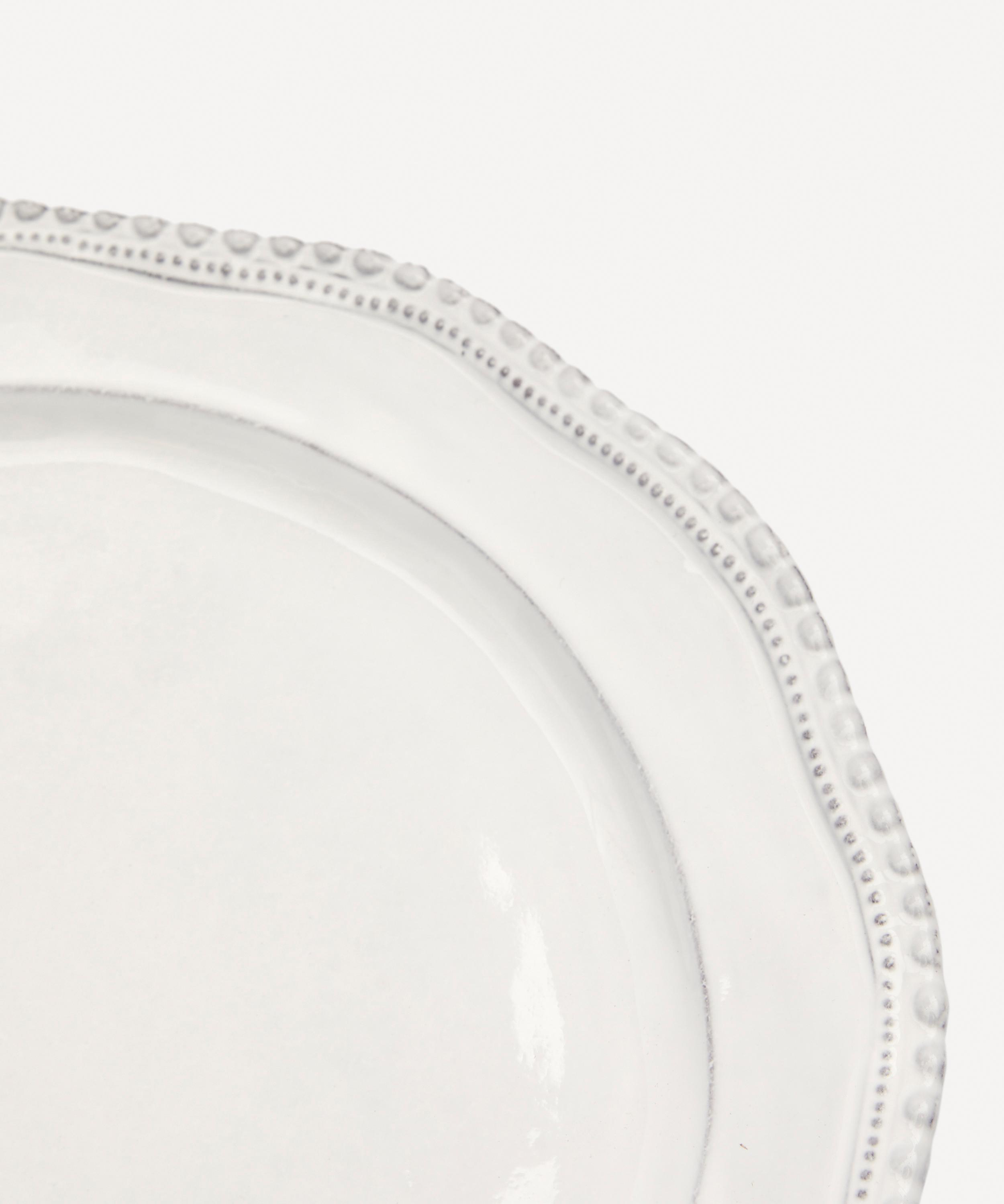 Votary of pre-industrial fabrication, Astier de Villatte is celebrated for being the one and only studio in Paris to hold and harbour the traditions of artisanal ceramic production. Restoring the ancestral systems of moulding and stamping, the Clarabelle long platter is made using handcrafting techniques from the Middle Ages which involve moulding a handmade sheet of clay, double firing the ‘biscuit’ piece and glazing the product in white enamel – a lengthy process that requires a drying time of up to one month. Characterised by a dotted rim, the platter is engraved with the brand’s signature crest - depicting an interlacing A & V - alongside the initials of one of the 40 master artisans who created the glazed platter. Each handmade piece tells a beautiful story, it romances and imparts a sense of nostalgia into its owner. Arrange with other serveware in the collection to breathe an air of authenticity into your table setting.