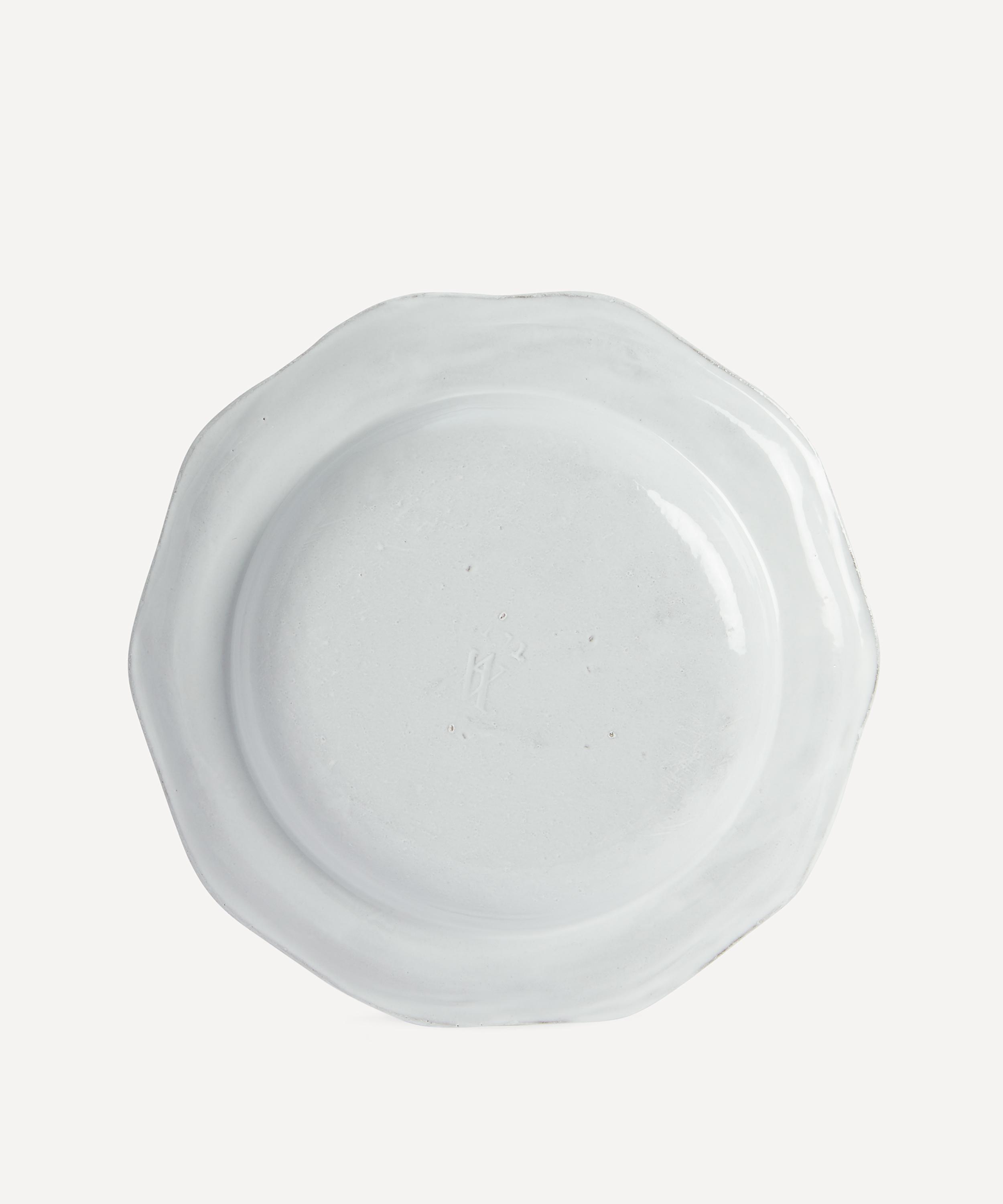 Votary of pre-industrial fabrication, Astier de Villatte is celebrated for being the one and only studio in Paris to hold and harbour the traditions of artisanal ceramic production. Restoring the ancestral systems of moulding and stamping, this plate is made using handcrafting techniques from the Middle Ages which involve moulding a handmade sheet of clay, double firing the ‘biscuit’ piece and glazing the product in white enamel – a lengthy process that involves a drying time of up to one month. Characterised by a detailed design to the rim, this plate is engraved with the brand’s signature crest - depicting an interlacing A & V - alongside the initials of one of the 40 master artisans who created it. Each handmade piece tells a beautiful story, it romances and imparts a sense of nostalgia into its owner. Arrange with other glazed bowls and plates in the collection to breathe an air of authenticity into your tablescape.