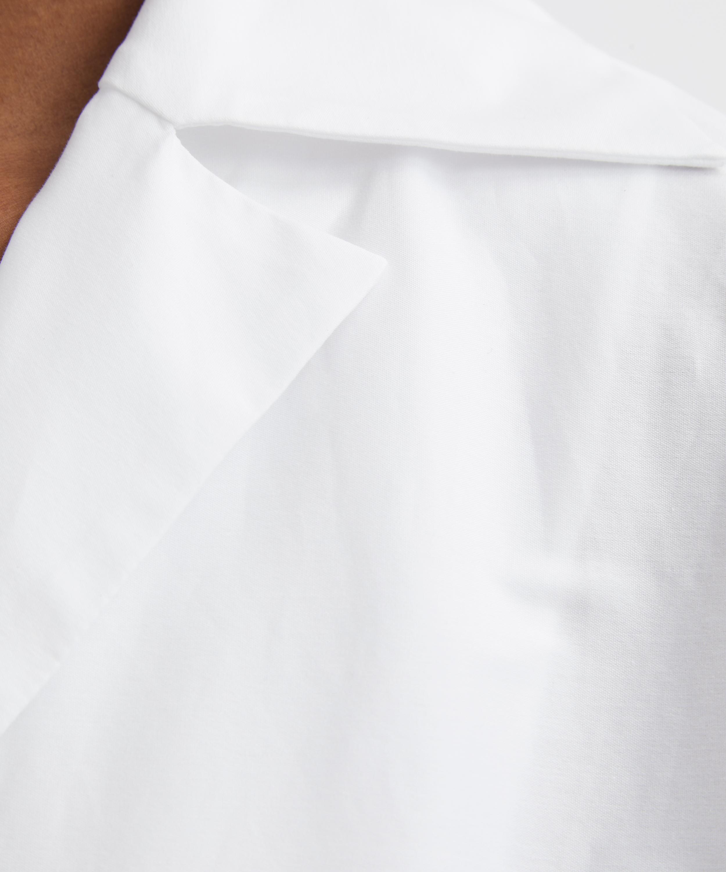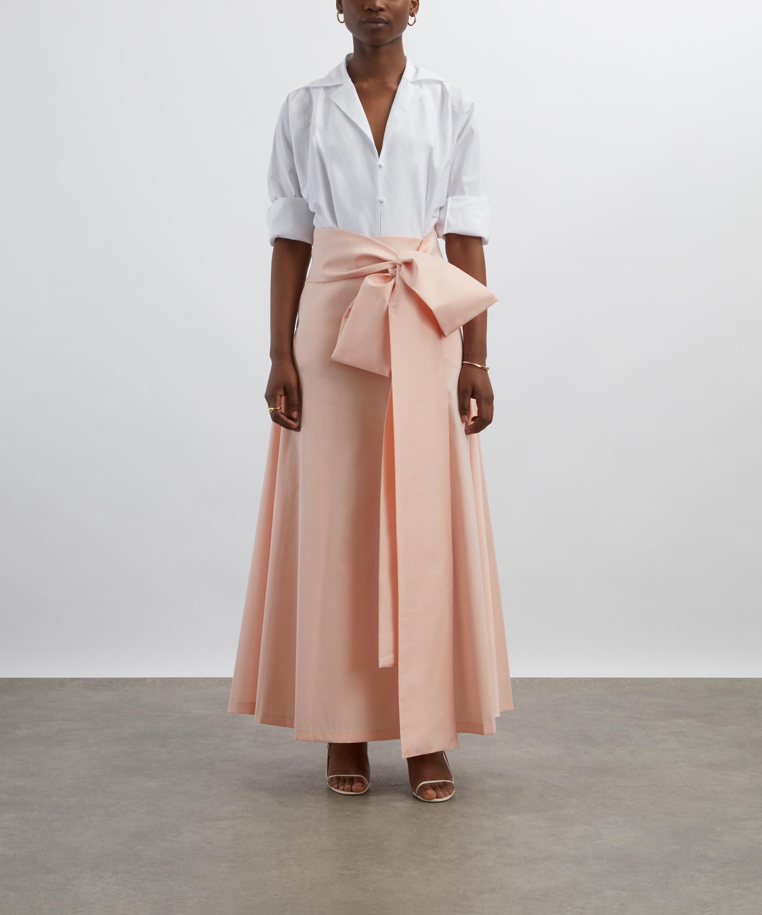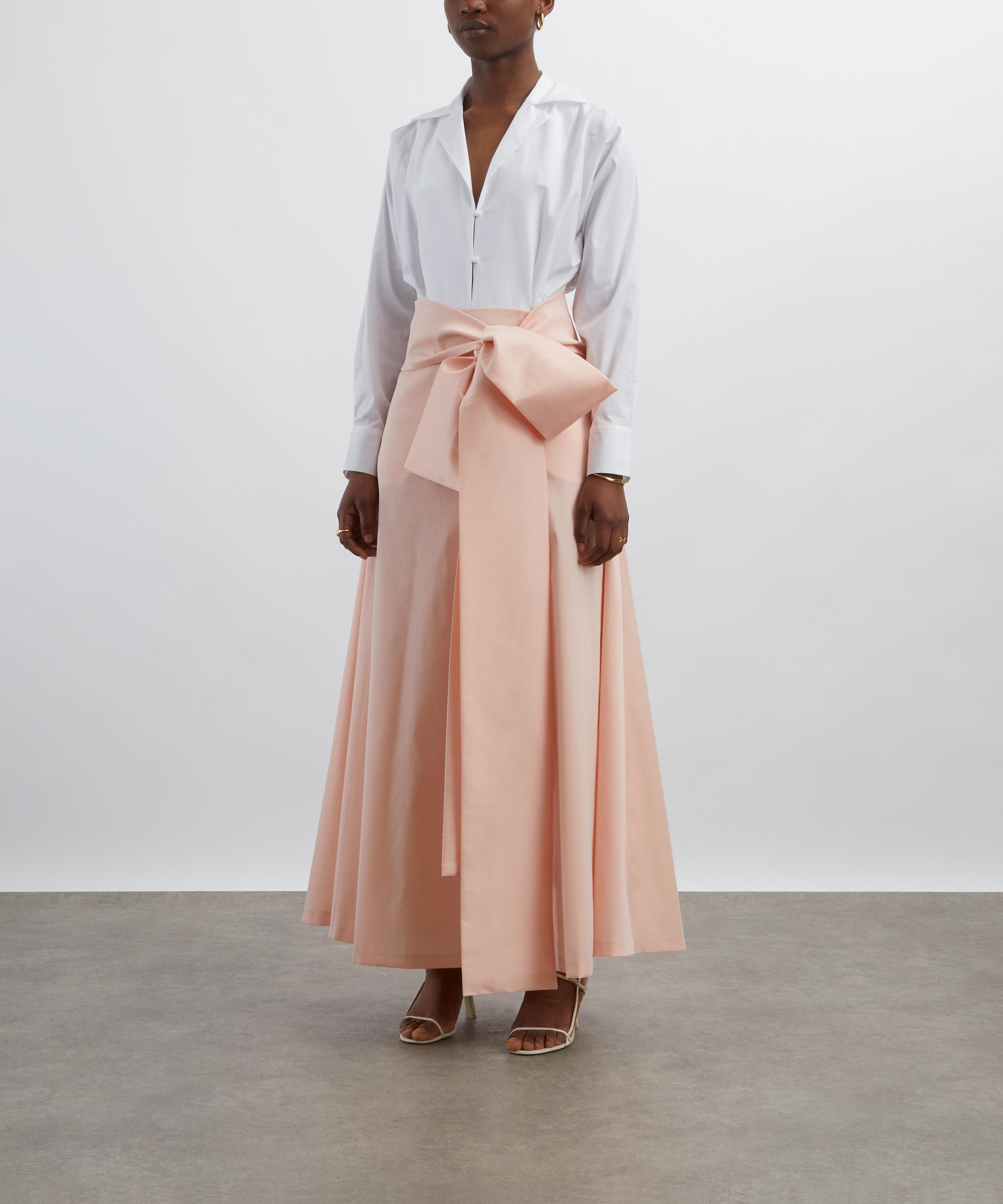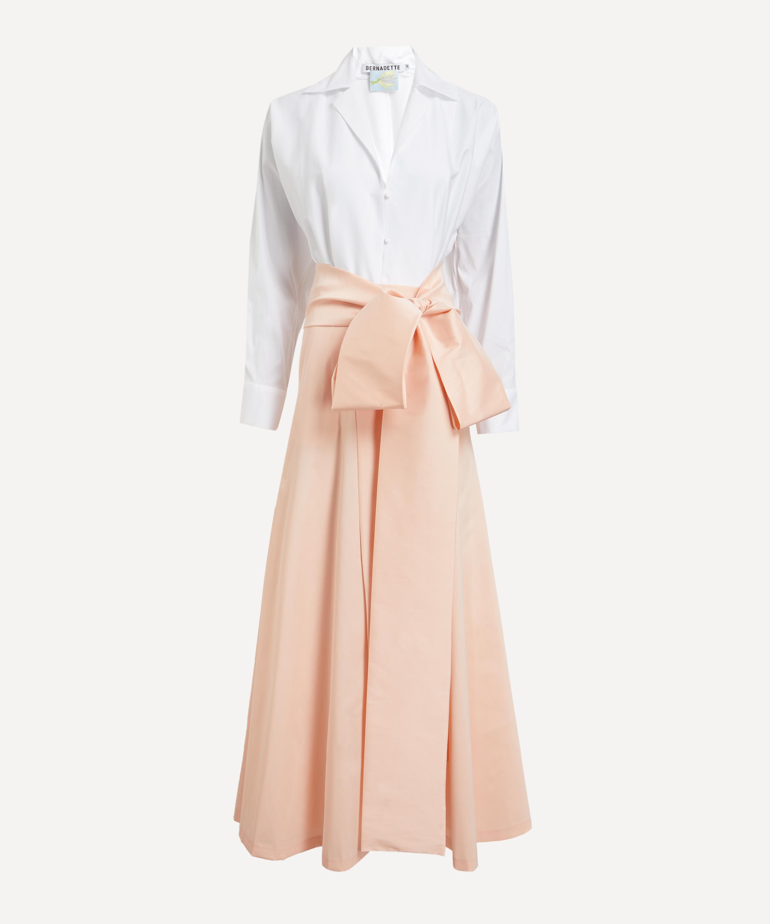 Blending crisp cotton with the luxurious texture of embossed taffeta, this two-in-one design pairs a classic button-down shirt with a flowing skirt, elegantly finished with BERNADETTE’s signature taffeta bow.