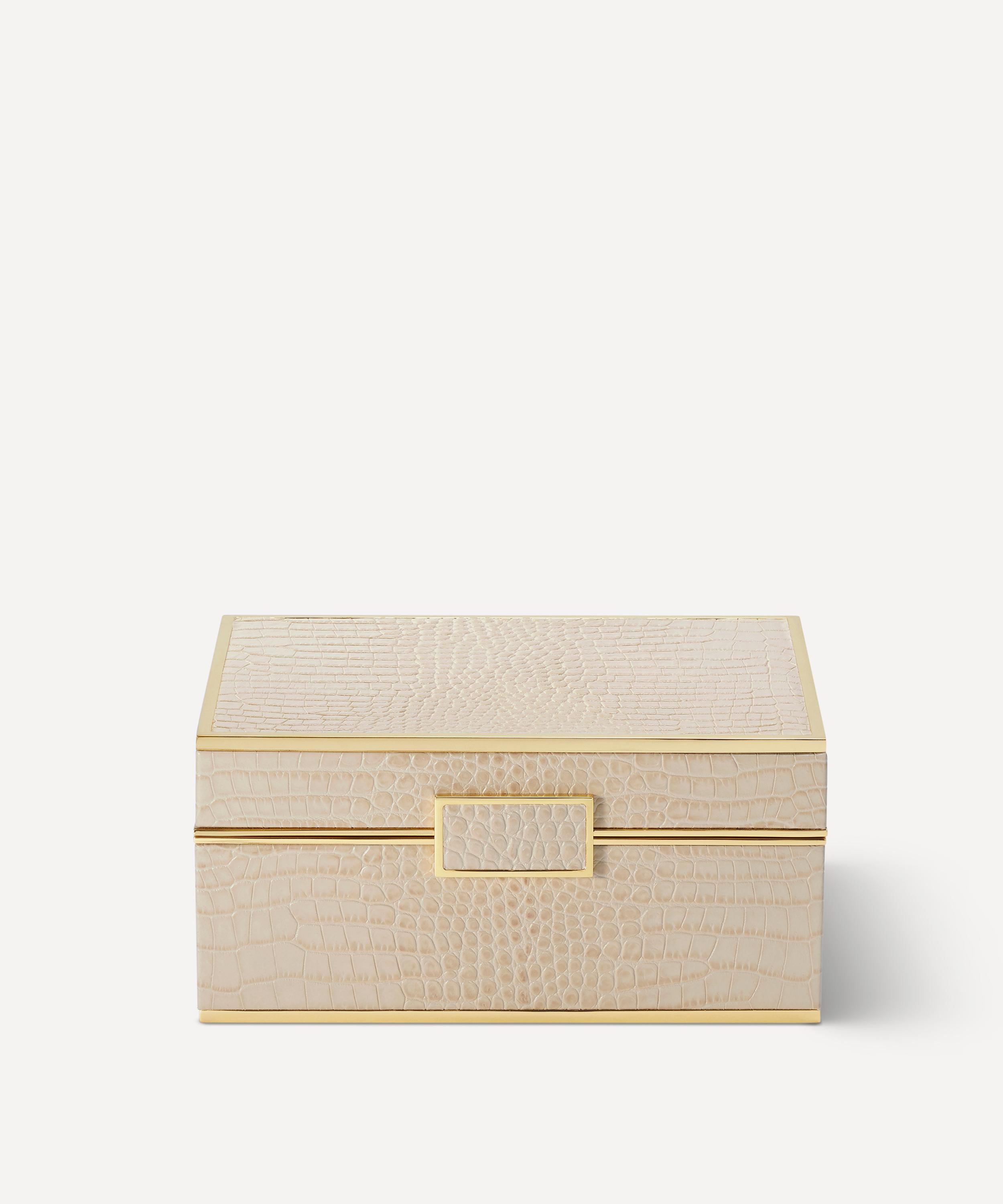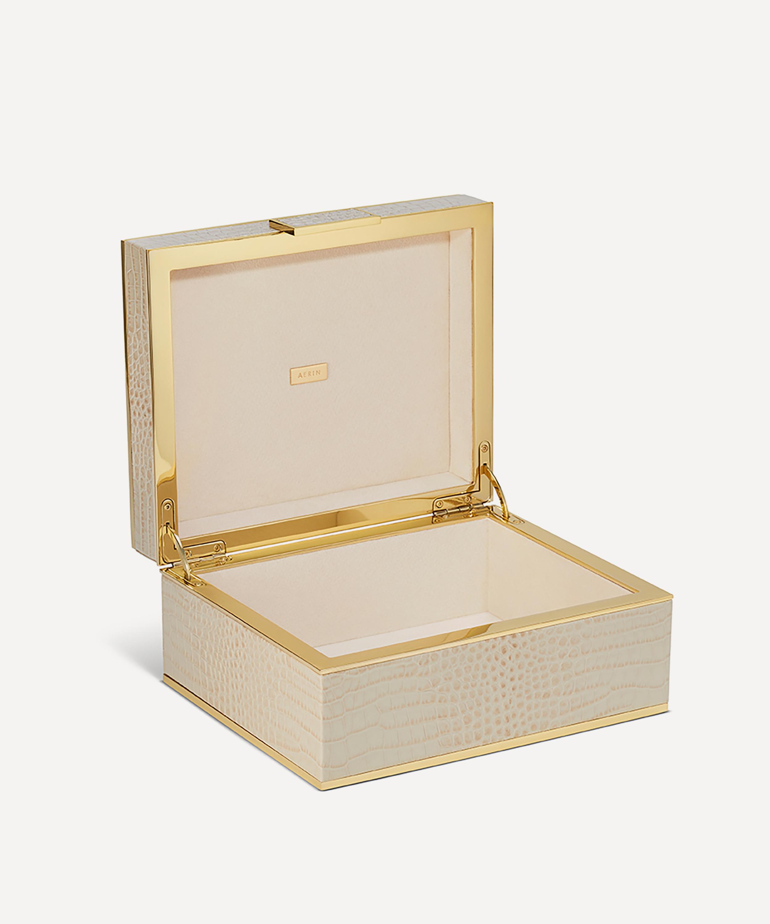 The jewellery box is meticulously crafted from buttery, croc-embossed Italian leather and trimmed with brass edges for an elevated feel. A sophisticated twist on a classic vanity box, it opens to reveal a micro-suede lining and boasts enough space to keep your all-important smaller items safe and secure. Place it on a bookshelf, tabletop or desk for maximum impact.