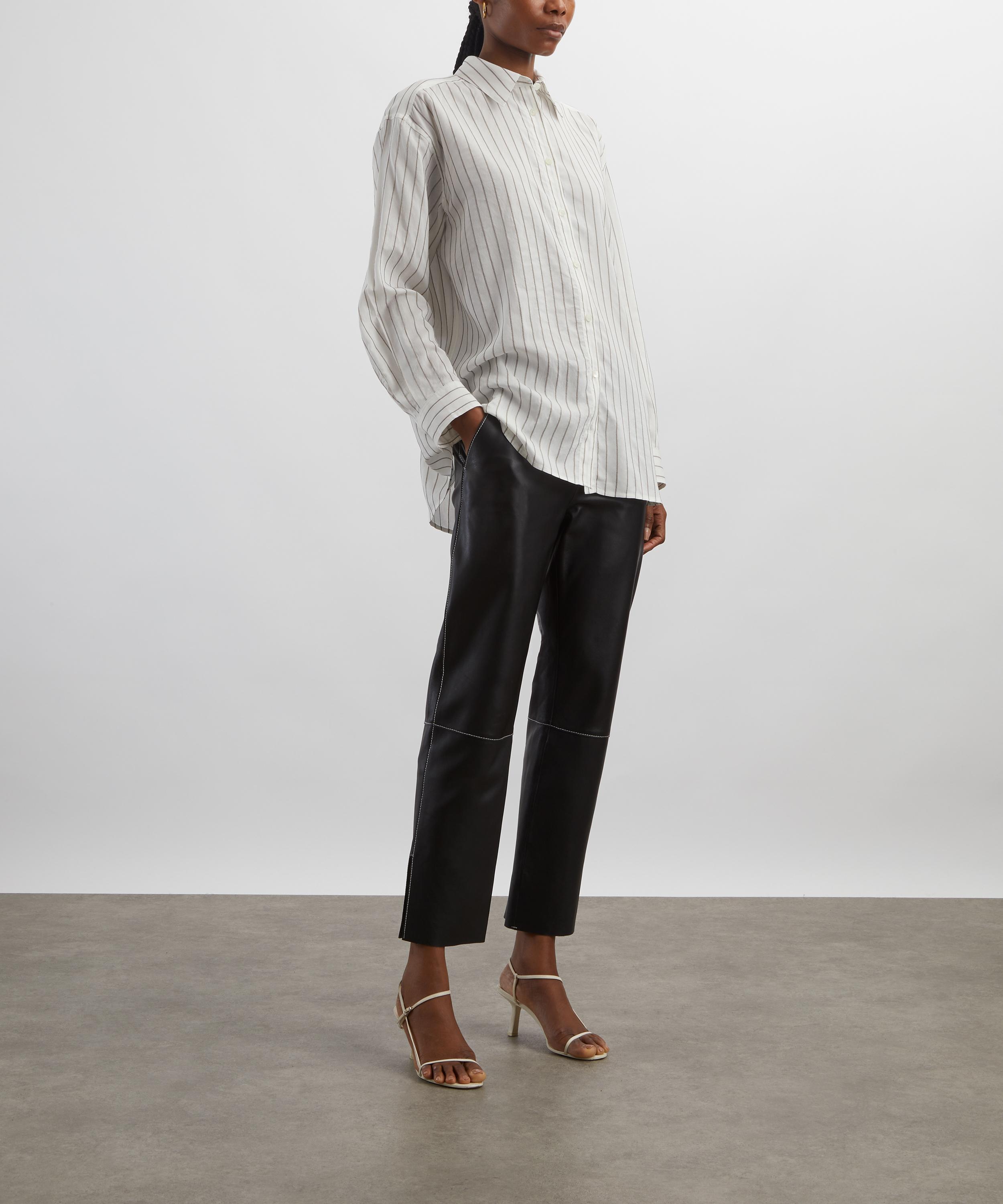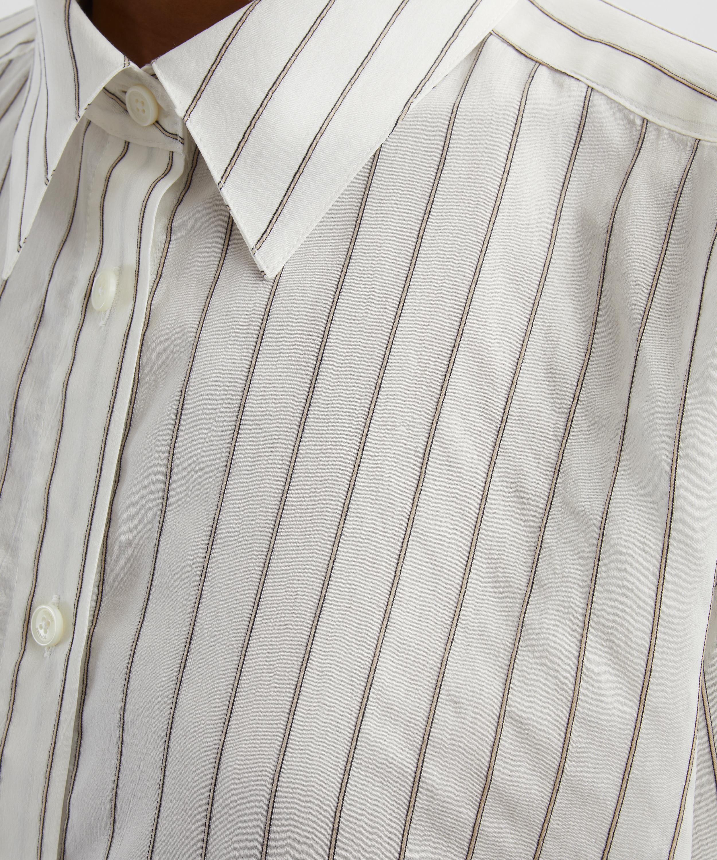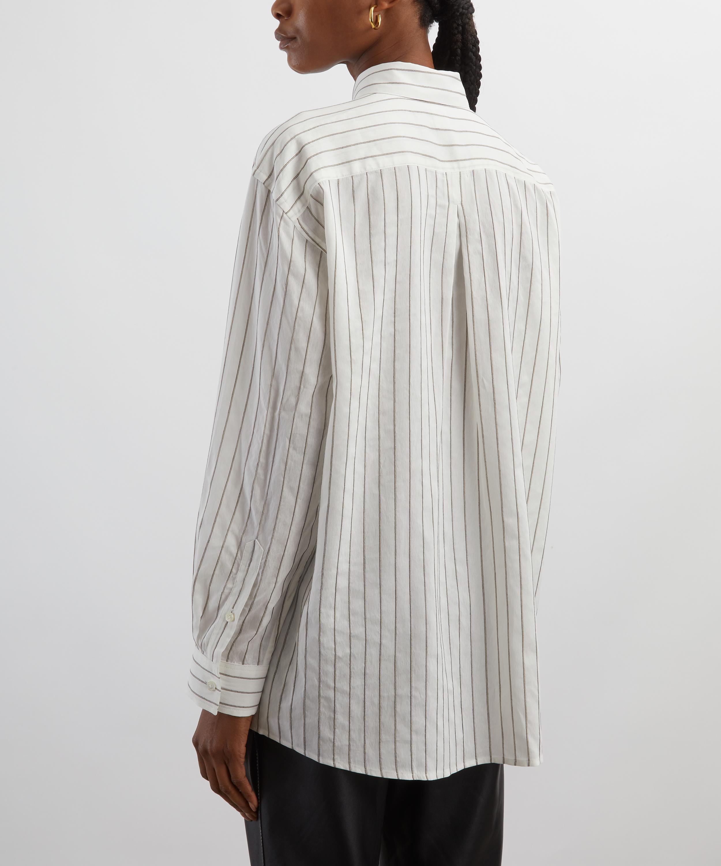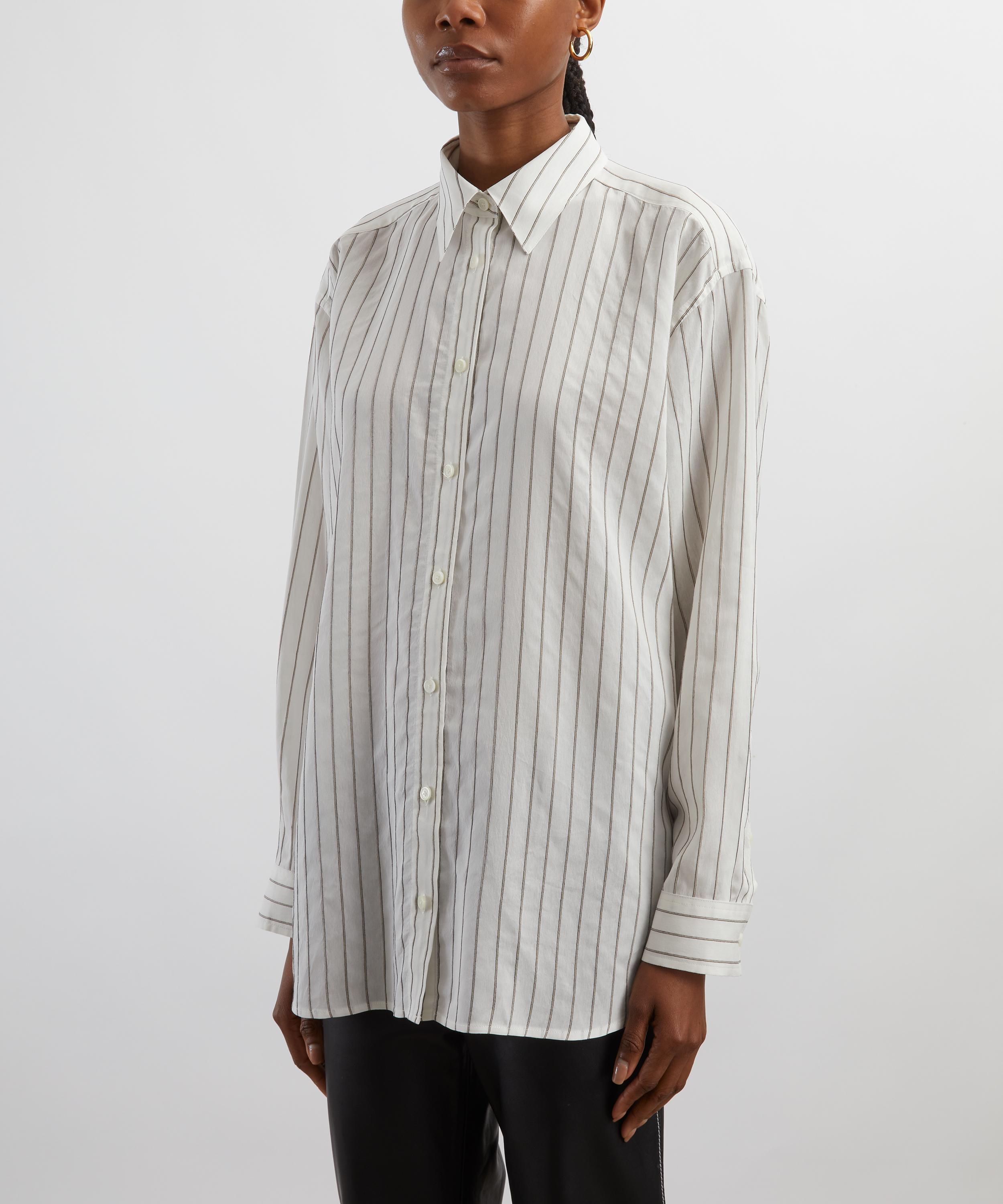Made from a light and fresh viscose-silk blend, this striped shirt is animated with fine stripes in oyster-white and black hues. Its longline, oversized silhouette, defined by dropped shoulders, a buttoned placket, and cuffs, exudes relaxed sophistication.