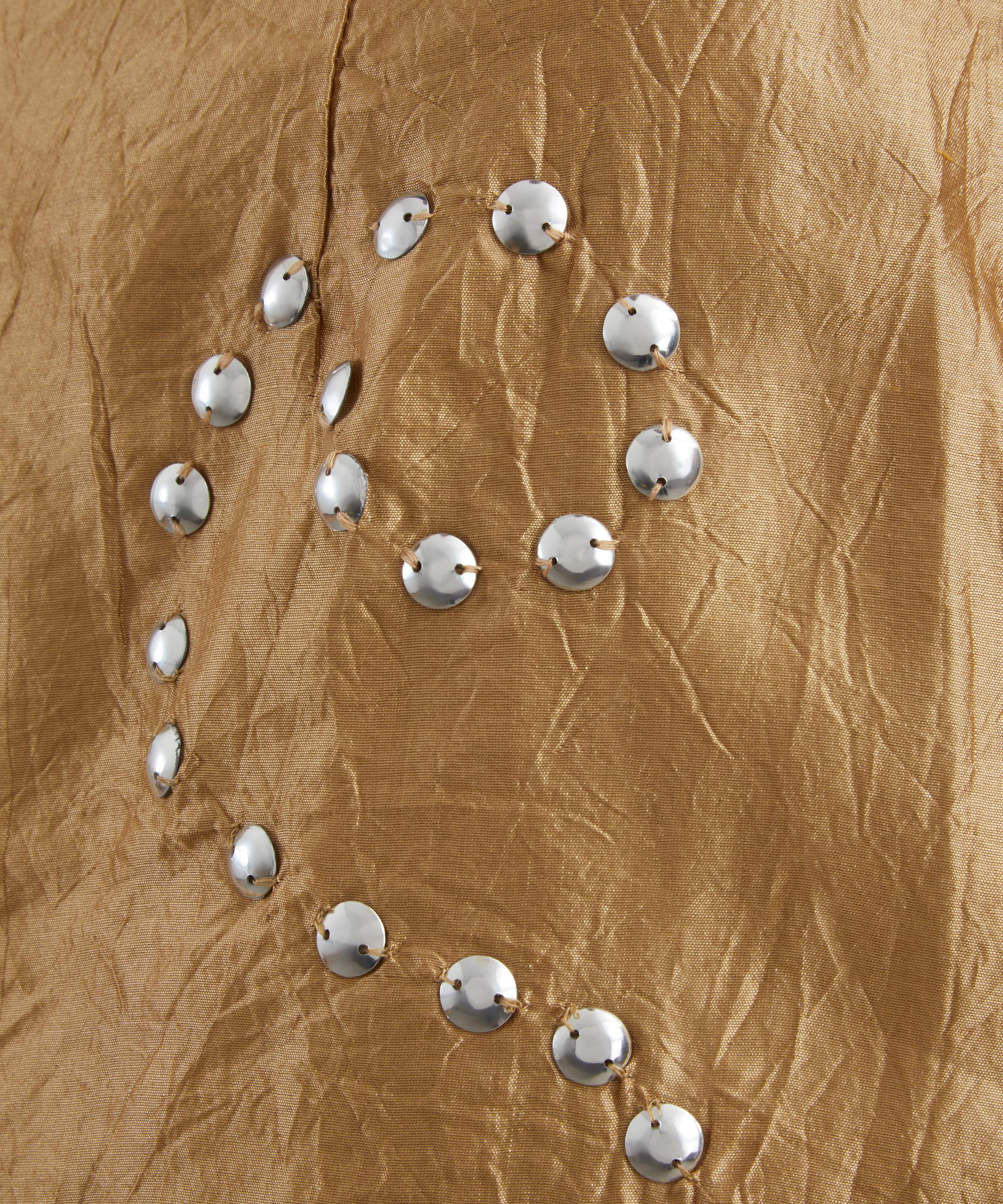 Crafted from golden hand-dyed silk, this mini skirt features an elegant A-line silhouette embellished with silver crystal studs in decorative floral motifs.