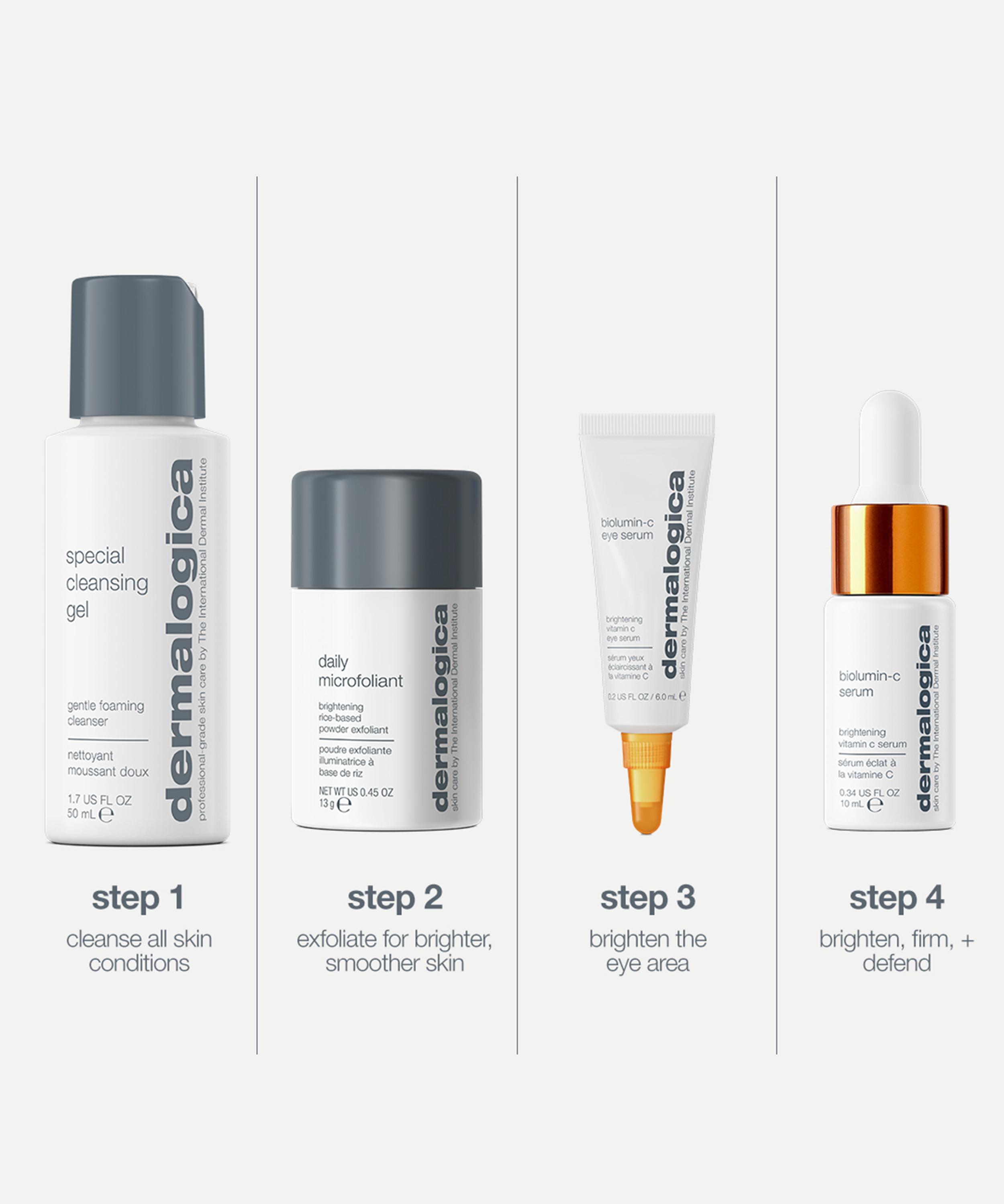 - Cleanse and Brighten includes: Special Cleansing Gel 50ml, Daily Microfoliant 14g, Biolumin-C Eye Serum 10ml and Biolumin-C Serum 6ml