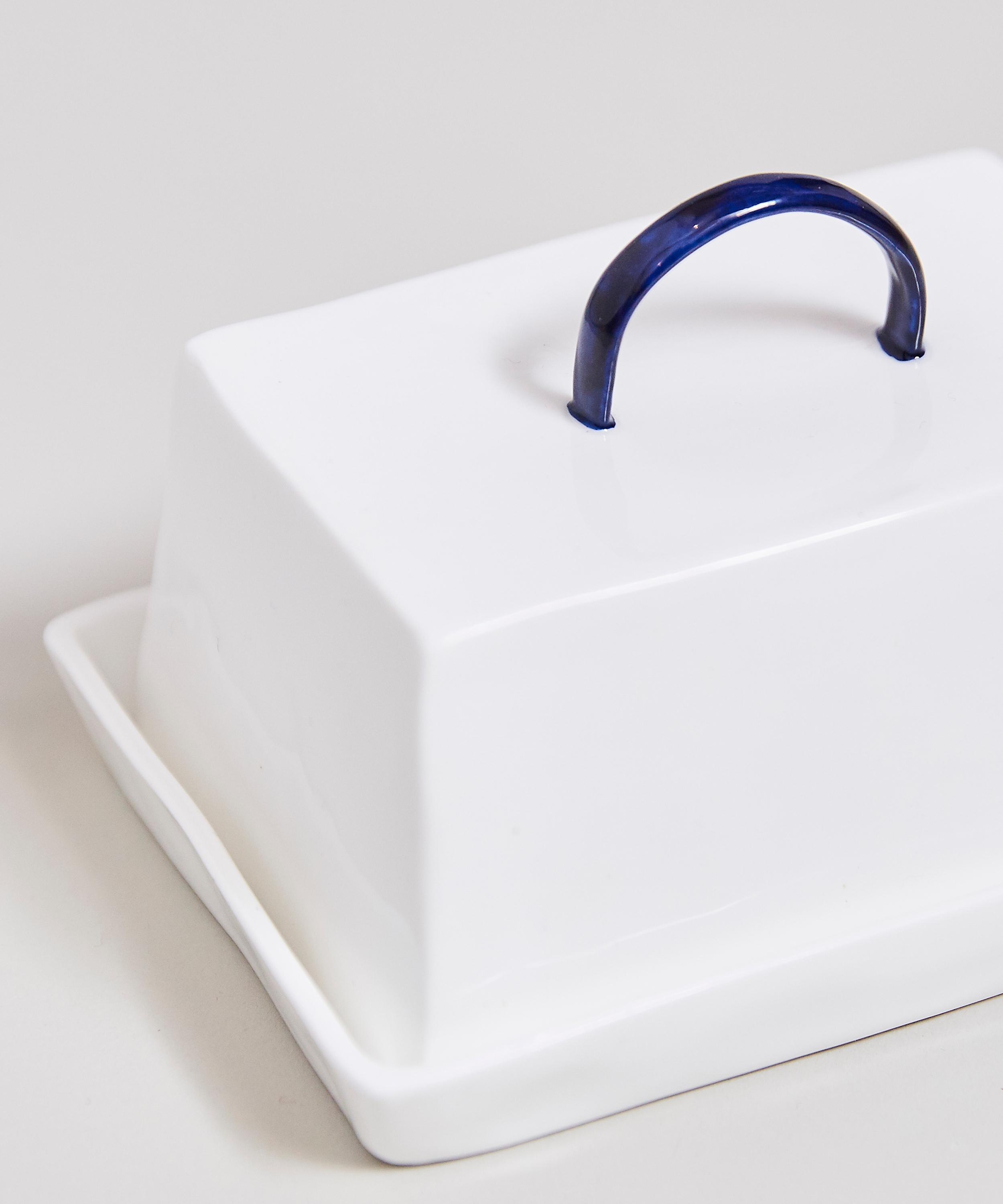 Handcrafted in the Feldspar studios from a durable fine bone china, this classic butter dish features a curved top handle and the brand’s signature dimpled profile – complete with hand-painted deep cobalt blue detailing, echoing the palette of traditional chinaware.