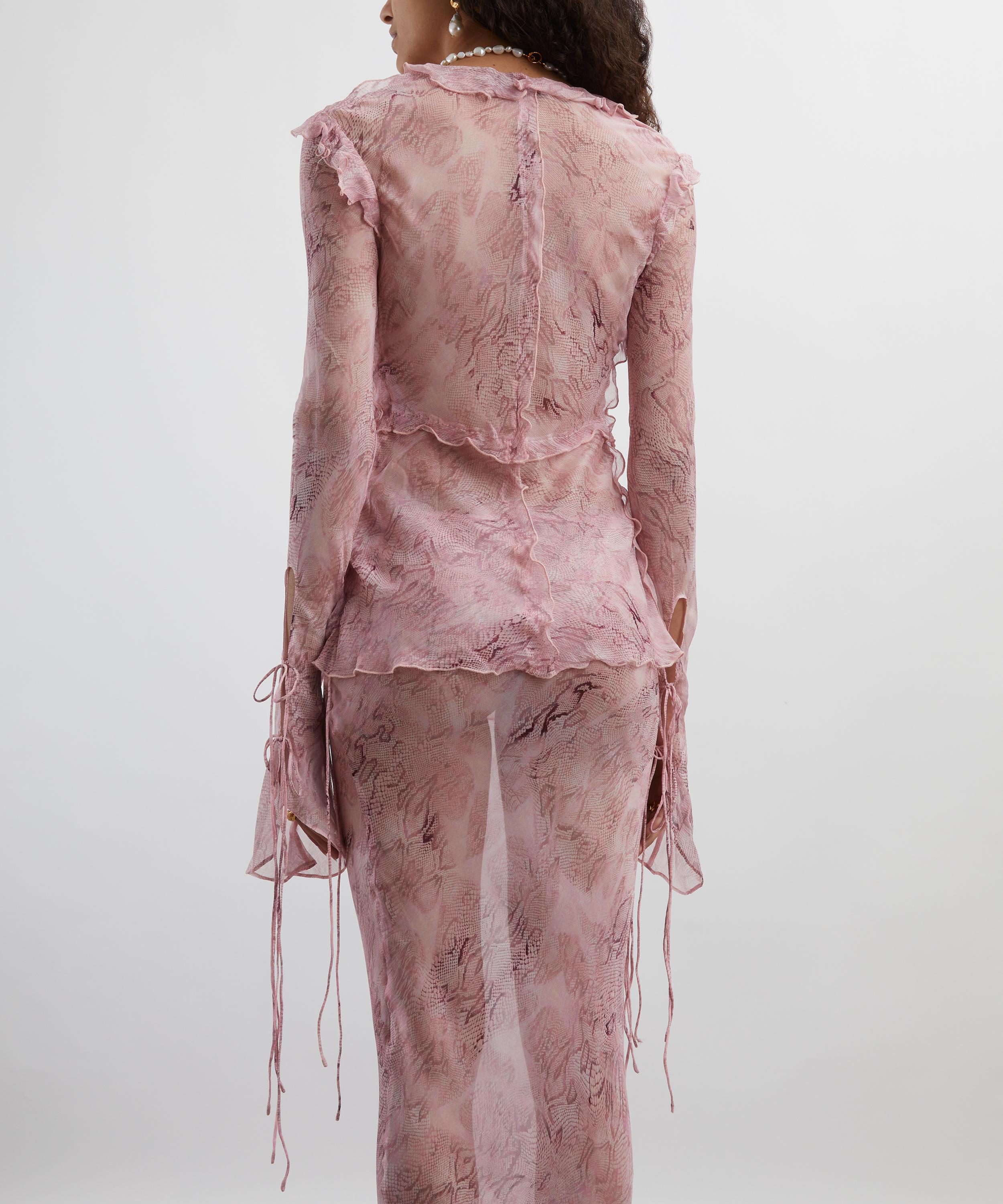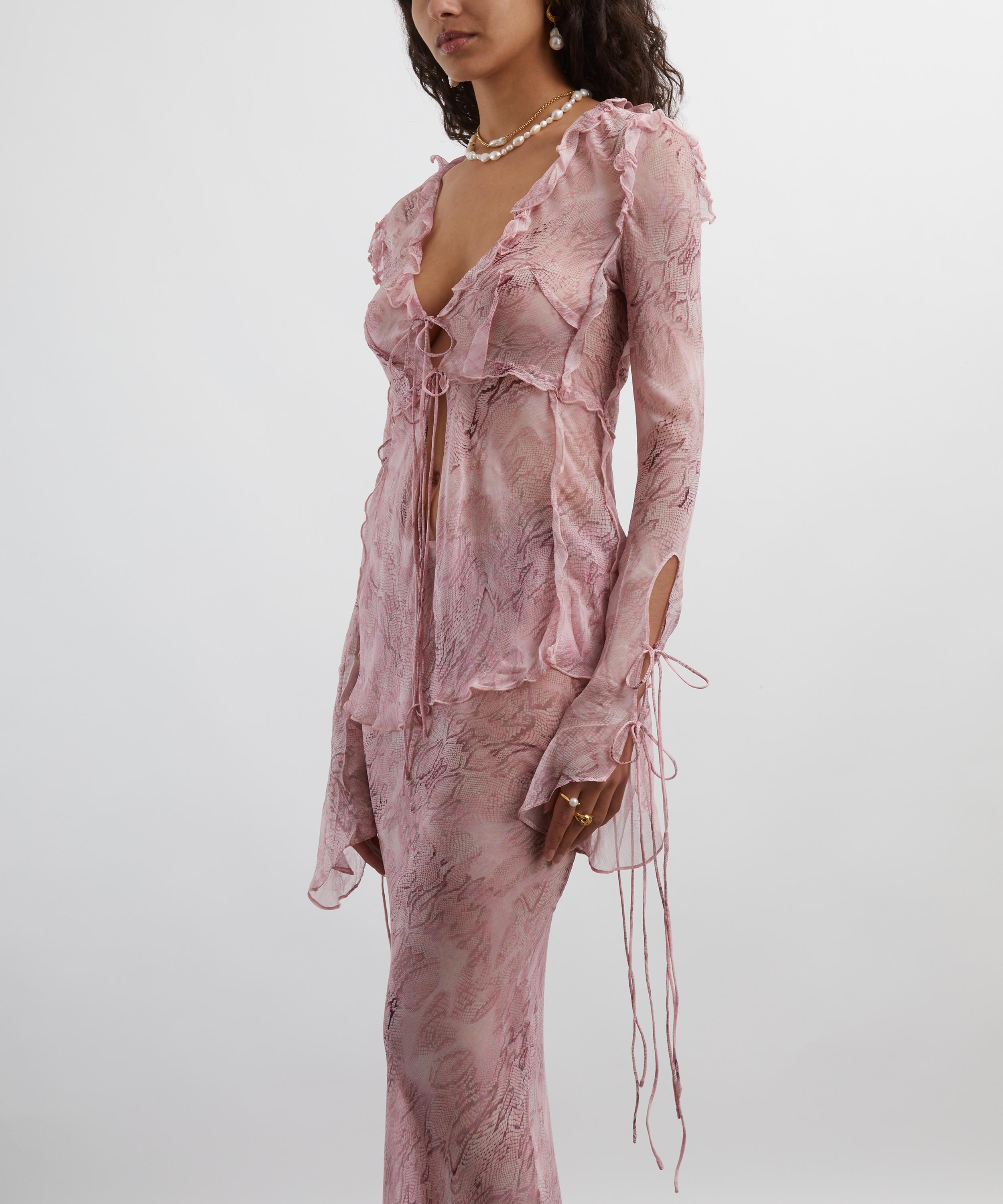 Crafted from crinkle viscose chiffon and emblazoned with a striking pink snake print, this ruffled blouse exudes sophistication with its plunging V-neckline, delicate tie details, and elegantly trailing extra-long cuffs.