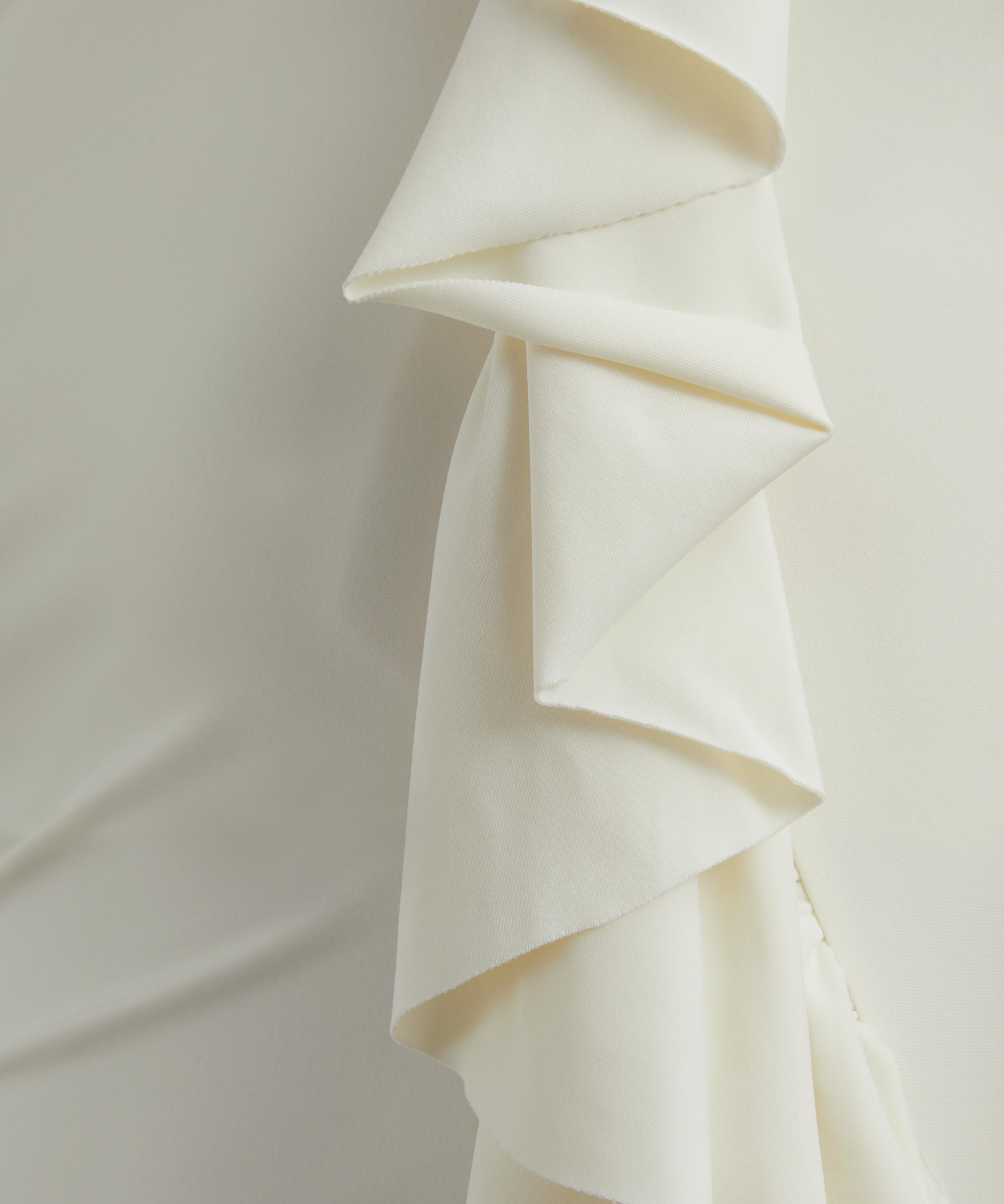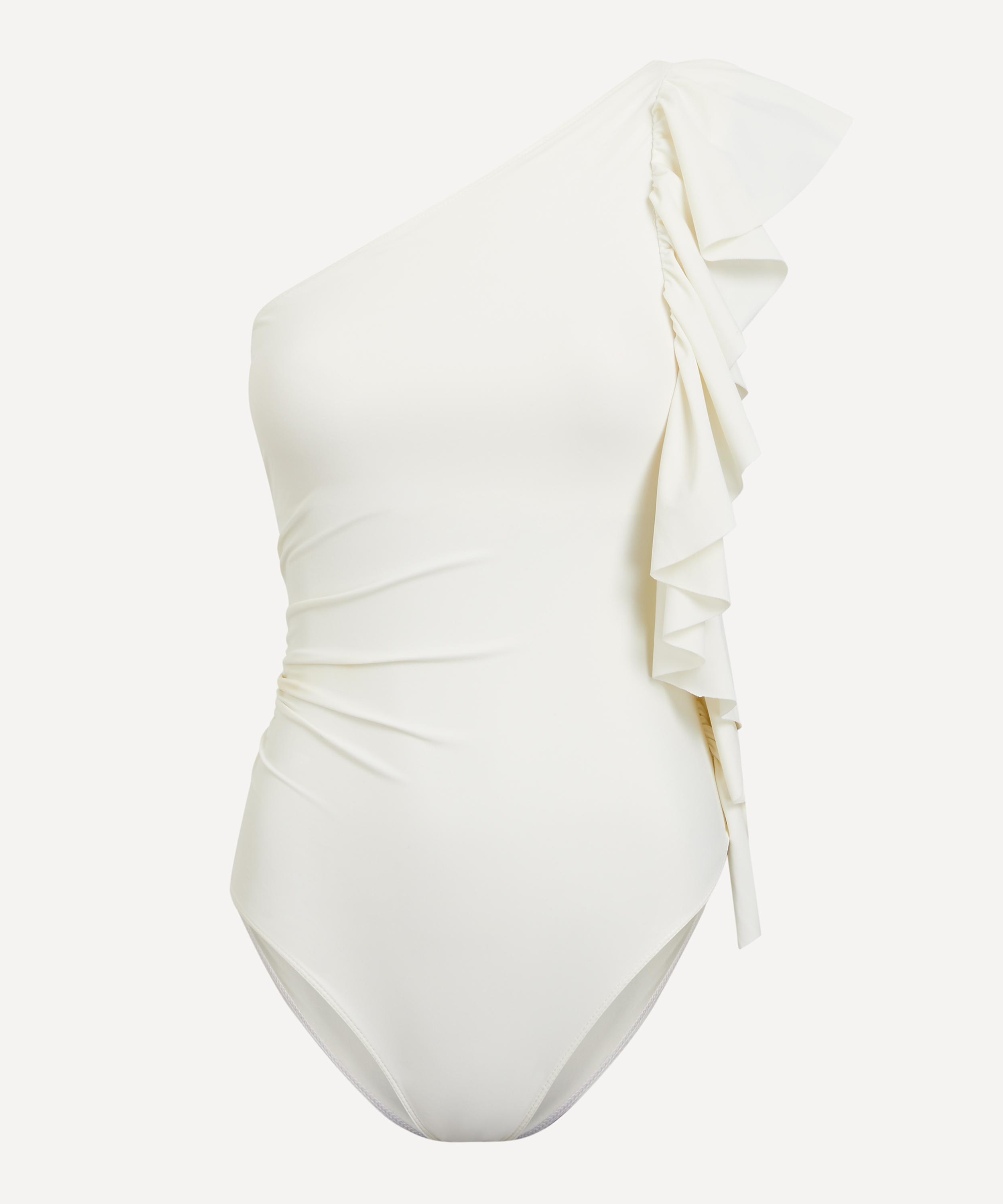 Elegant and easy to wear, it features clean lines and a one shoulder silhouette embellished with ruffled, tiered detailing for effortless styling, finished with a muted cream colourway.