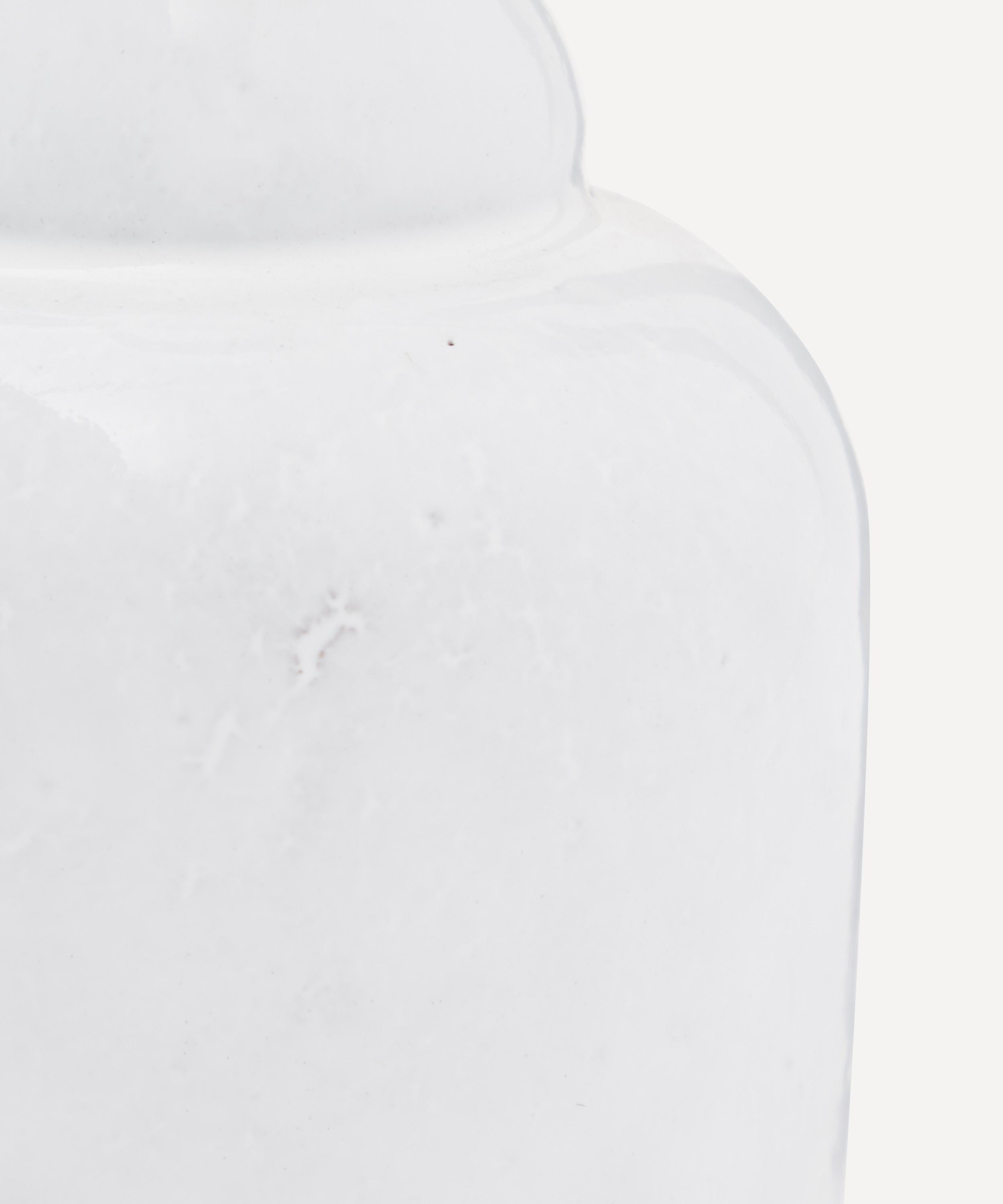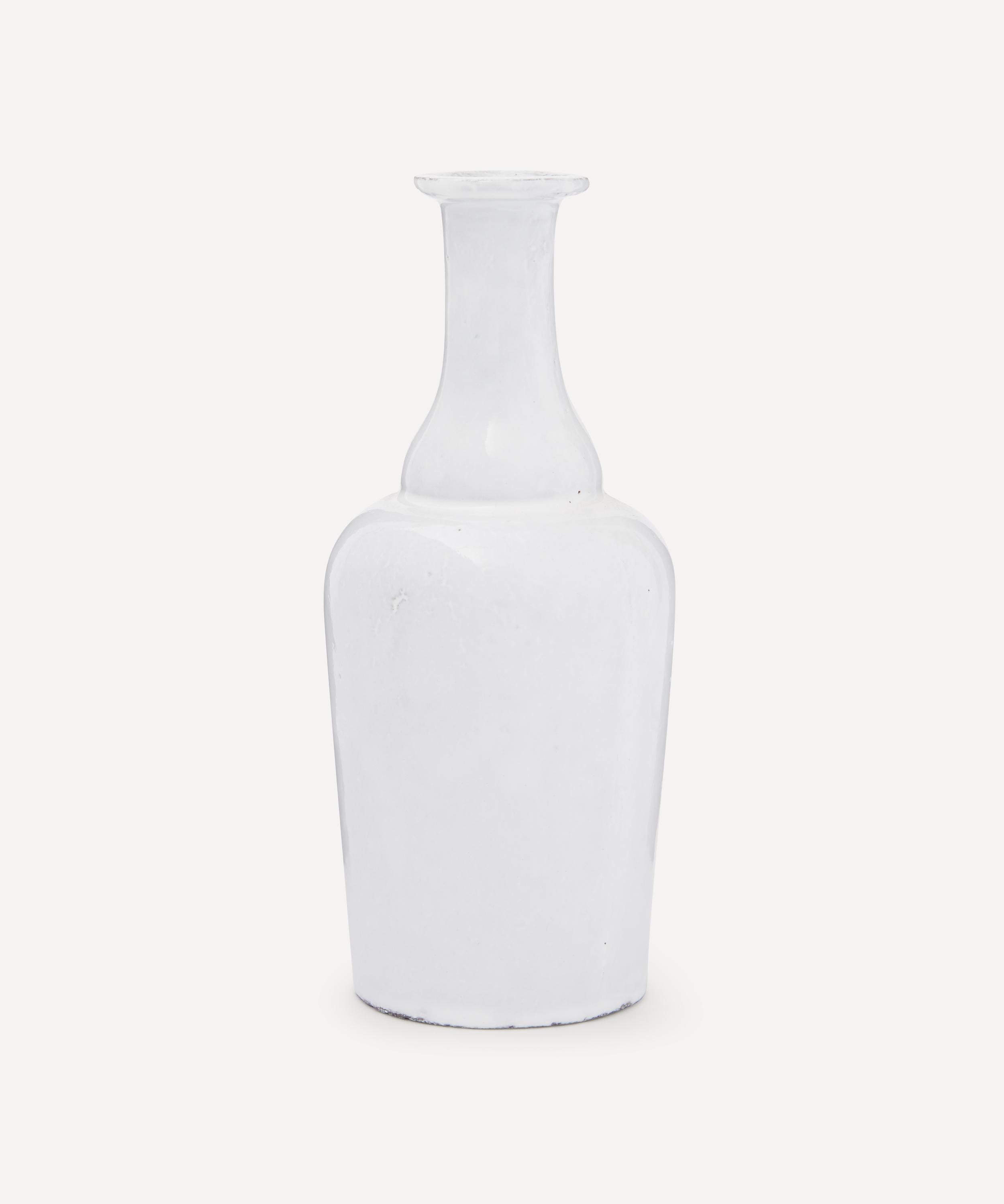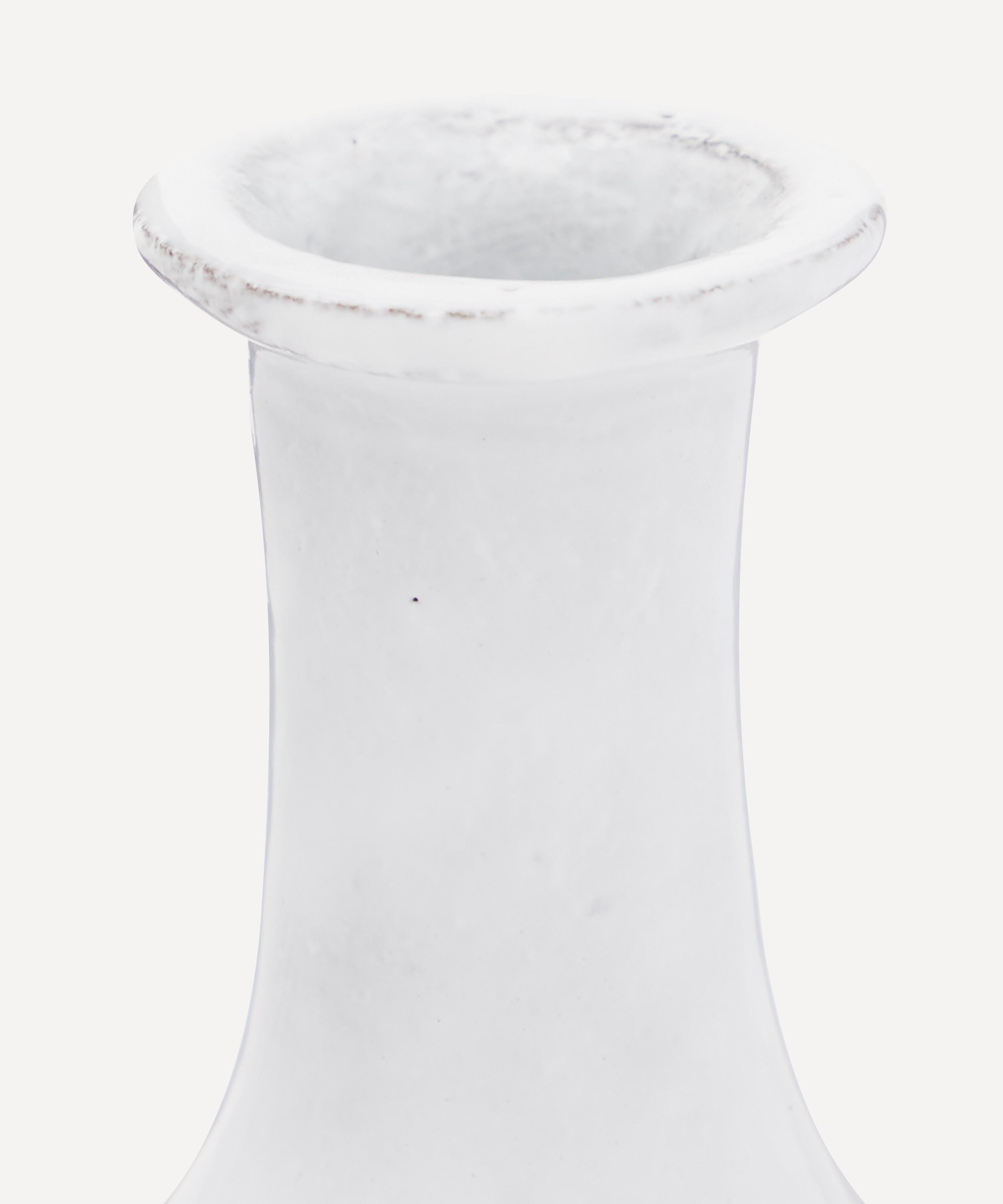 Votary of pre-industrial fabrication, Astier de Villatte is celebrated for being the one and only studio in Paris to hold and harbour the traditions of artisanal ceramic production. Restoring the ancestral systems of moulding and stamping, this vase is made using techniques from the Middle Ages which involve moulding a sheet of handmade clay, double firing the ‘biscuit’ piece and glazing the product in white enamel – a lengthy process that requires a drying time of up to one month. Characterised by a cylindrical form which descends into a bulbous base, the small vase is engraved with the brand’s signature crest - depicting an interlacing A & V - alongside the initials of one of the 40 master artisans who created it. Pair with other ornate vases from the collection for a coordinated decorative approach.