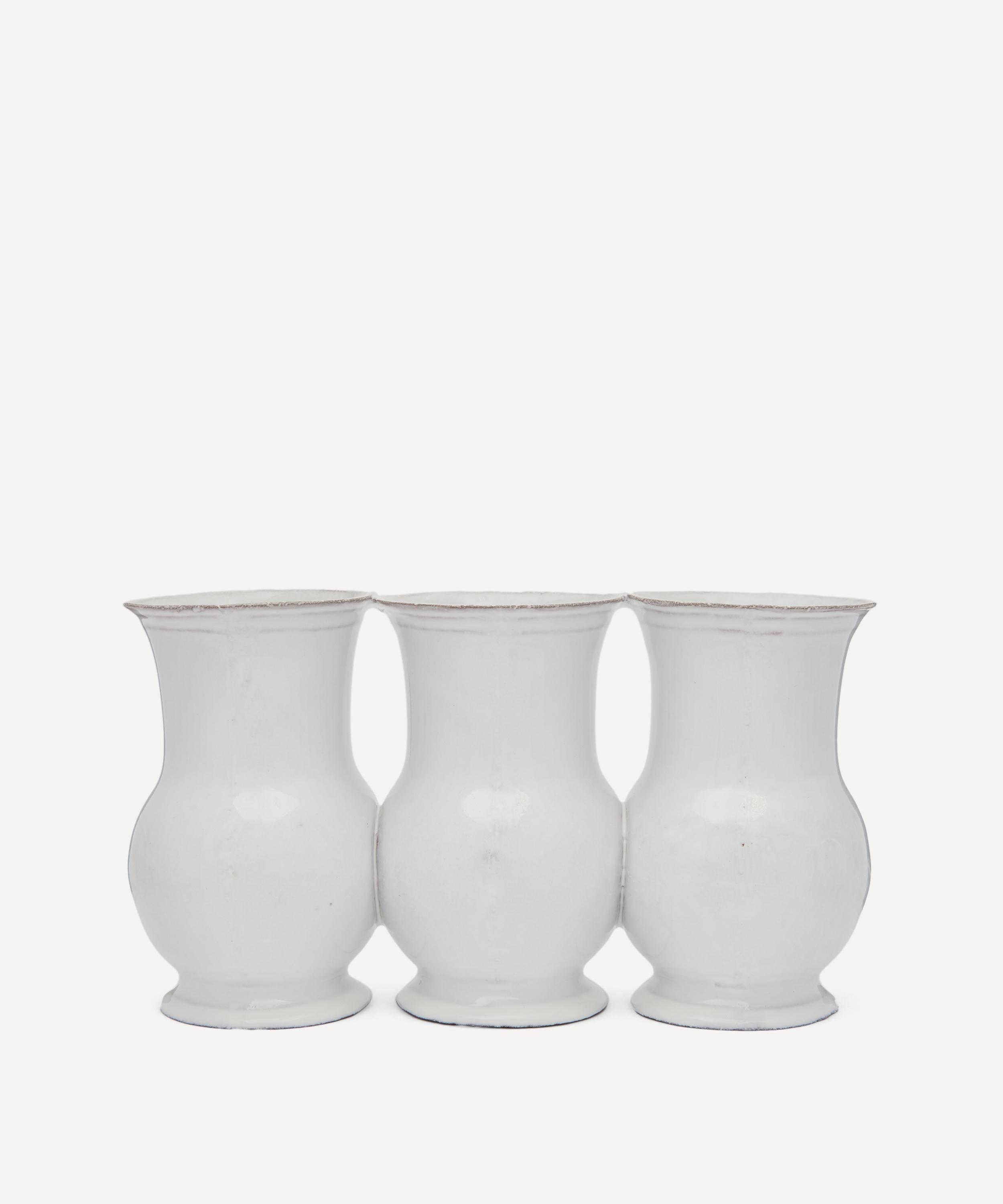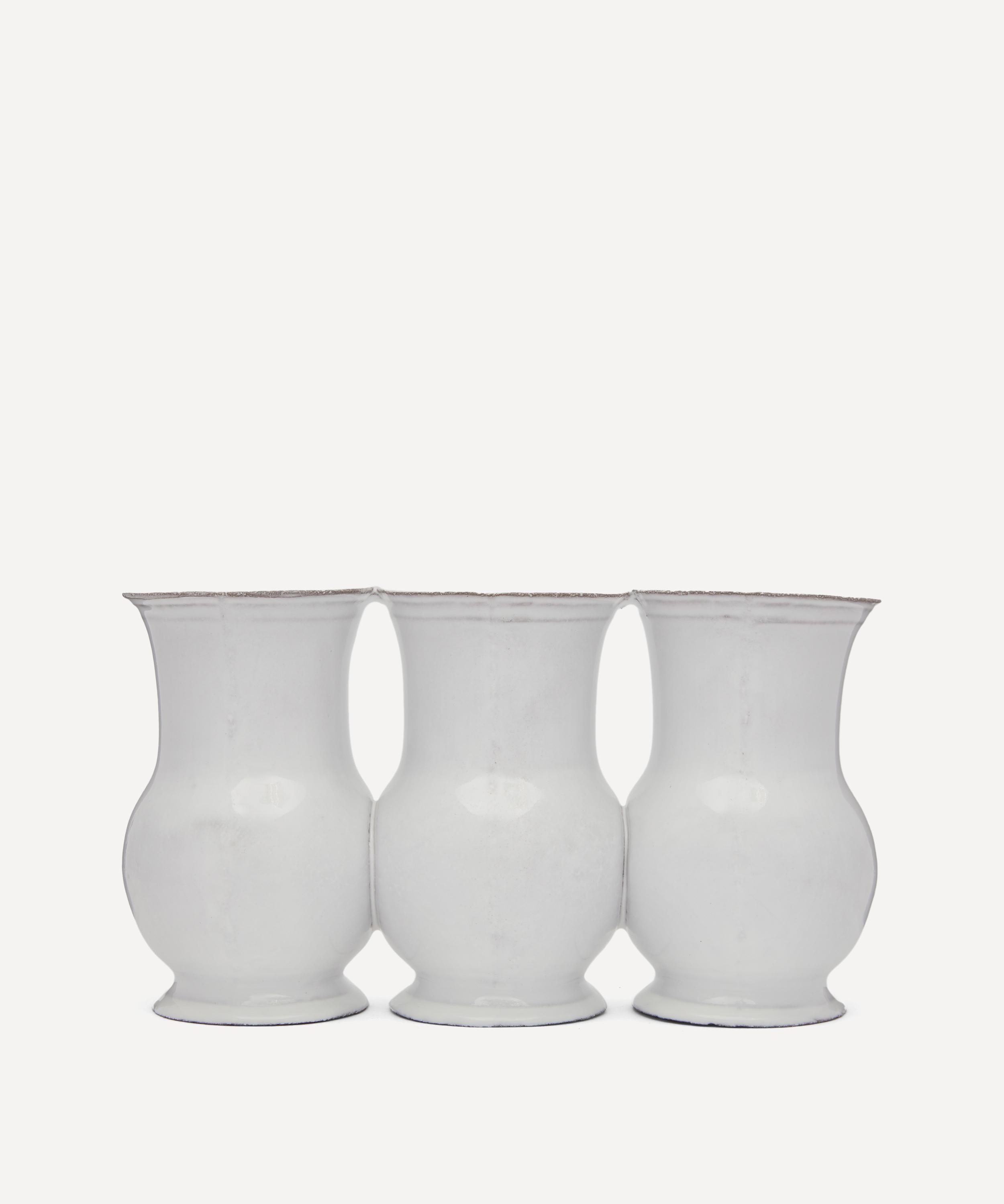 Votary of pre-industrial fabrication, Astier de Villatte is celebrated for being the one and only studio in Paris to hold and harbour the traditions of artisanal ceramic production. Restoring the ancestral systems of moulding and stamping, the Colbert triple vase is made using techniques from the Middle Ages which involve moulding a sheet of handmade clay, double firing the ‘biscuit’ piece and glazing the product in white enamel – a lengthy process that requires a drying time of up to one month. Characterised by three, linked vases, the triple vase is engraved with the brand’s signature crest - depicting an interlacing A & V - alongside the initials of one of the 40 master artisans who created it. Each handmade piece tells a beautiful story, it romances and imparts a sense of nostalgia into its owner. Pair with other vases from the collection for a coordinated decorative approach.