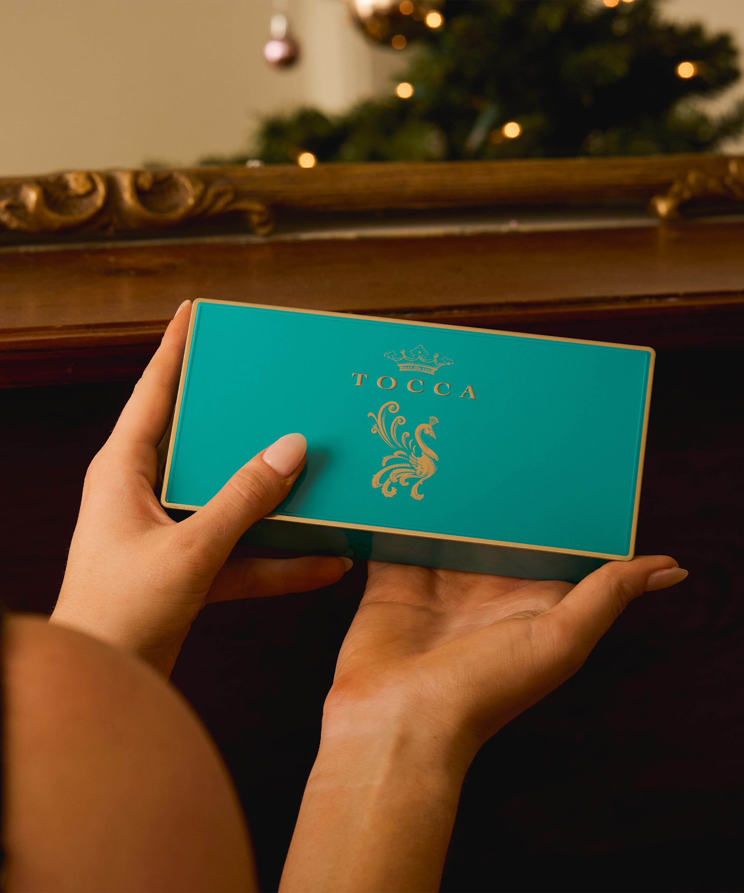 - Housed in a Tocca tin with mini glass vials
