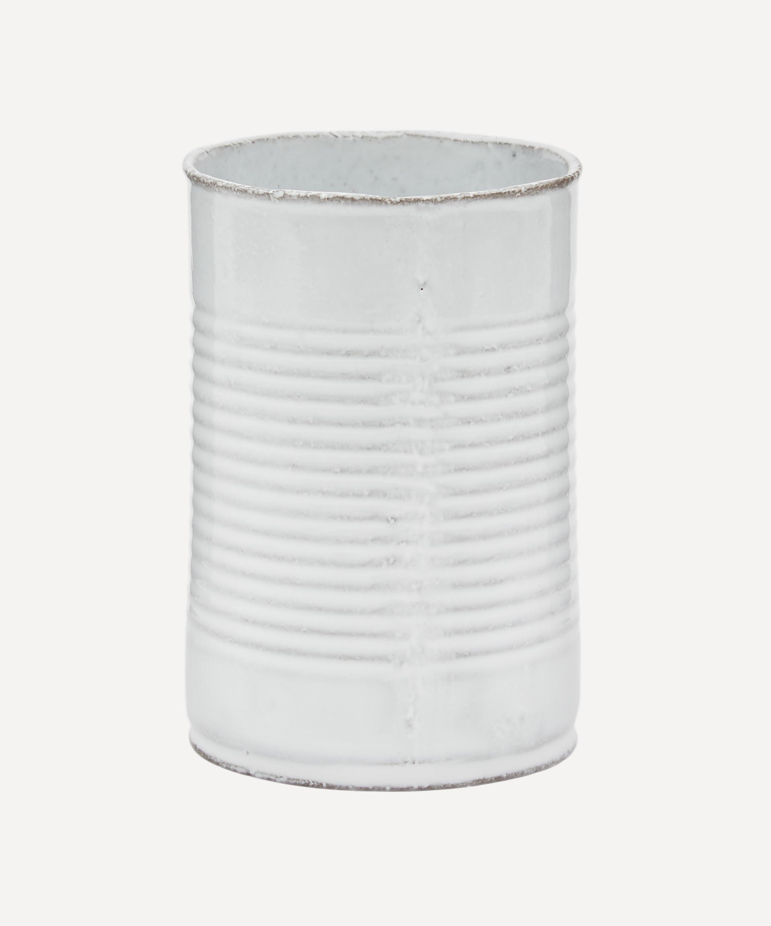 Votary of pre-industrial fabrication, Astier de Villatte is celebrated for being the one and only studio in Paris to hold and harbour the traditions of artisanal ceramic production. Restoring the ancestral systems of moulding and stamping, the Conserve mini vase is made using techniques from the Middle Ages which involve moulding a sheet of handmade clay, double firing the ‘biscuit’ piece and glazing the product in white enamel – a lengthy process that requires a drying time of up to one month. Resembling the exterior of a tin, the cylindrical, multi-rimmed vase is engraved with the brand’s signature crest - depicting an interlacing A & V - alongside the initials of one of the 40 master artisans who created it. Each handmade piece tells a beautiful story, it romances and imparts a sense of nostalgia into its owner. Use this perfectly imperfect vase to display verdant fronds or vibrant bouquets.