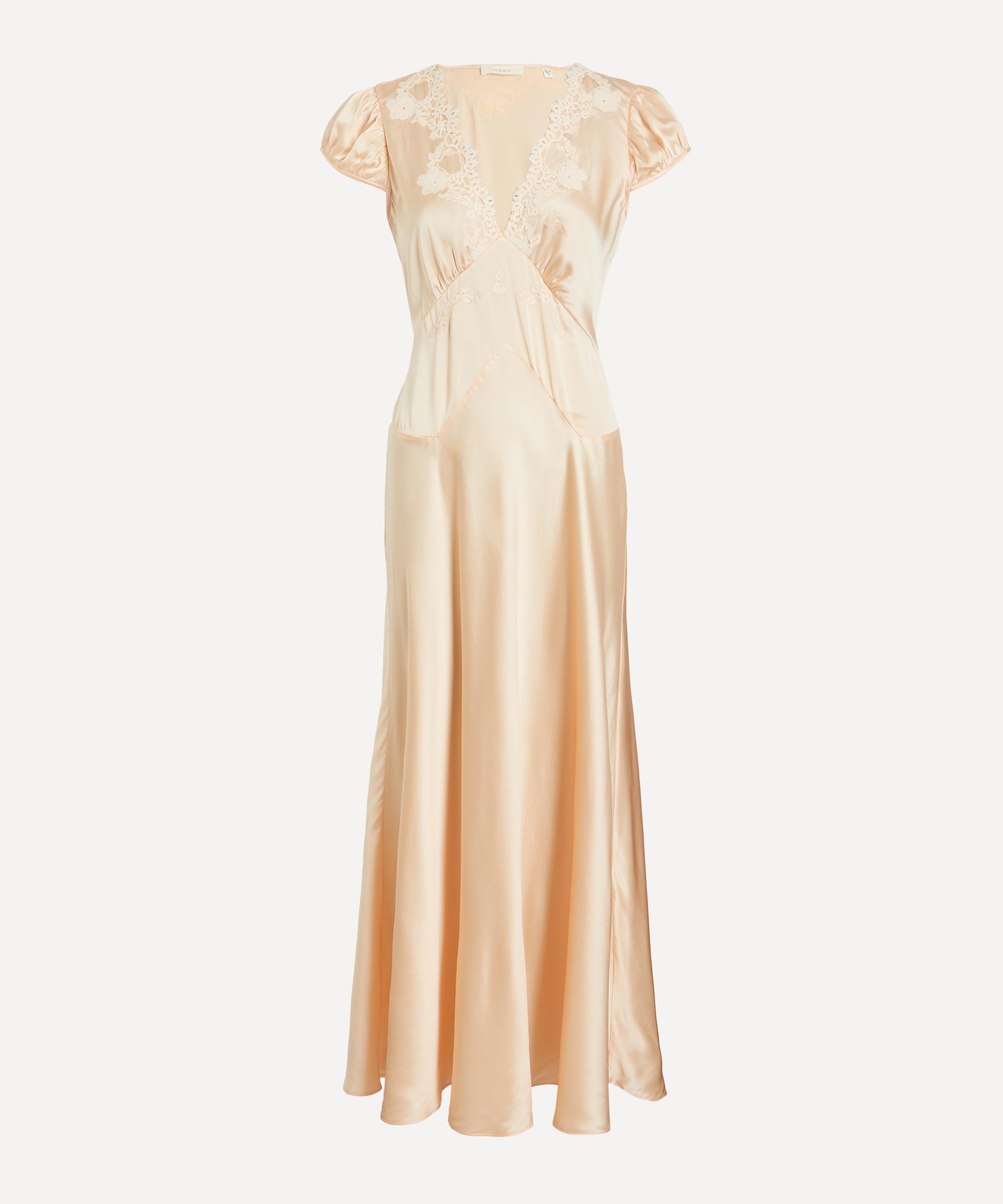 Crafted from luxurious, ultra-soft silk satin, the ‘30s-inspired Coraline Dress features gathered cap sleeves and a plunging V-neckline, adorned with intricate embroidered scallop lace. It’s finished with a fitted bodice and a midi-length, bias-cut skirt.