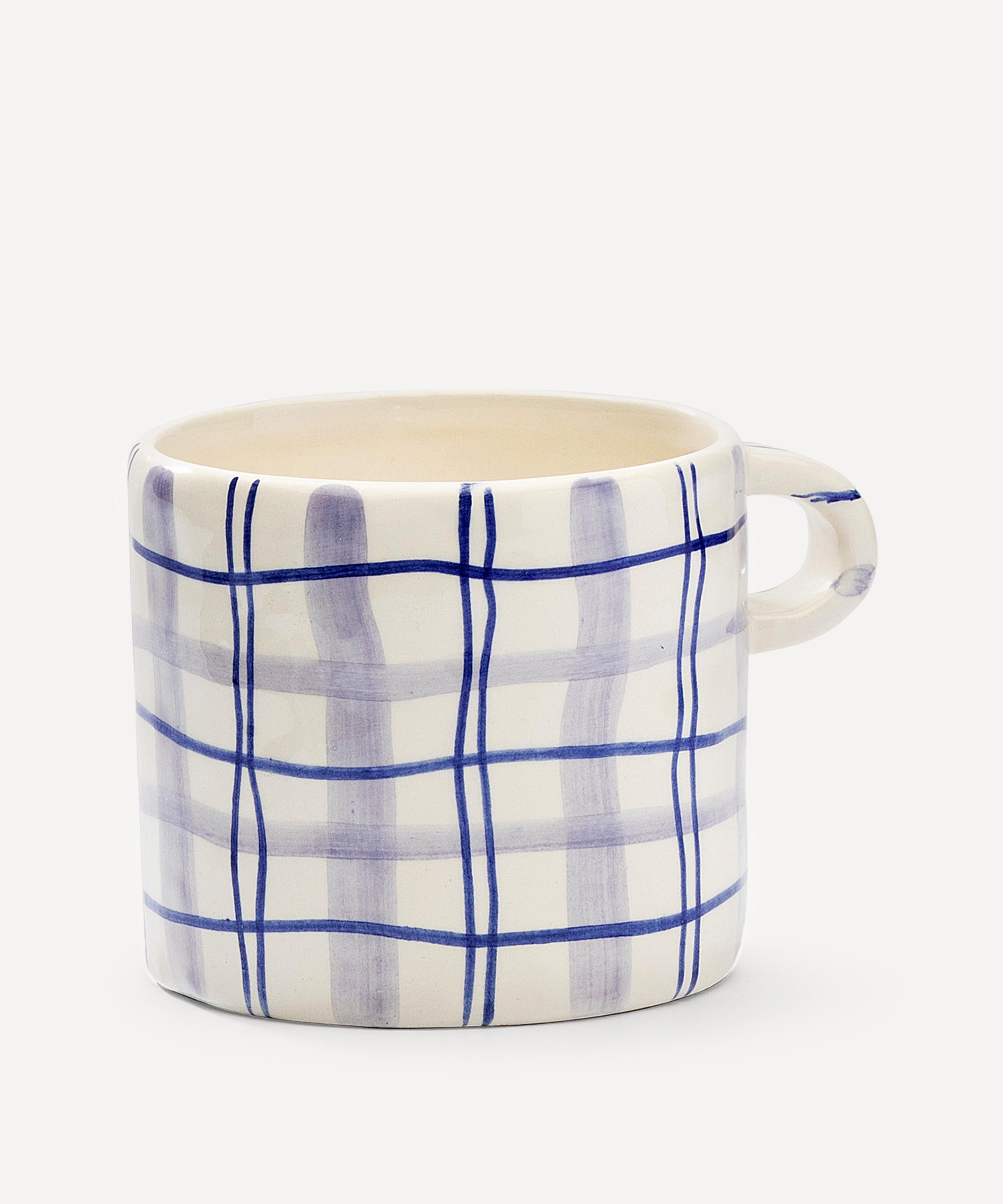 Anna + Nina’s homeware range is characterised by a sense of wonder and whimsy, inspired by the designers’ global travels. This ceramic mug features a textured exterior, a small handle and lilac and blue checked pattern painted onto the glossy ceramic- a wonderful way to start each morning. Combine it with multiples of the same theme for a cohesive dining approach, or mix and match with other small vessels from your own adventures for an eclectic feel.