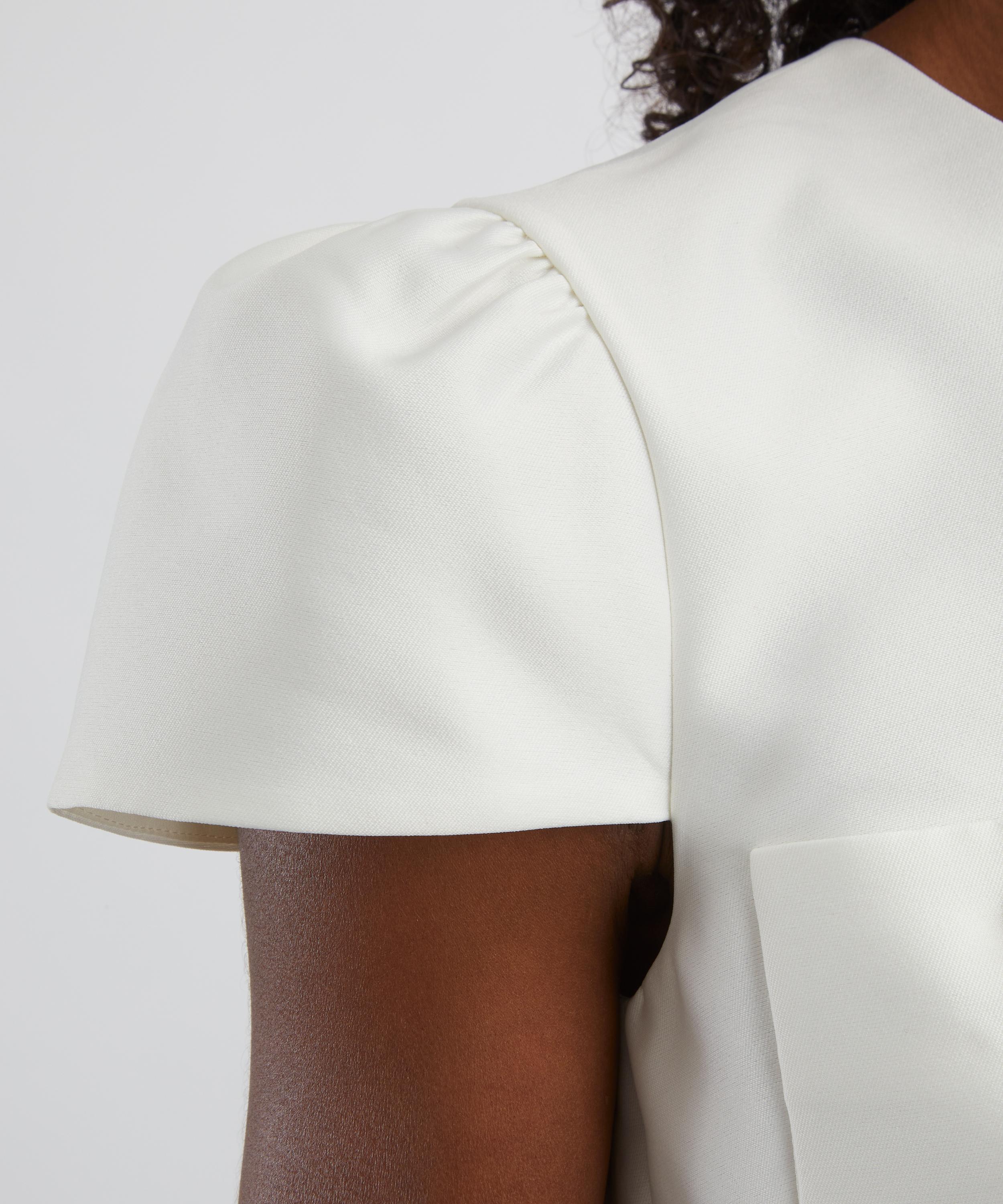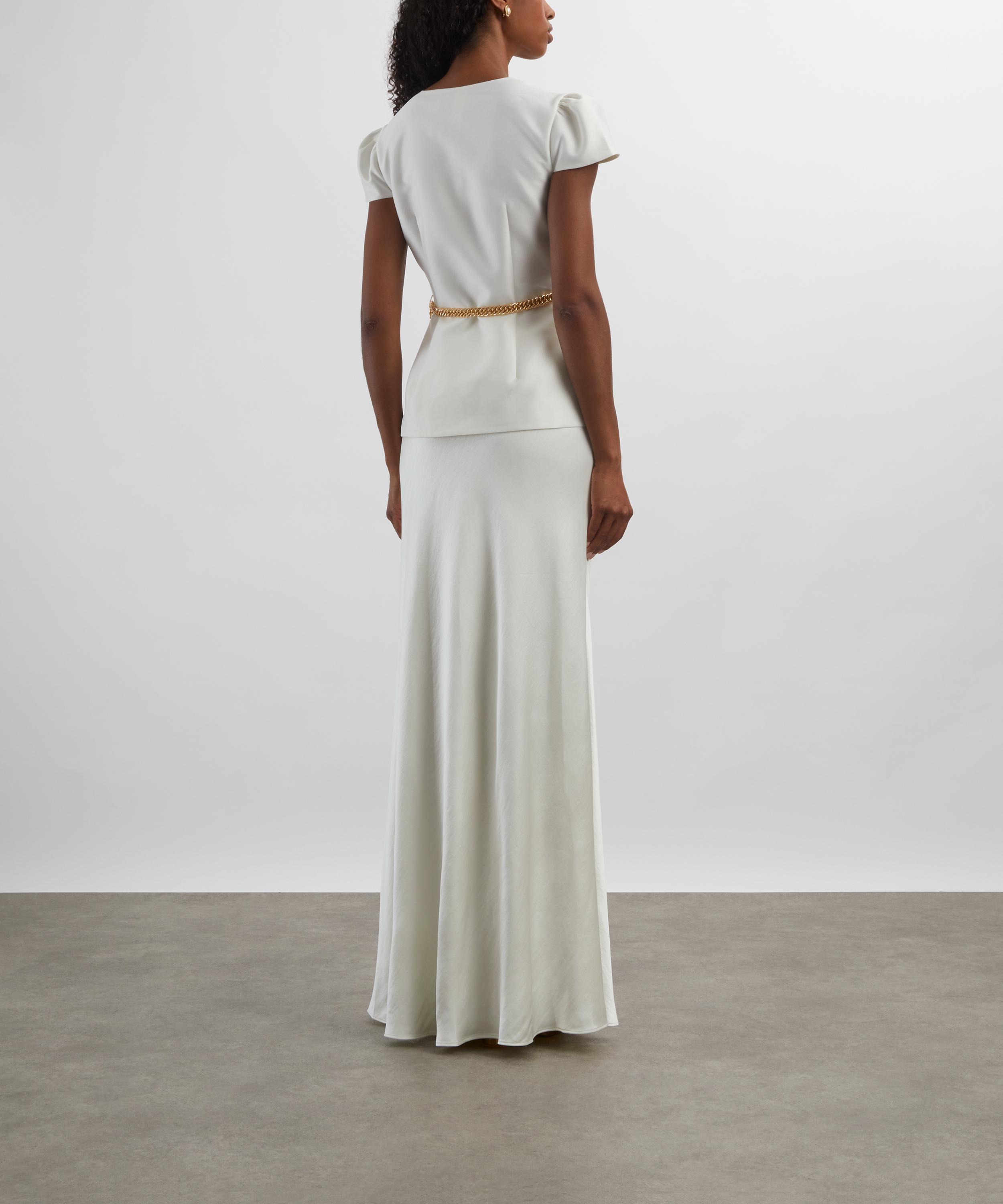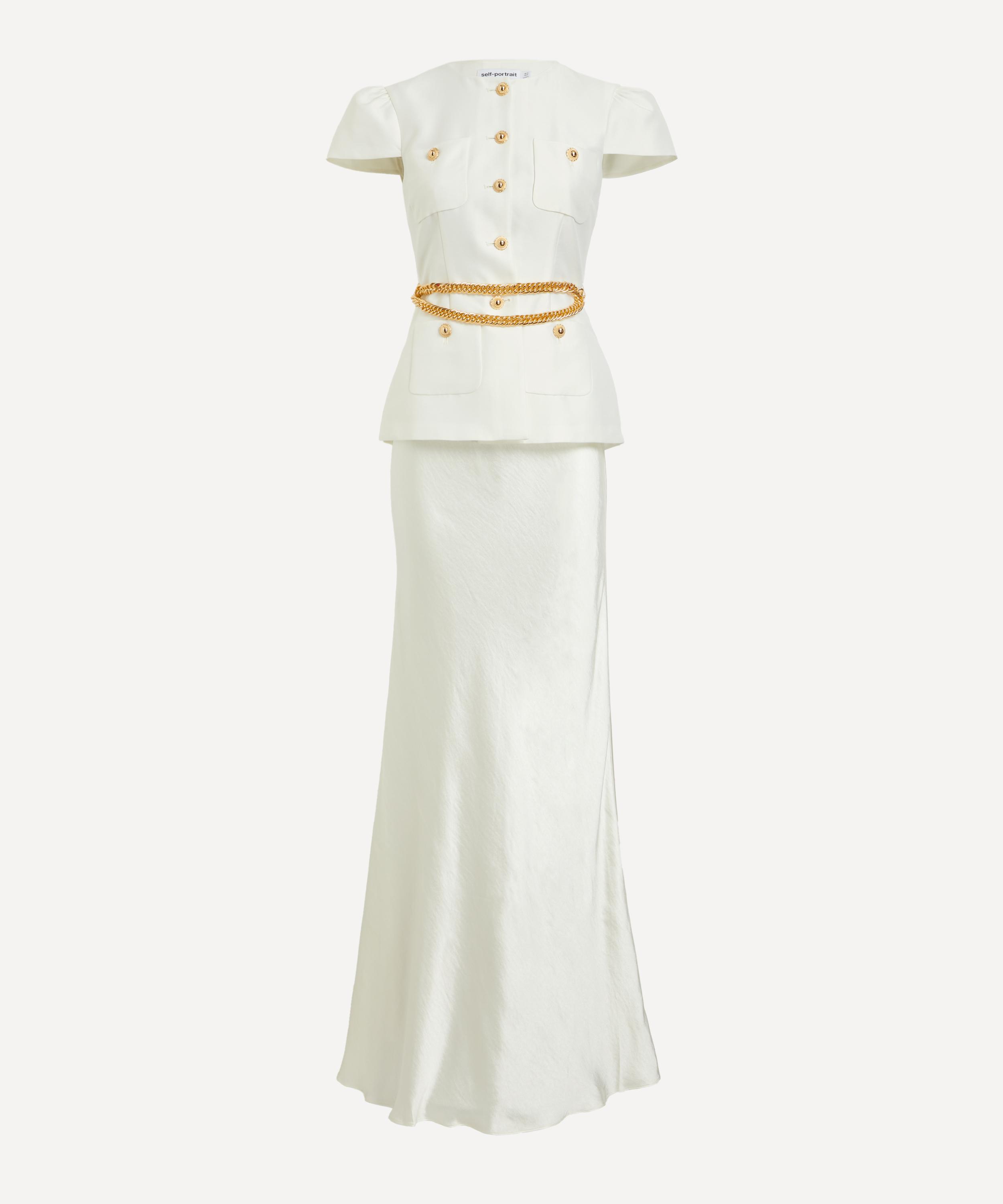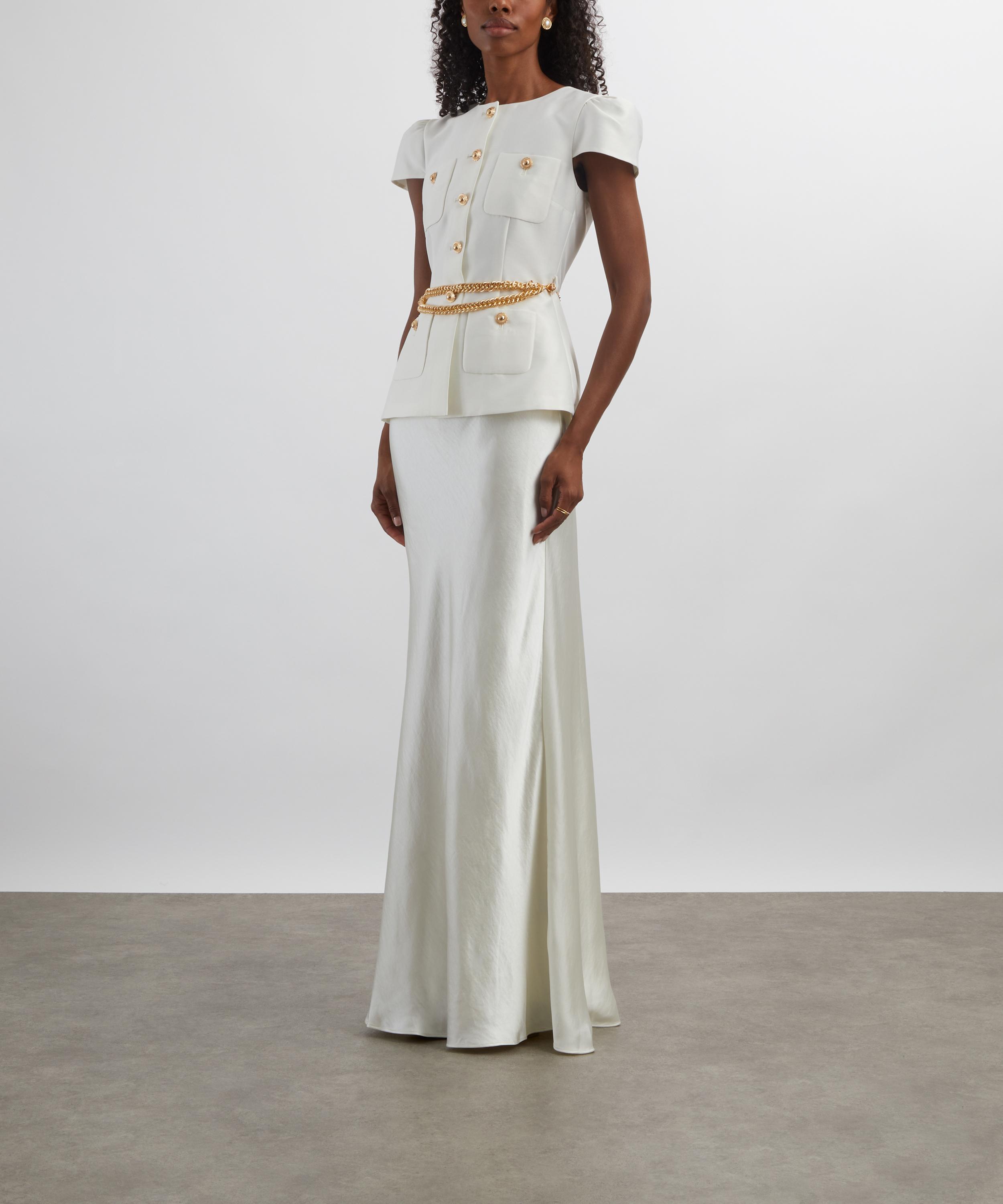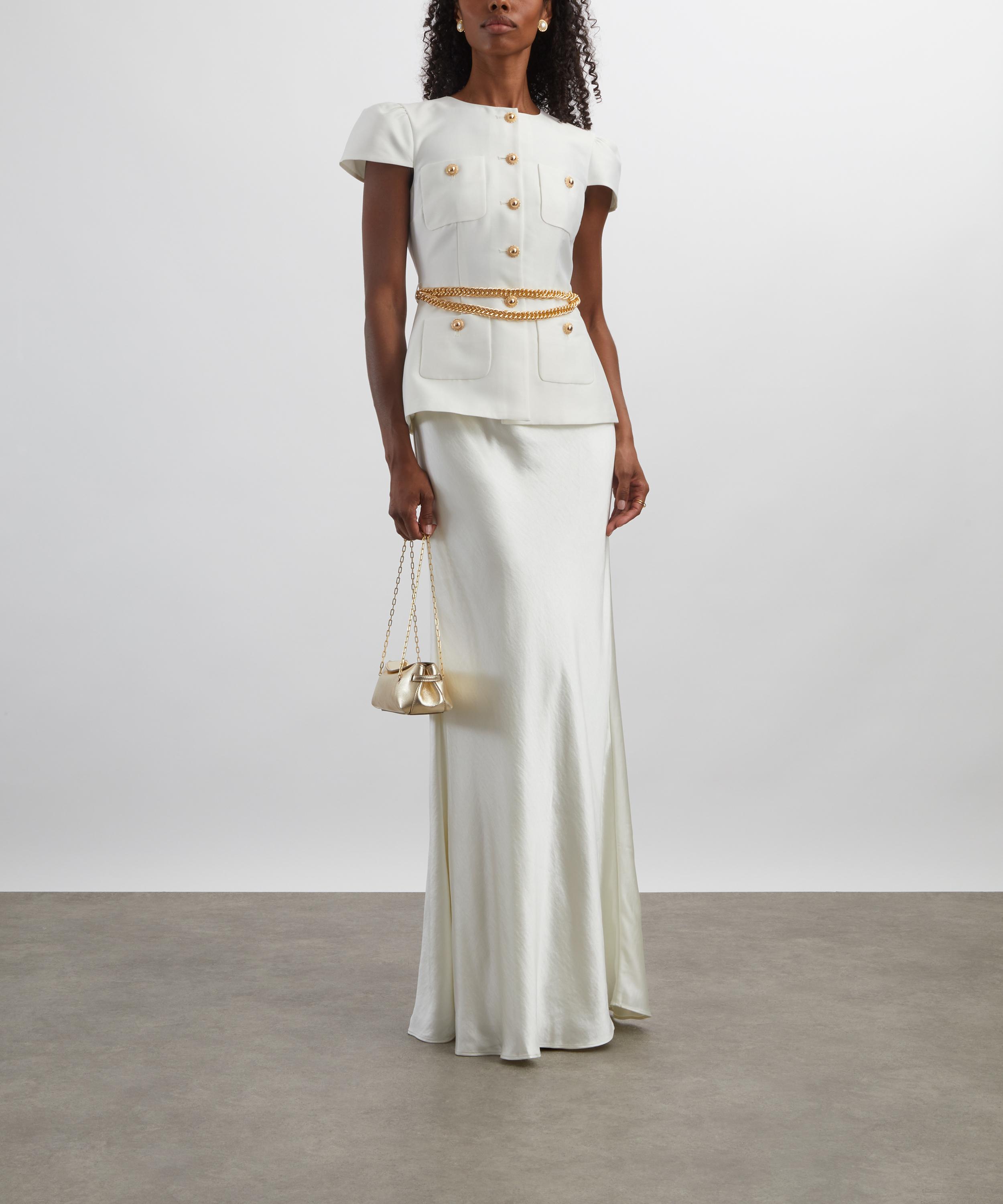 Indulge in the elegant sheen of cream taffeta and satin with this tailored maxi dress. Consisting of a fitted, short-sleeve top and a fluid maxi skirt, it’s topped up with a gold chain belt and buttons for a refined, lady-like polish to the piece.