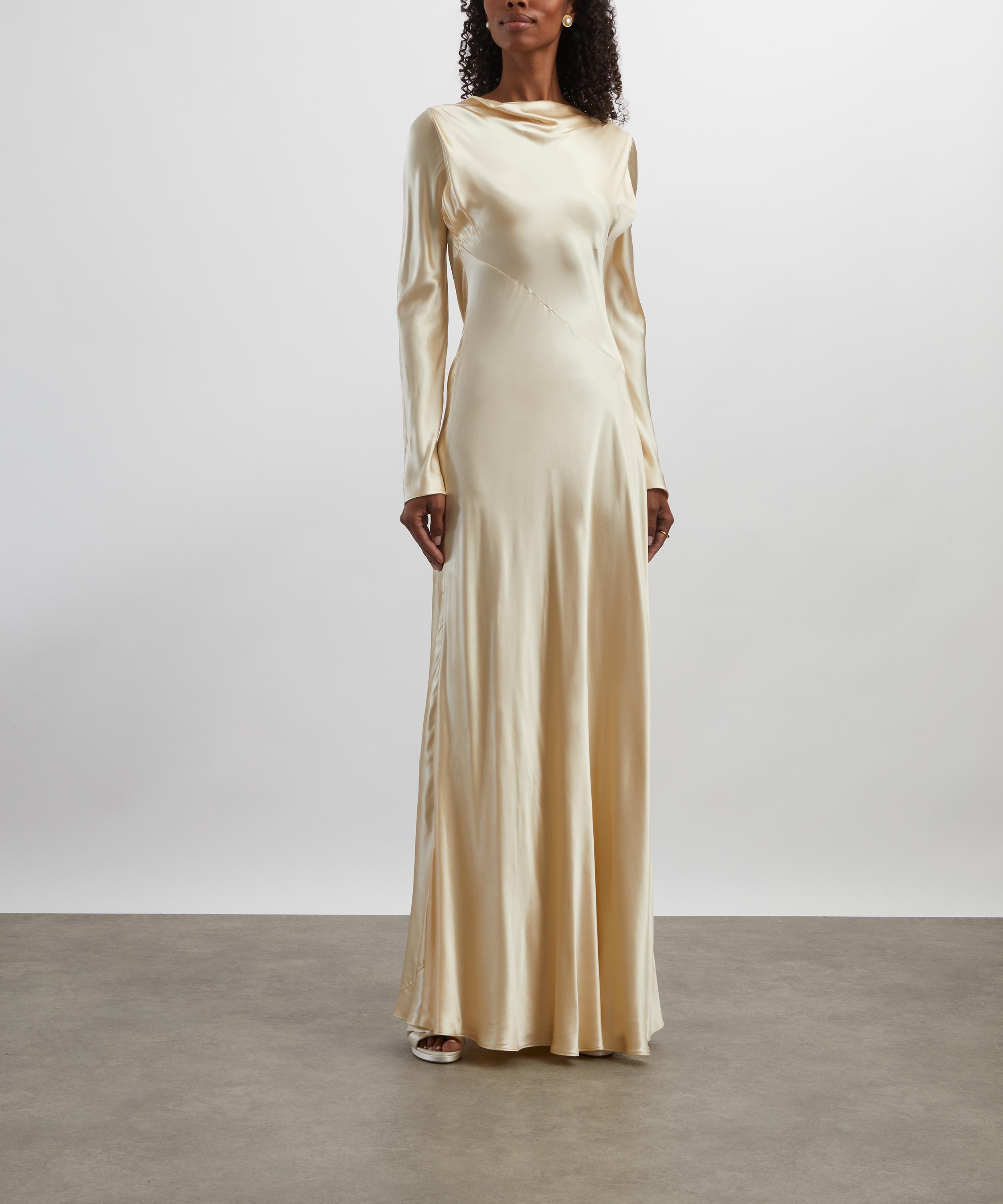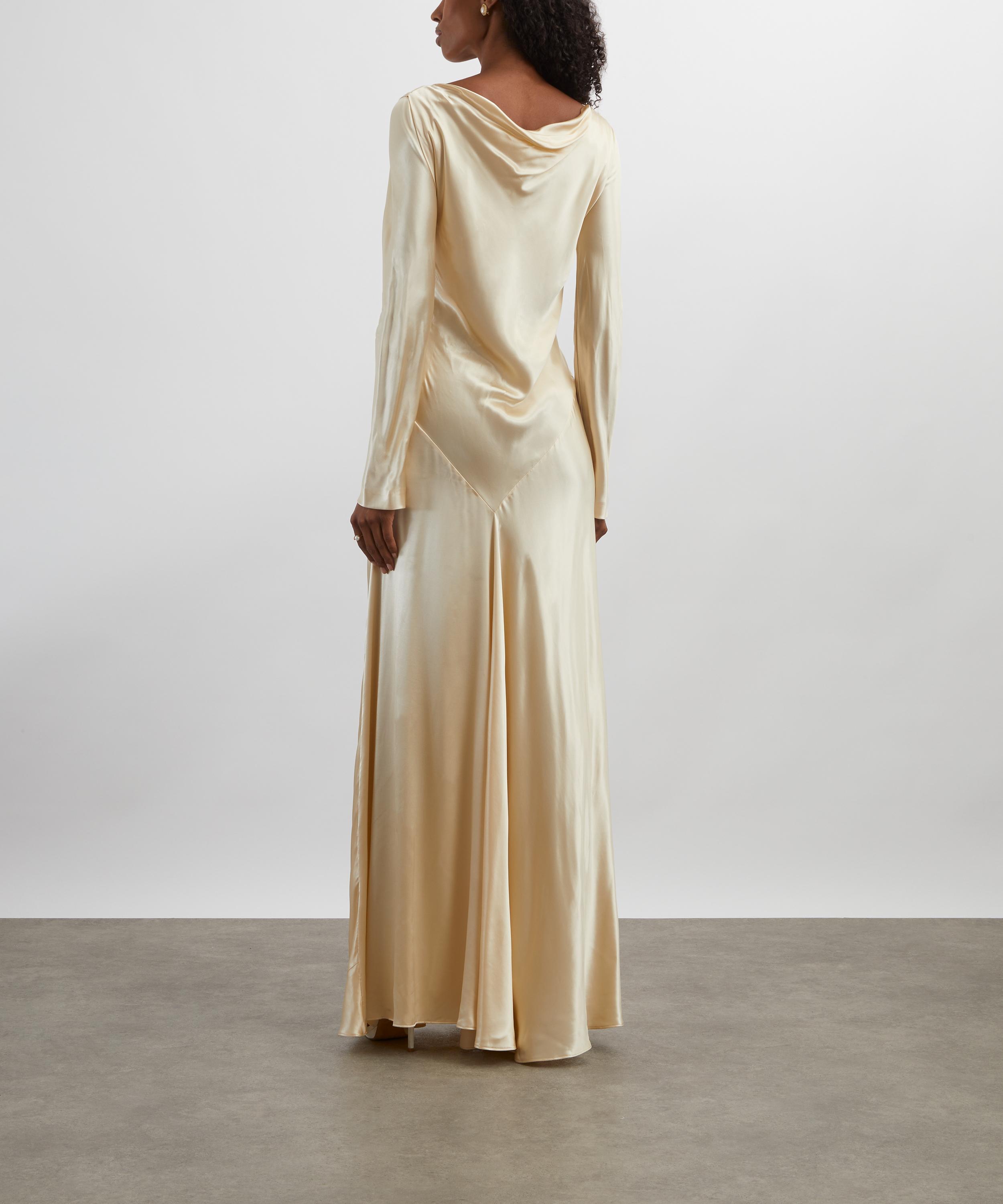 With its sleek satin finish and artful construction, this floor-length dress exudes timeless Italian elegance. Graceful draping and a fluid silhouette define this elegant piece, enhanced by a softly cascading cowl neckline and long sleeves that add refined coverage. Cut on the bias, the triangular waist seam skims the body with a flattering, figure-enhancing flow.