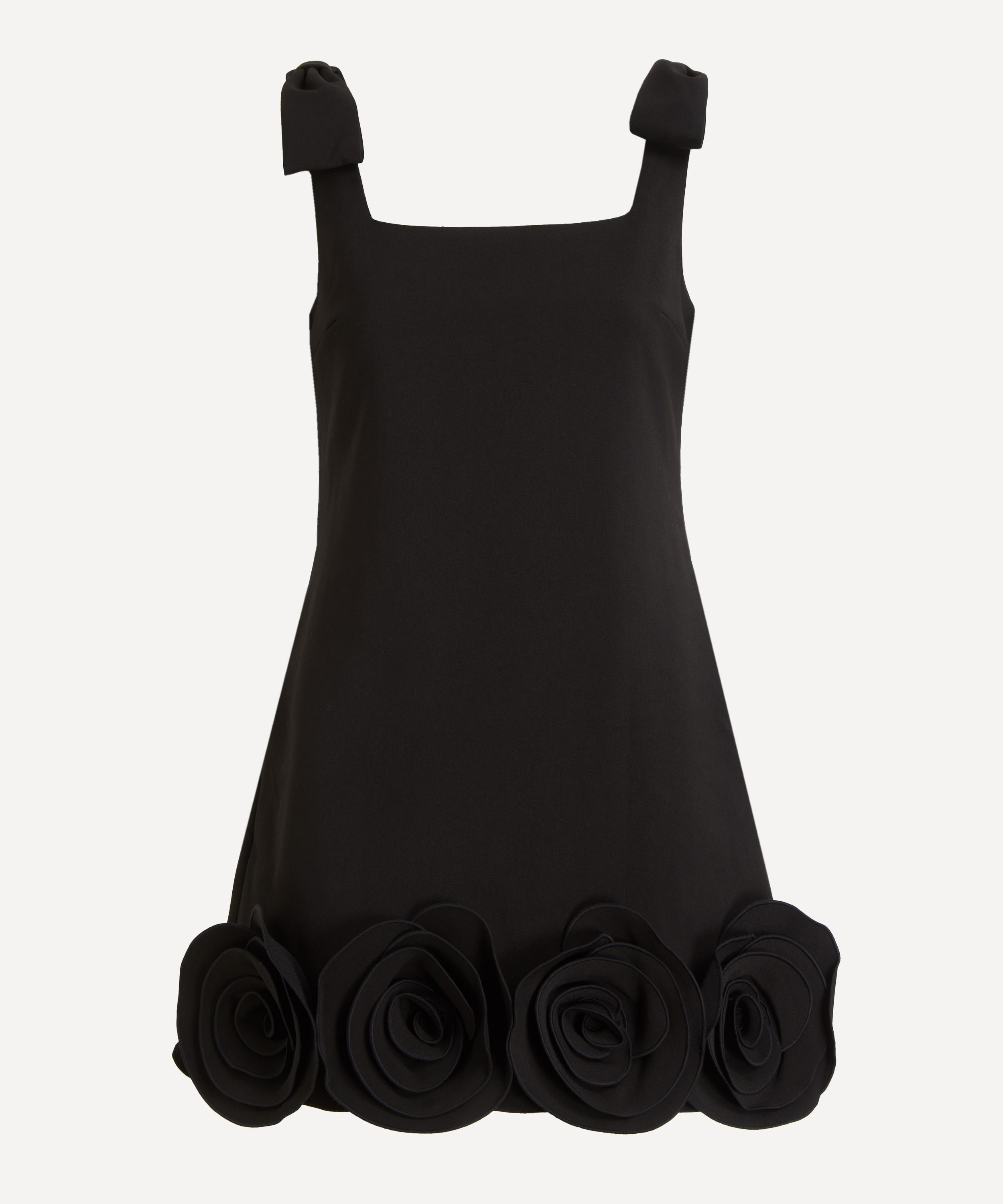 Cut from crepe for a relaxed fit, this timeless little black dress boasts a flattering square neckline, bow details at the straps, and comes adorned with sculptural floral motifs along the hem, offering a charming, romantic finish.