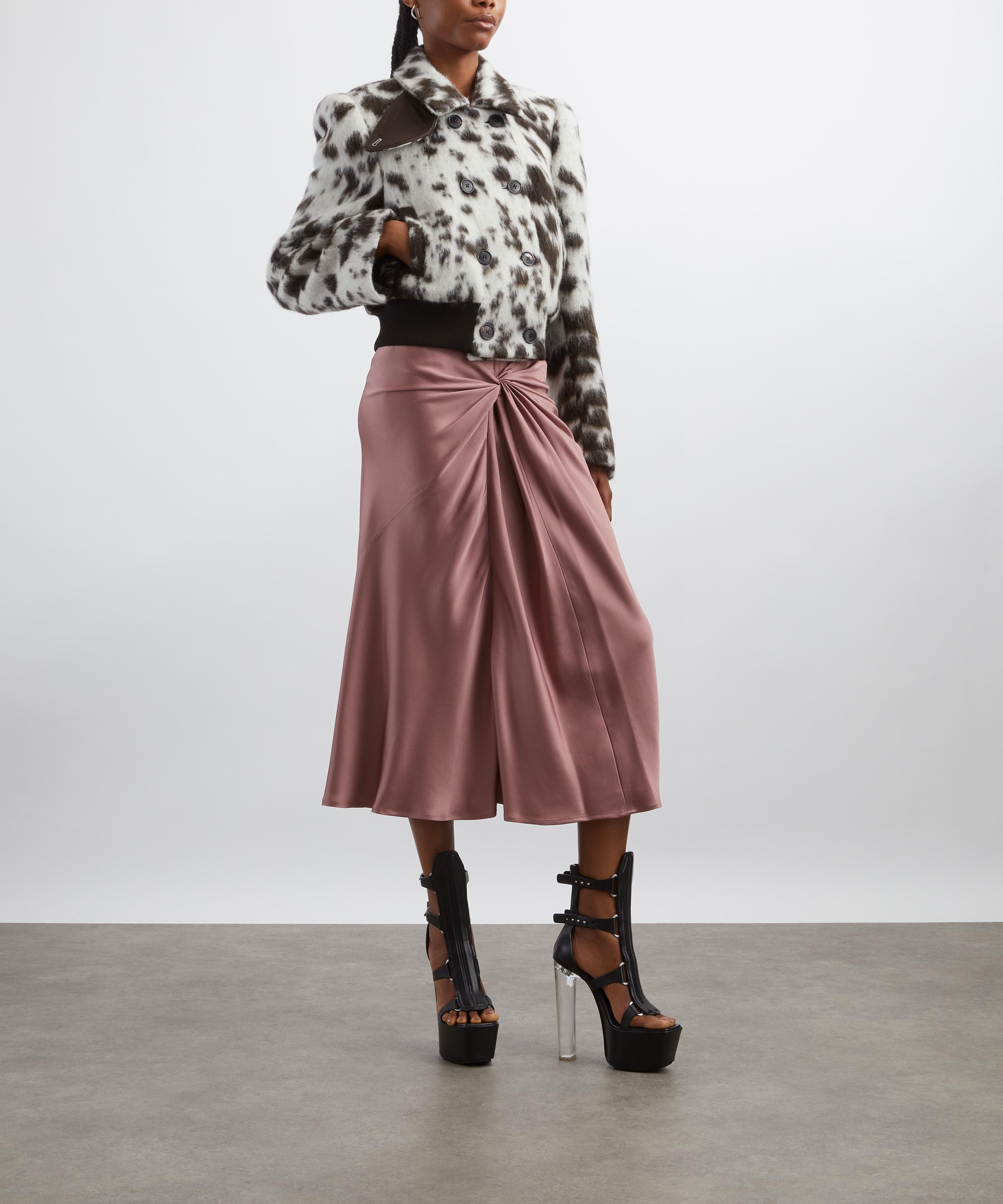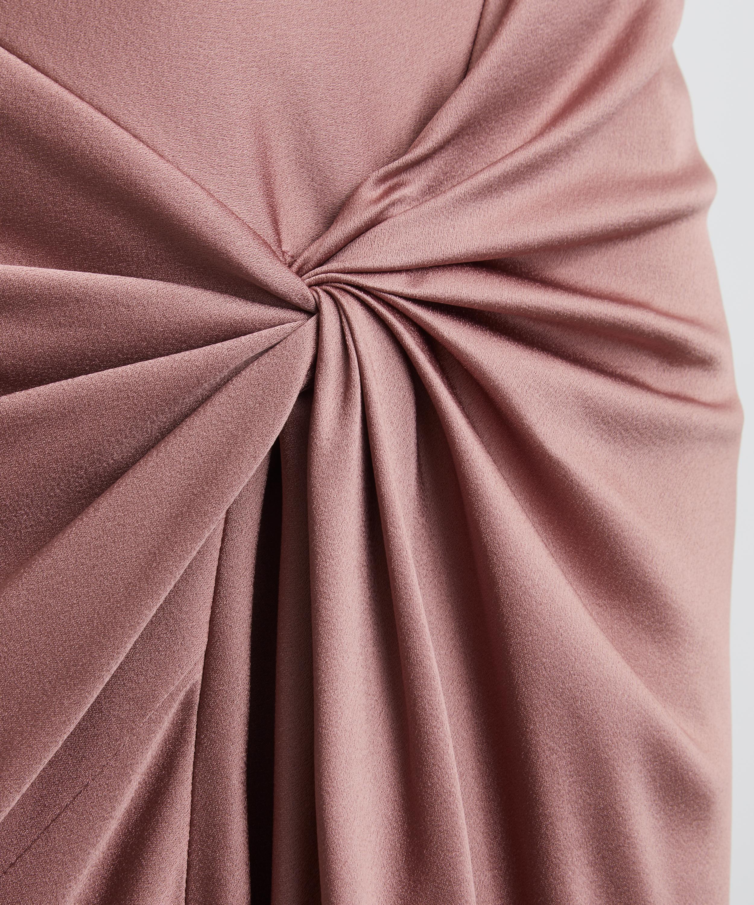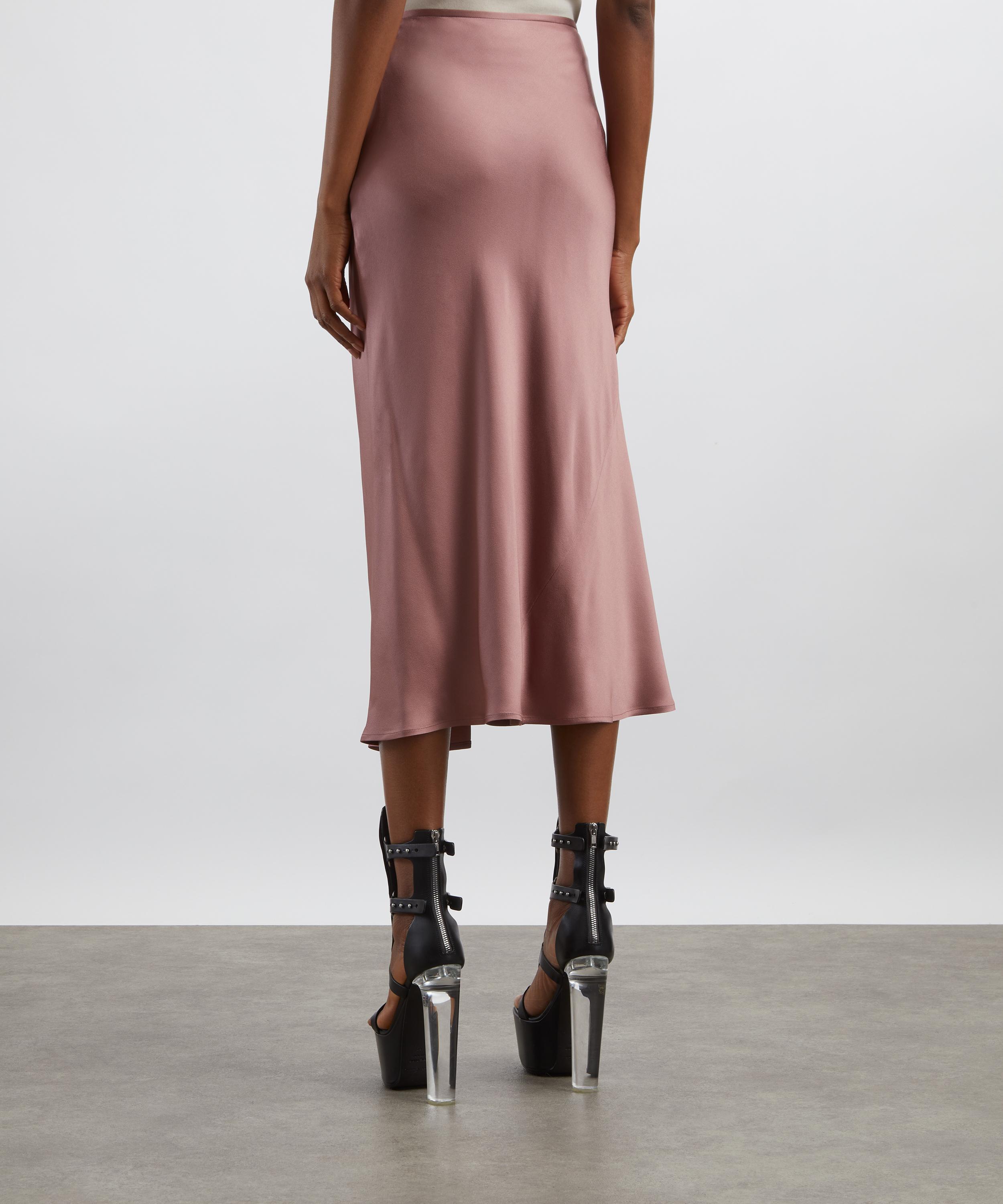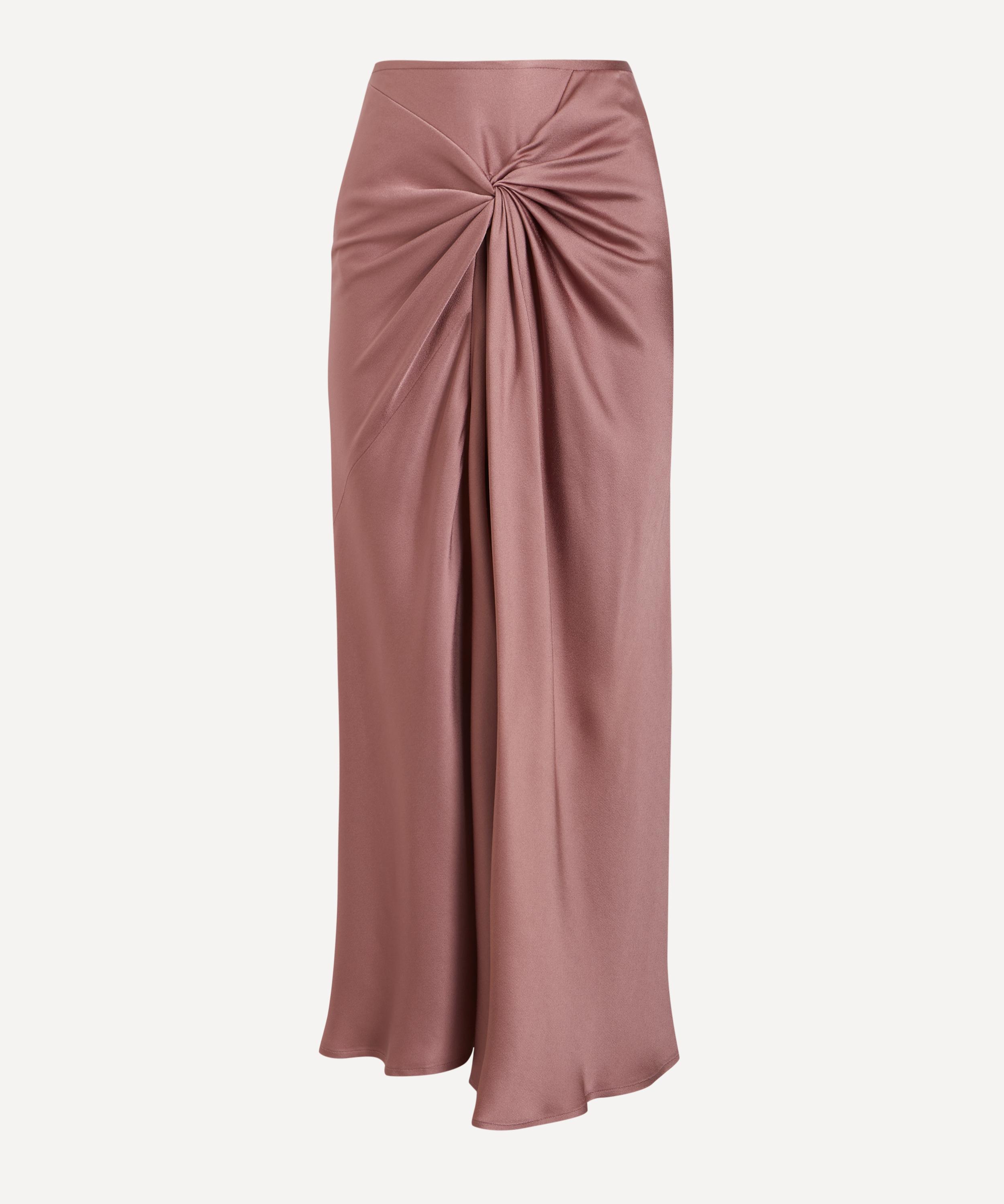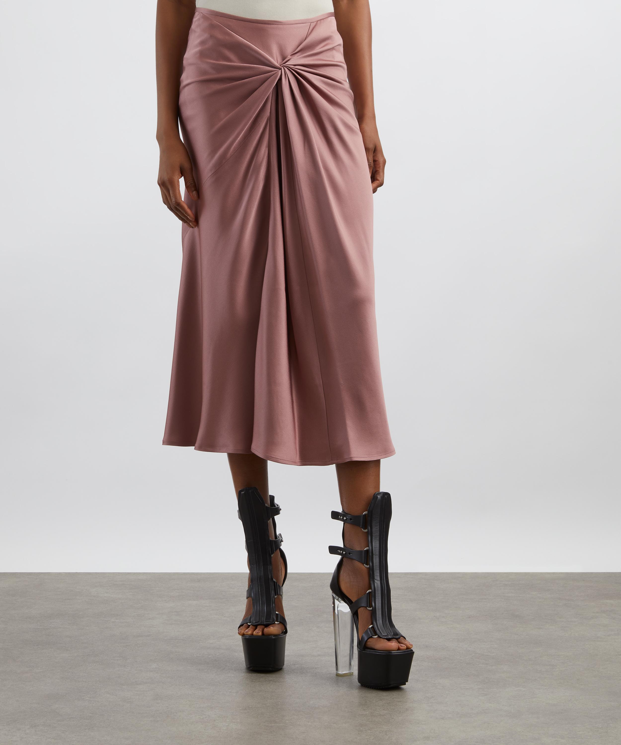 Cut from fluid crepe satin in rose pink, this midi skirt features a front knot that creates soft, elegant draping throughout.