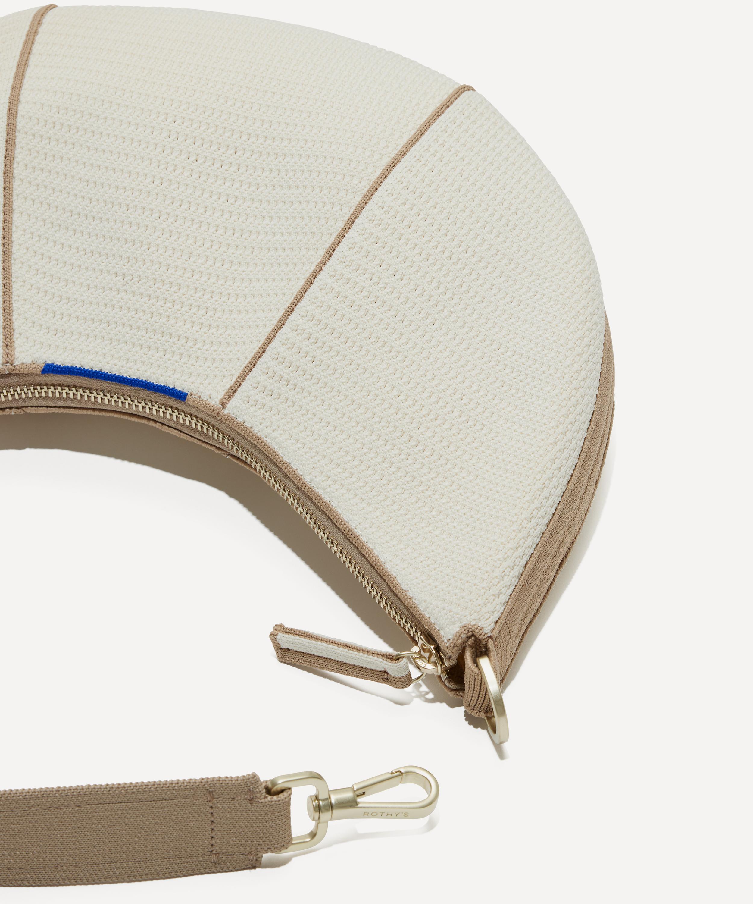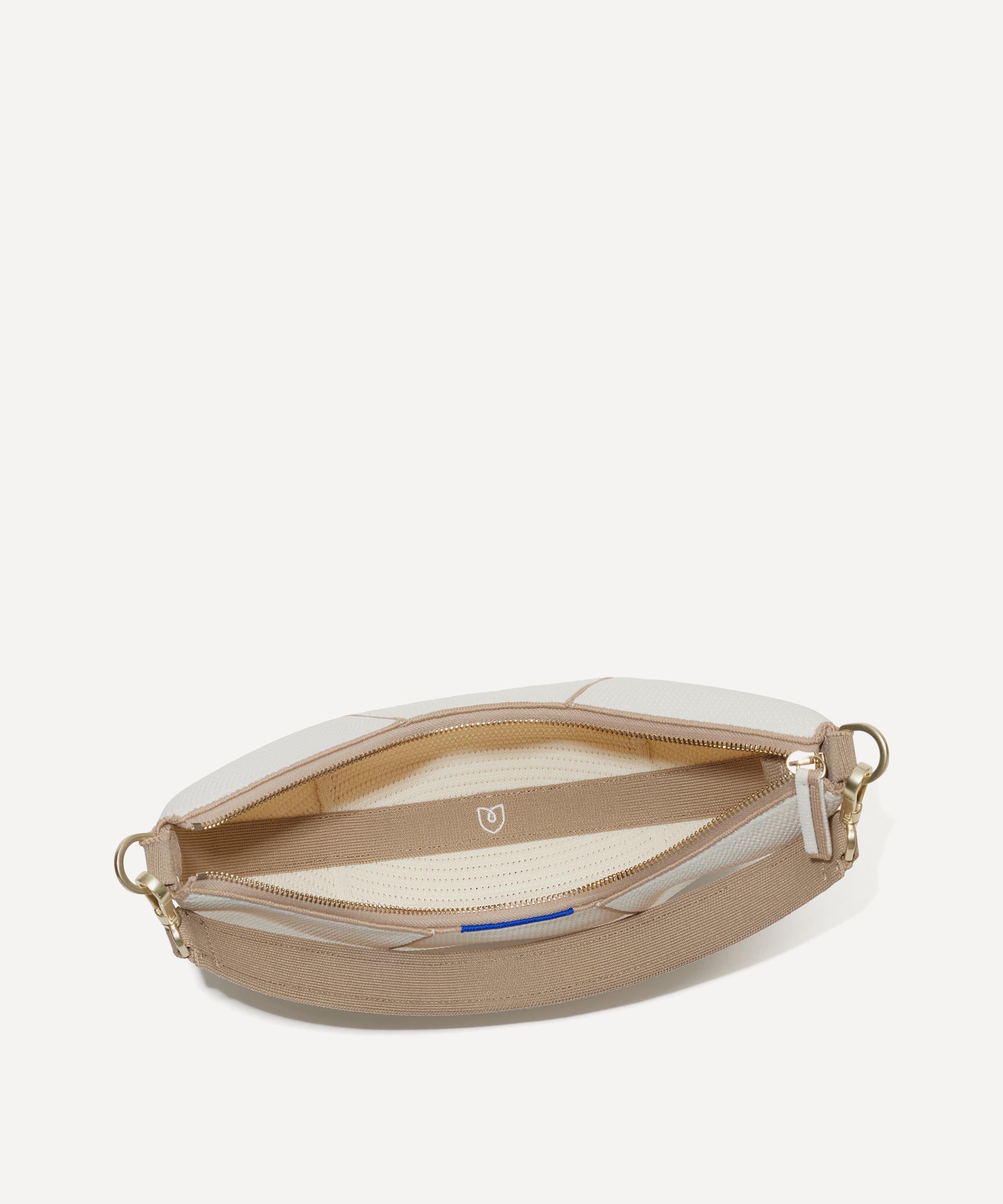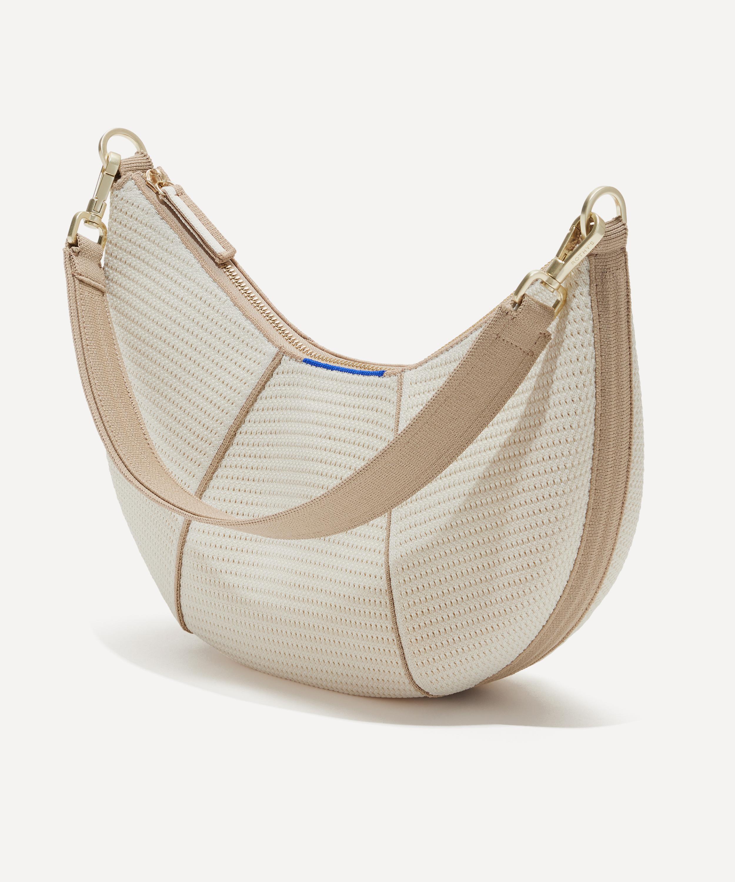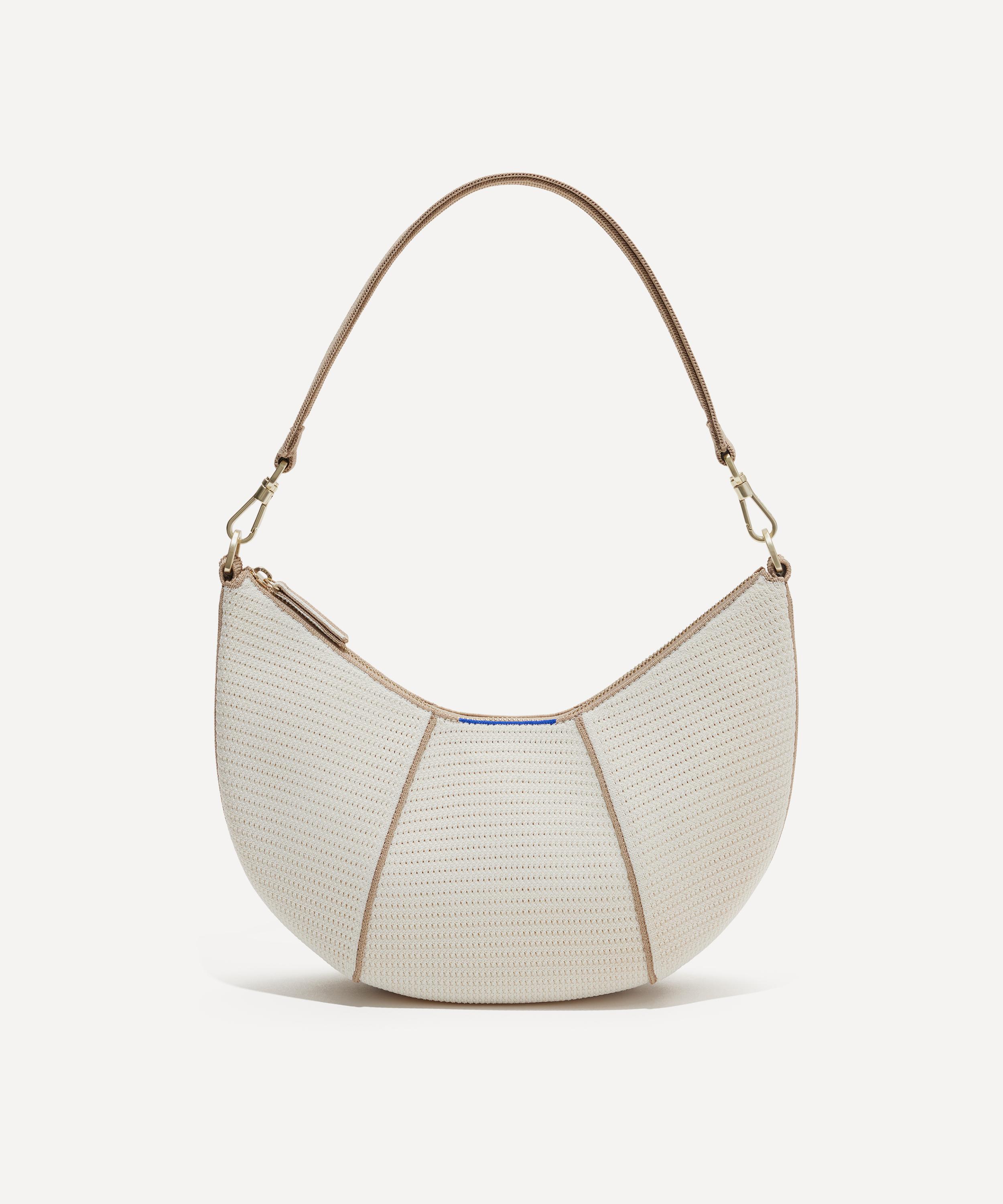 Offering a chic crescent silhouette and an open-weave knit in ivory, with soft beige piping, it’s perfect for off-duty looks, whether spent shopping, strolling the city, or traveling. Featuring a spacious main compartment, secured by a zip closure, it’s finished with a detachable strap to let you wear it as a shoulder bag, or you can mix and match with the brand’s selection of bag straps.