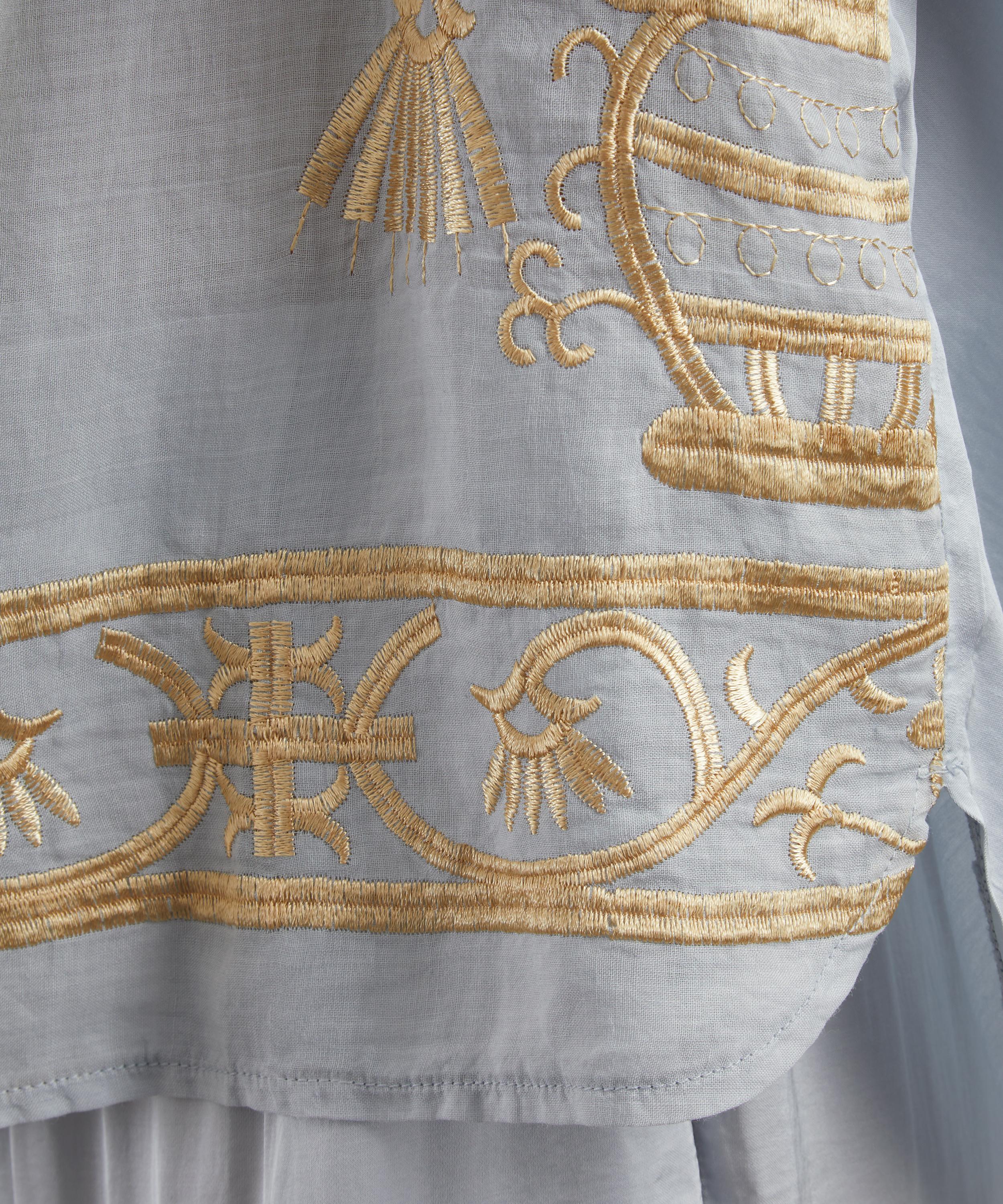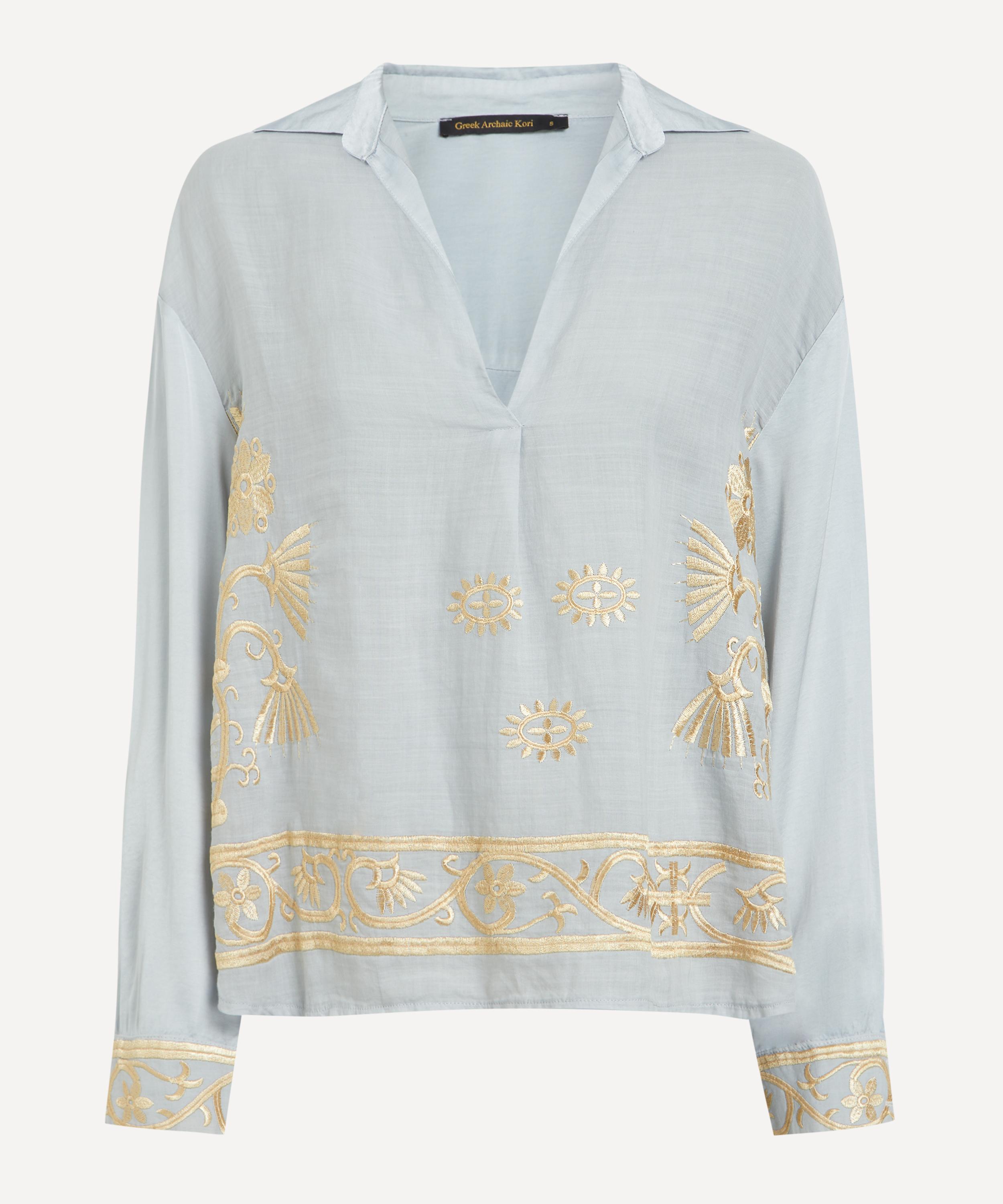 The Crete Embroidered Open Collar Blouse by Athenian label Greek Archaic Kori infuses your new-season wardrobe with the sun-drenched elegance of the Mediterranean.