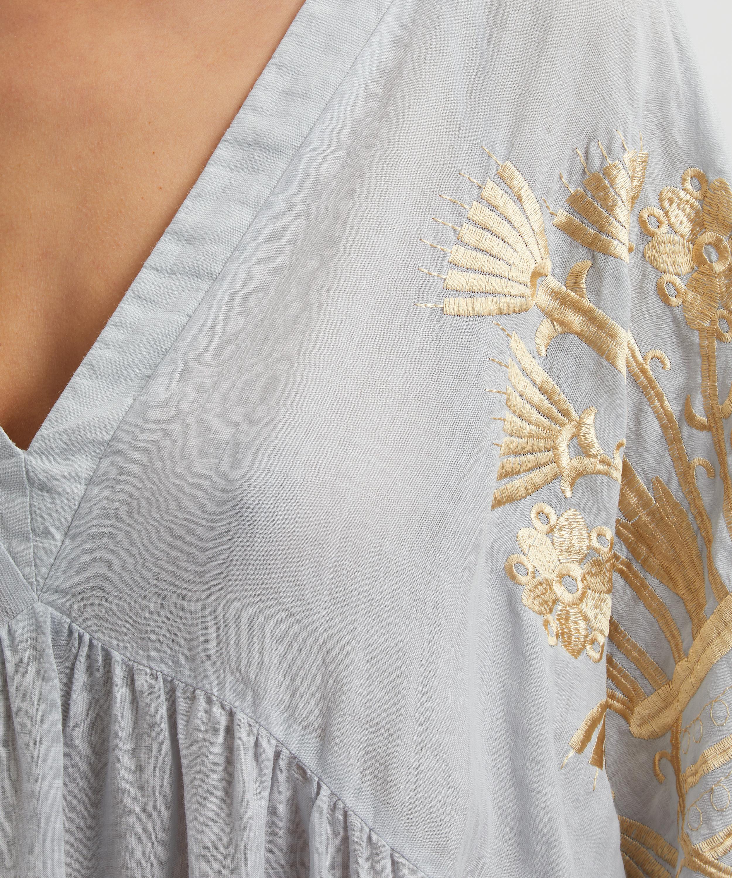 Lightweight and airy, this breezy ramie kaftan captures effortless elegance with a V-neckline, gathered empire waist, flowy dolman sleeves, accented with shimmering gold floral embroidery throughout.
