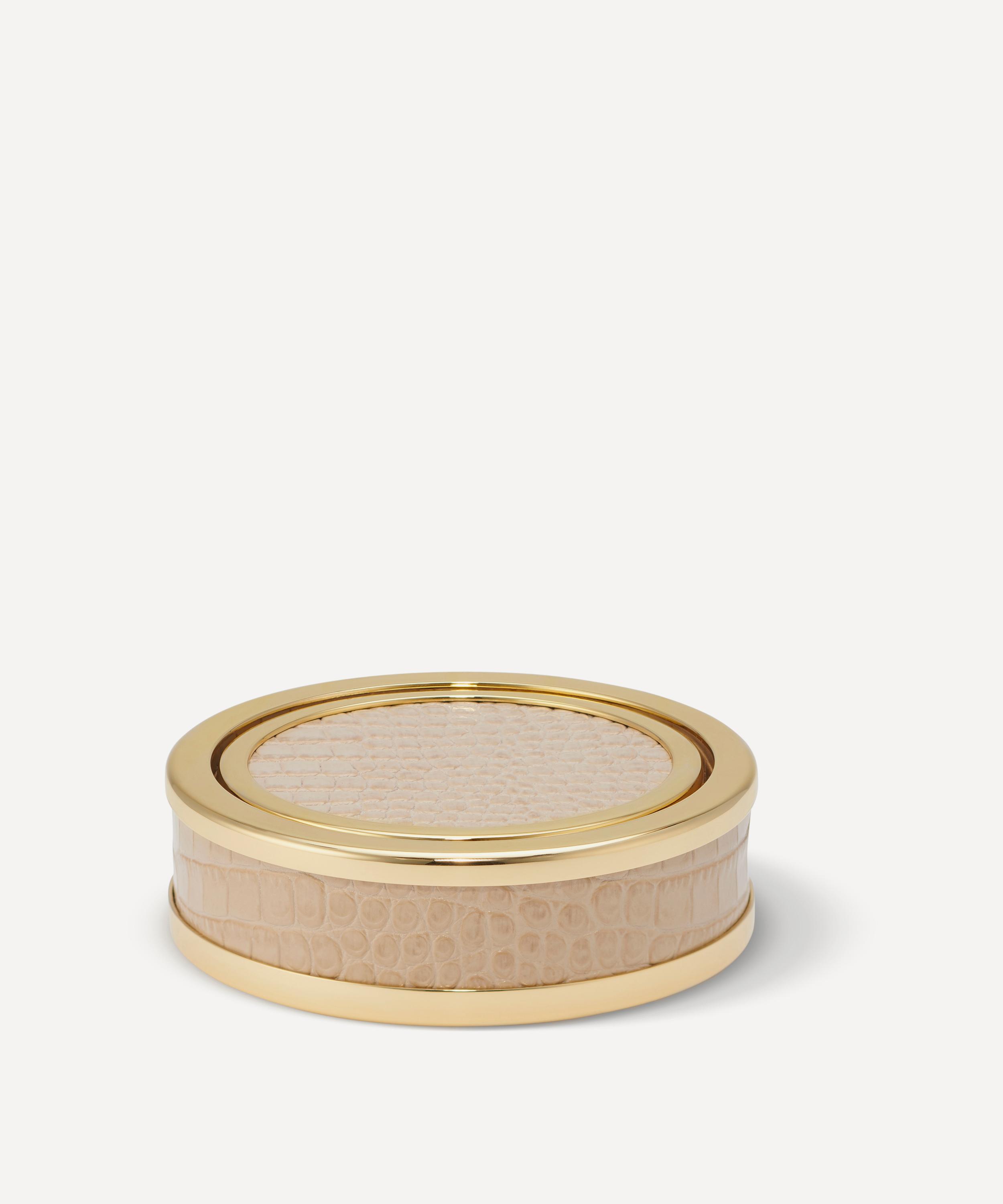 Perfect for when you’re relaxing at home or entertaining guests, this set of four coasters is defined by its supple, croc-embossed leather construction and polished brass trims. They’re finished with a suede underside and bring a further flourish to your tabletop or bar arrangement.