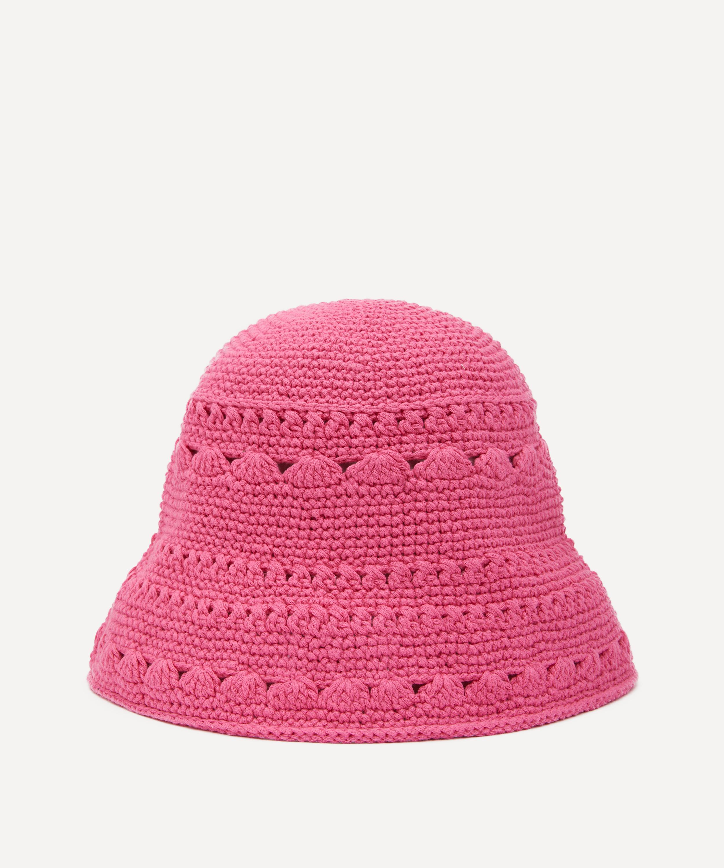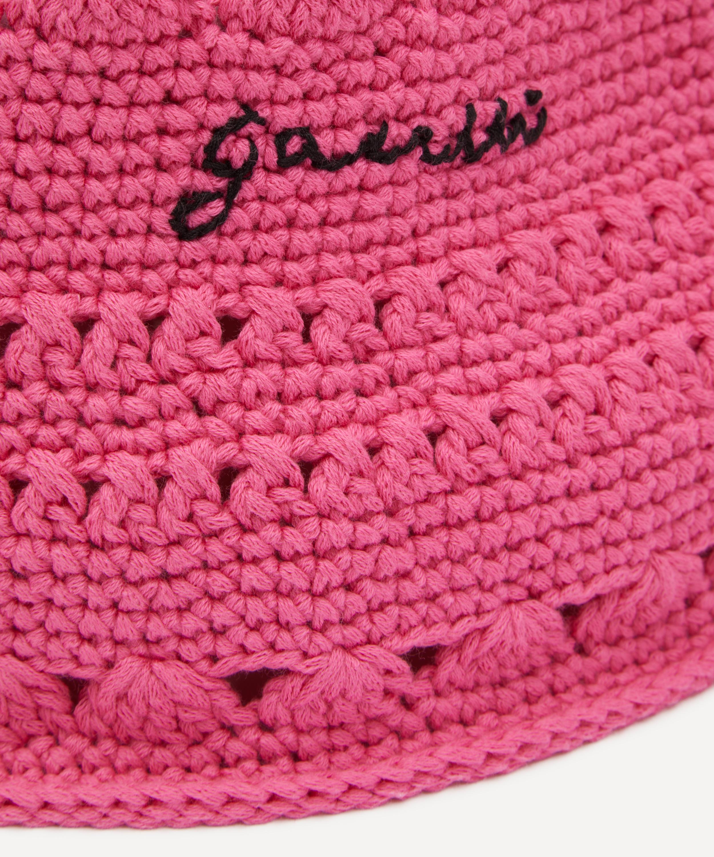 GANNI updates the classic bucket hat in colourful crochet for a Scandi-cool finish. Knitted from 100% certified organic cotton, this shocking-pink hat is embellished with black logo embroidery across its front.