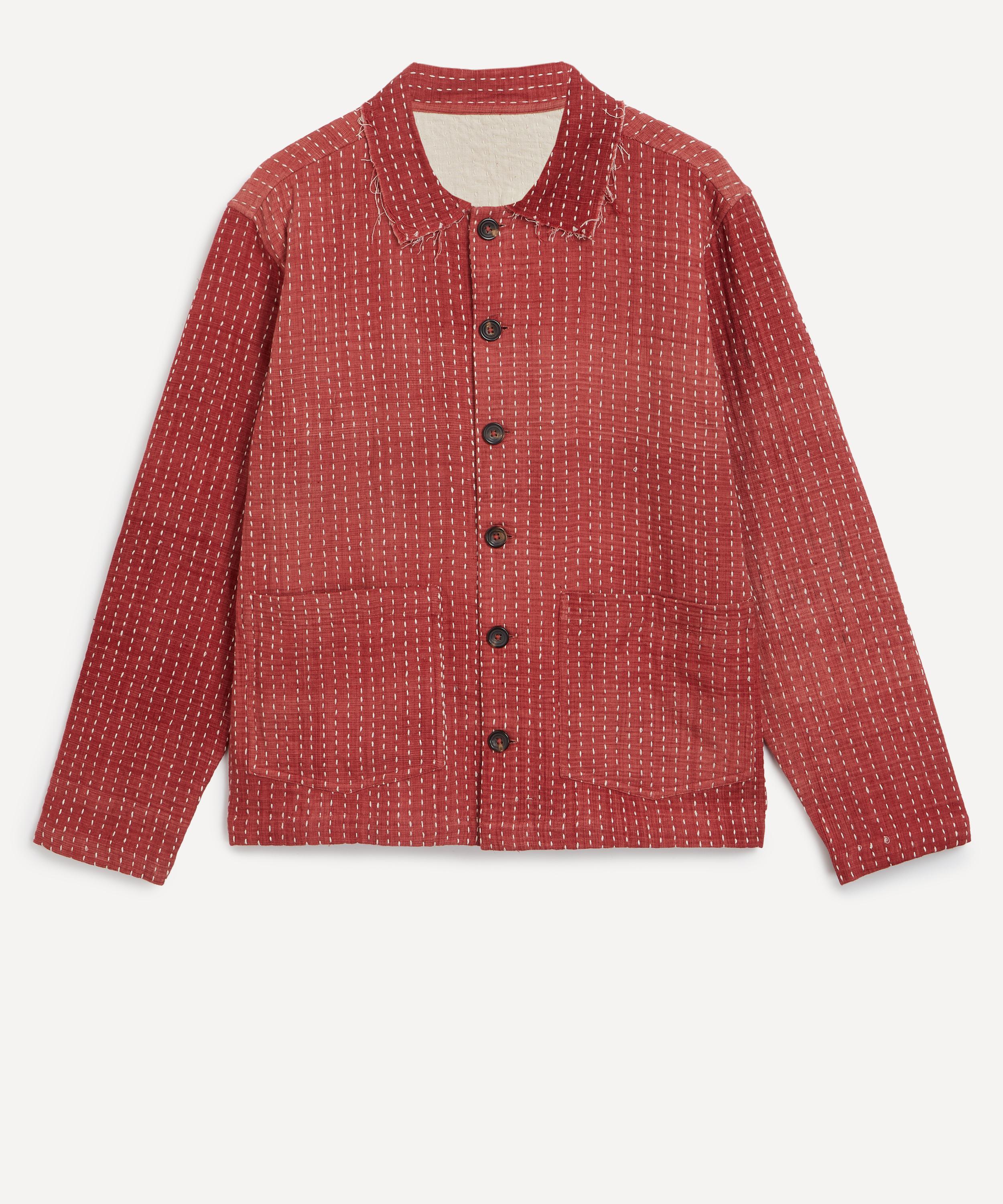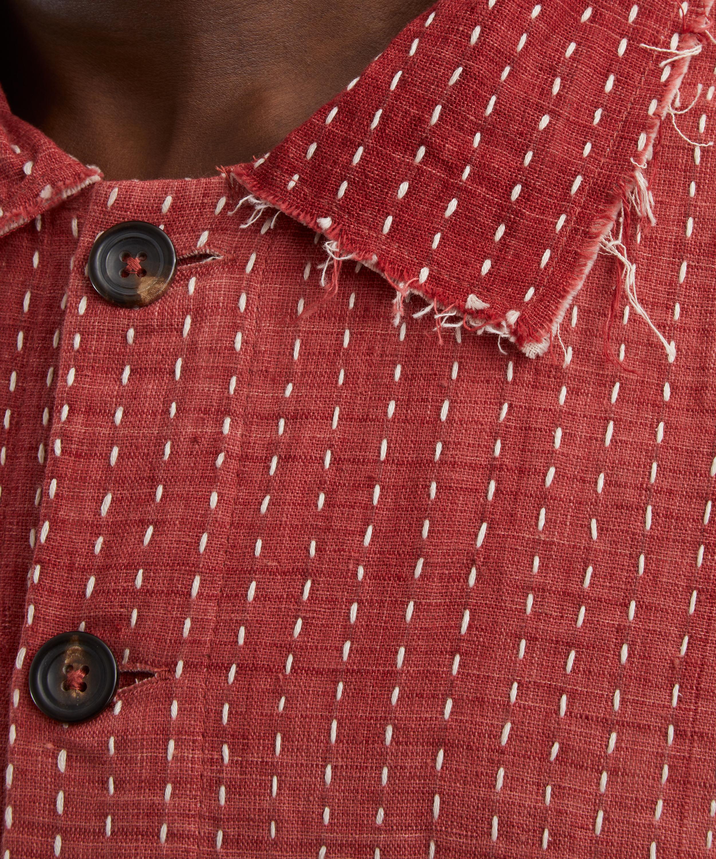 Made from hand-loomed cotton, this jacket is adorned with a hand-embroidered pattern and frayed edges, adding a unique and artisanal touch. A button closure, patch pockets and a classic spread collar enhance the refined silhouette, making this piece a tailored essential that effortlessly blends craftsmanship with utilitarian style.