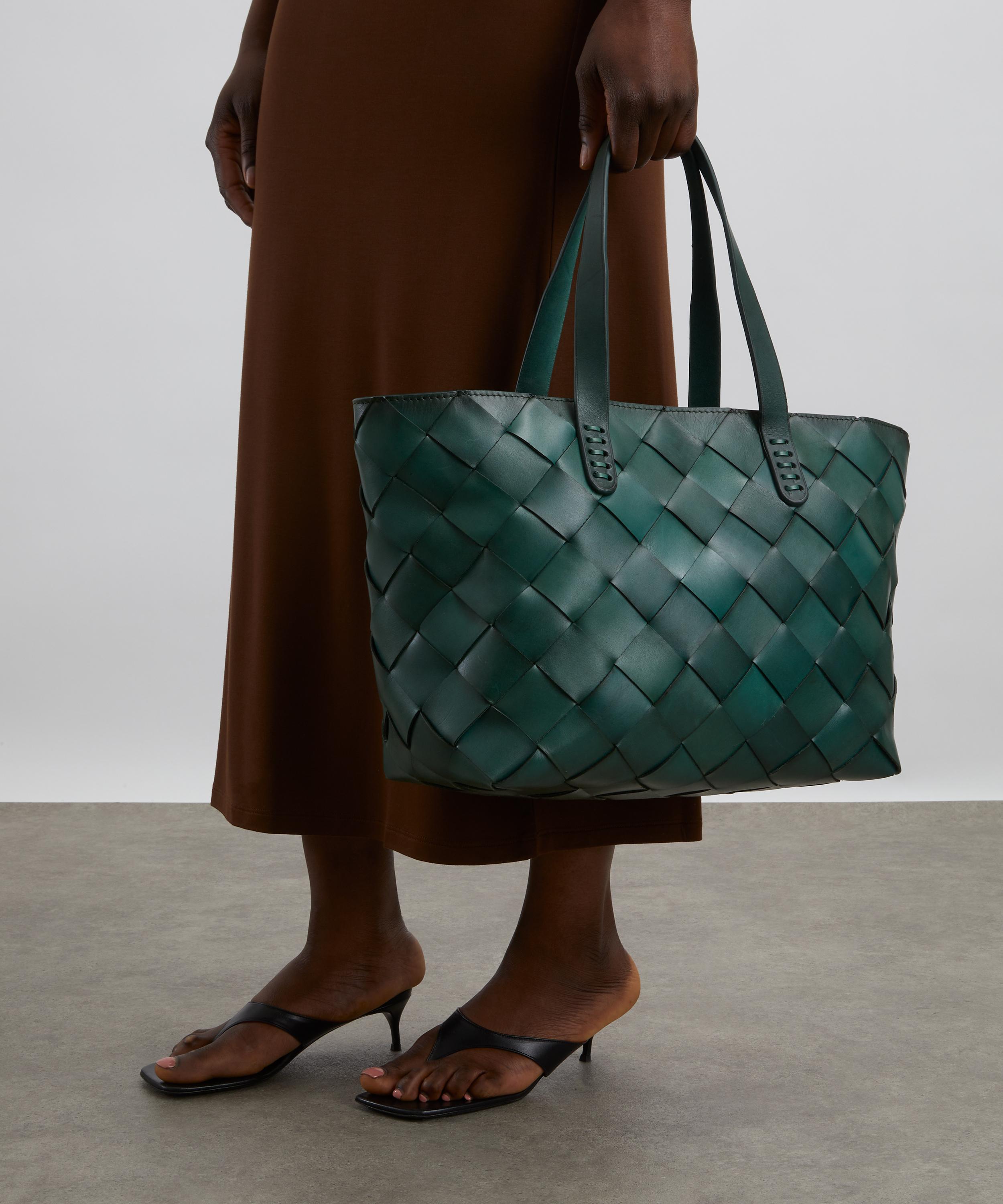 Inject some bohemian charm into everyday looks with the Crossover tote bag from Dragon Diffusion. Handcrafted by skilled artisans from smooth leather, using traditional basket weaving techniques, it’s more than just an accessory – it’s a celebration of craftmanship. Its coastal-inspired silhouette features a unique weaving pattern of wide strips that cross to form elegant lozenges. Equipped with a spacious interior to accommodate your daily essentials and two comfortable top handles, it’s perfect for sunny market strolls, weekend getaways or effortless everyday styling.