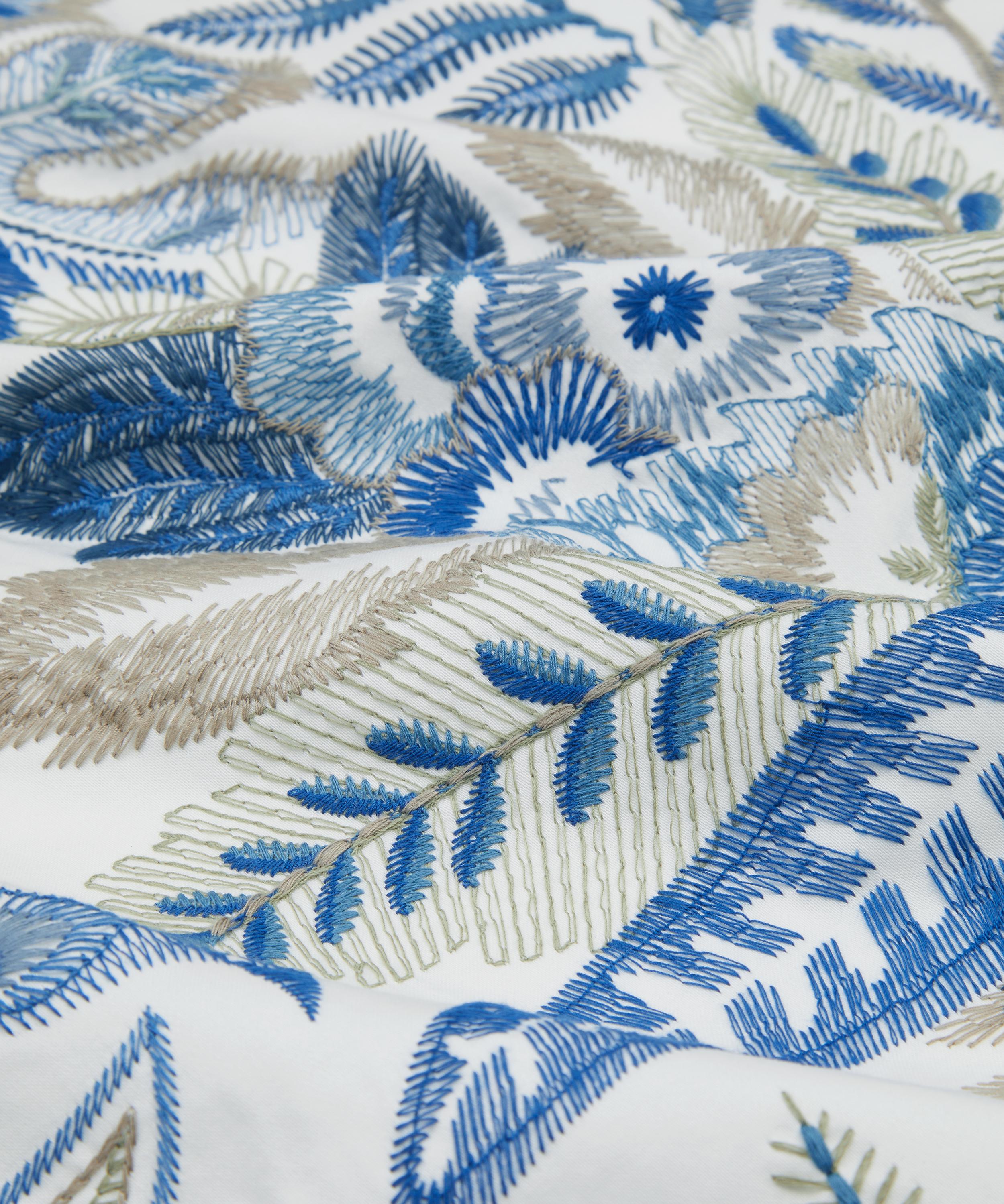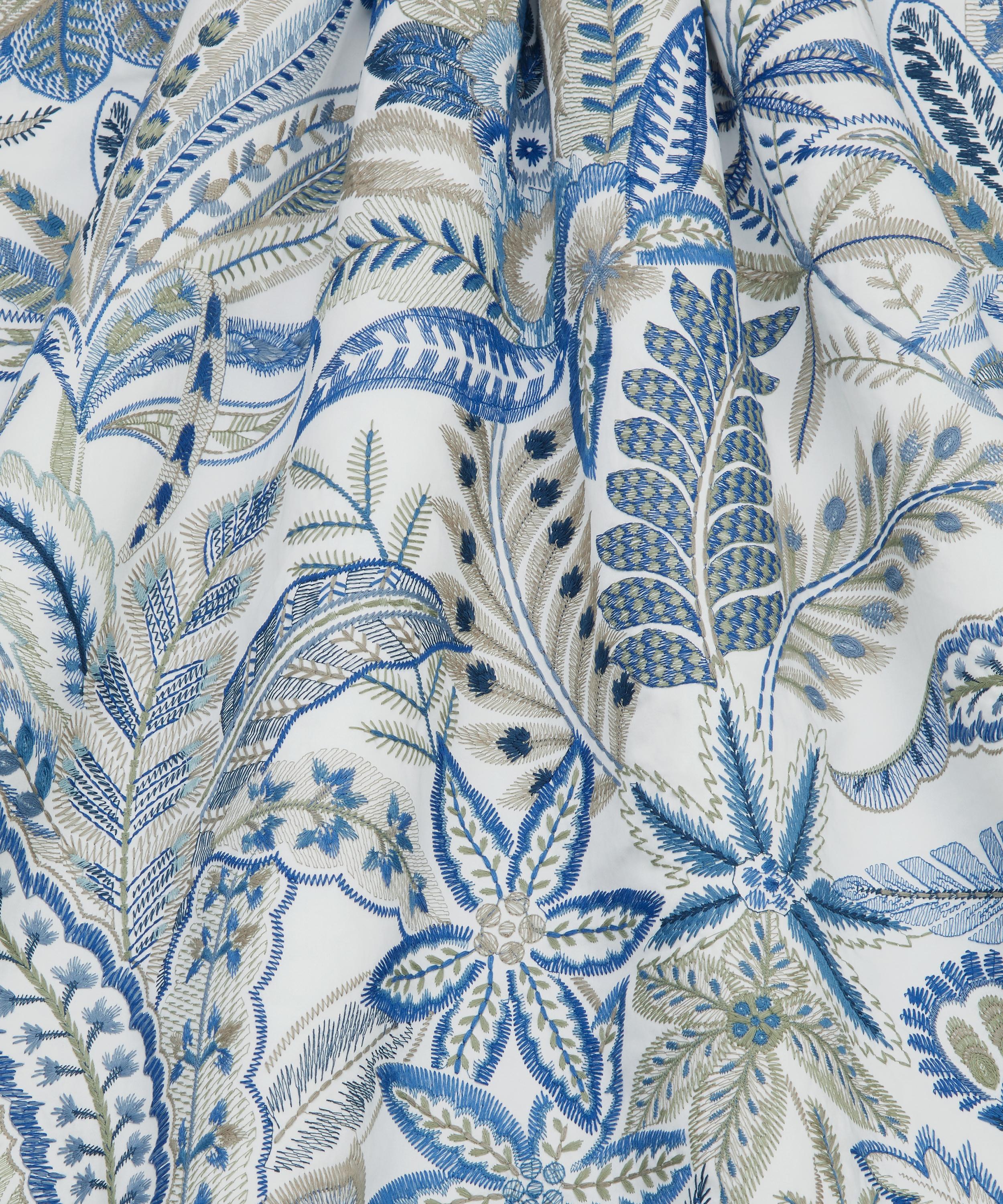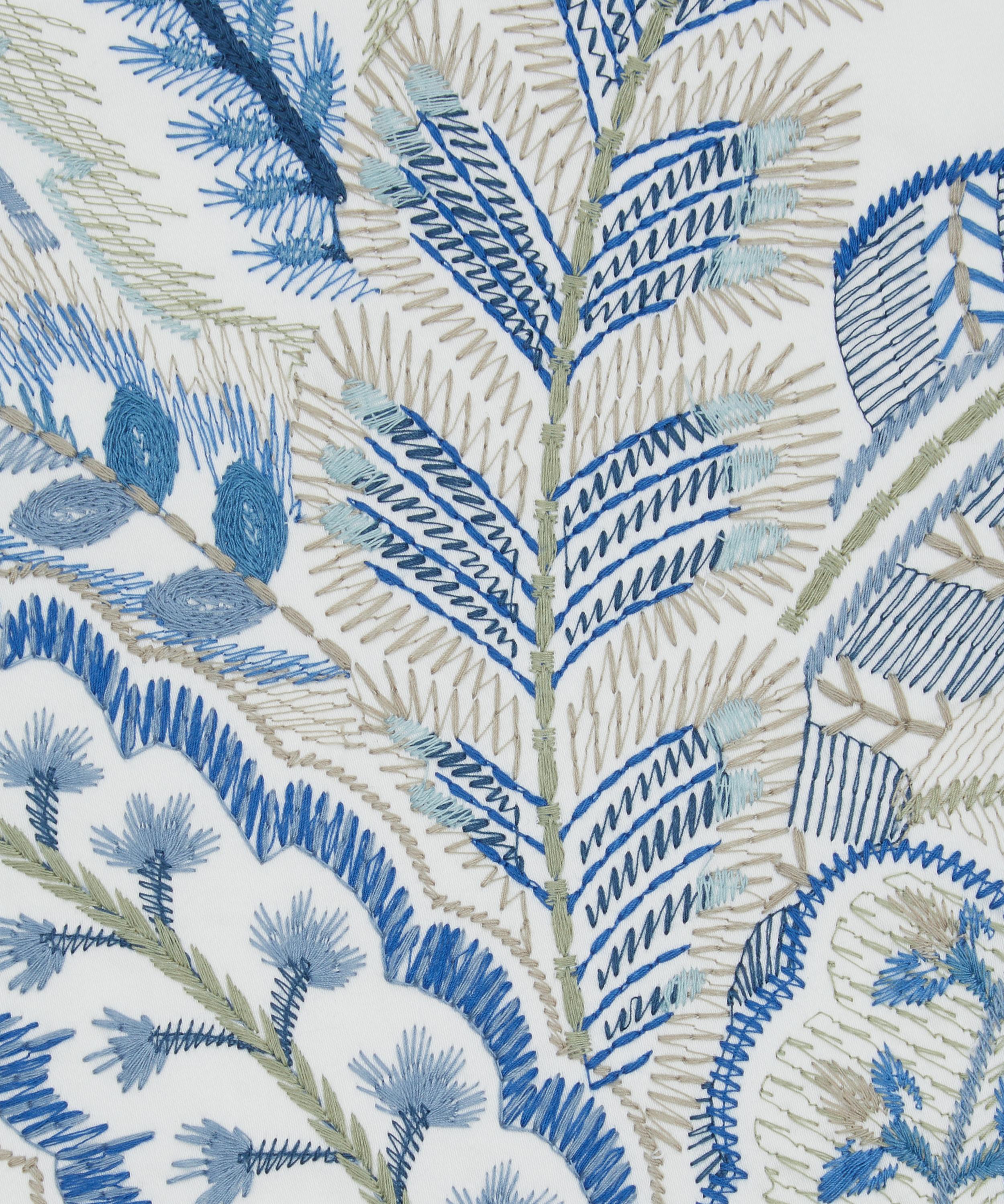 Now rendered for the first time as a beautiful densely embroidered fabric, this design is a truly spectacular botanical paisley of tropical palms, feathery fronds, and graceful ferns. Embroidered using matte yarns on a rich cotton base, suitable for light domestic upholstery, drapery, cushions, and accessories. Cypress Stitch is an interpretation of Cypress Voyage, a sumptuous wallpaper design in the Botanical Atlas collection, printed on grass cloth in four colour stories.