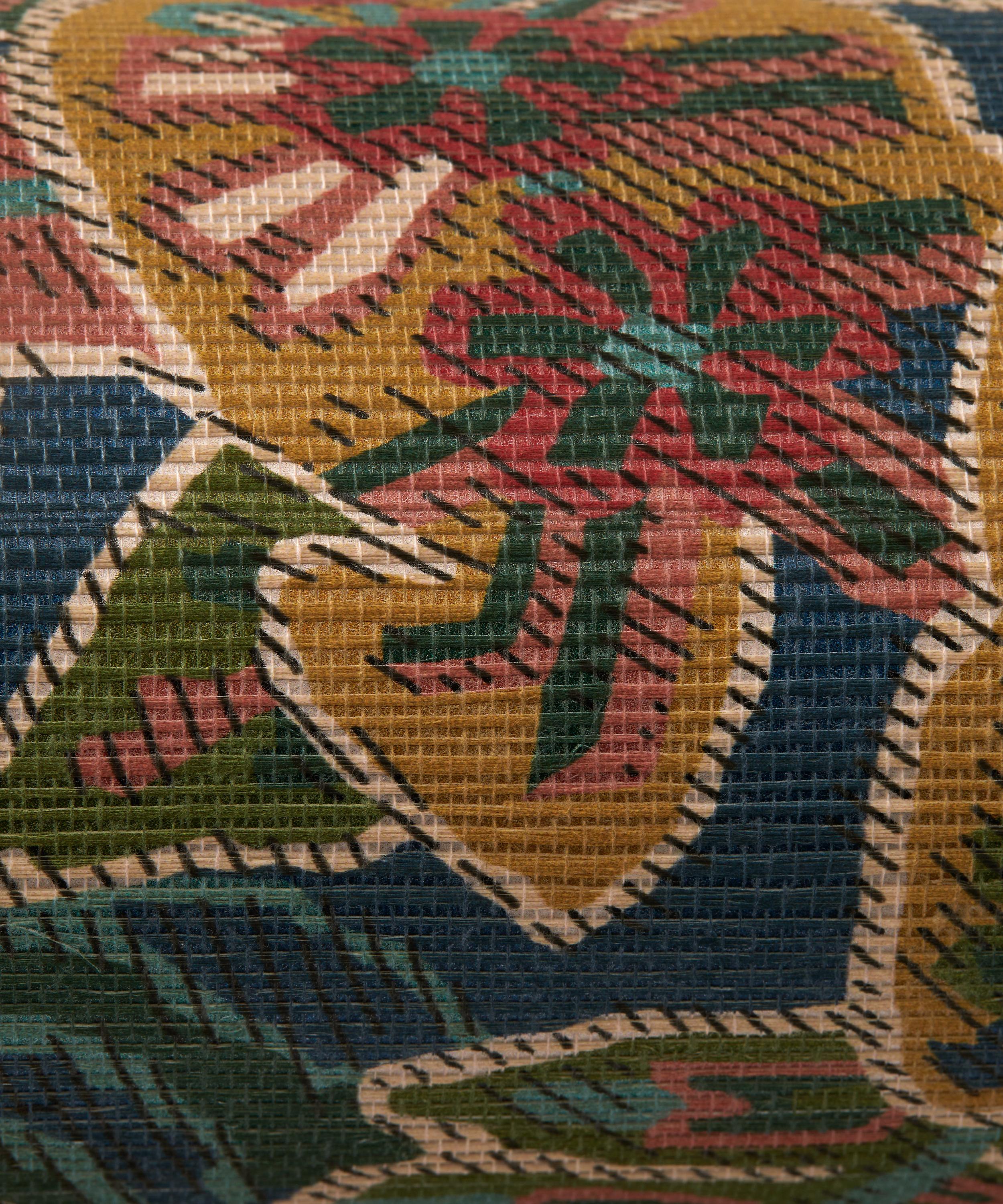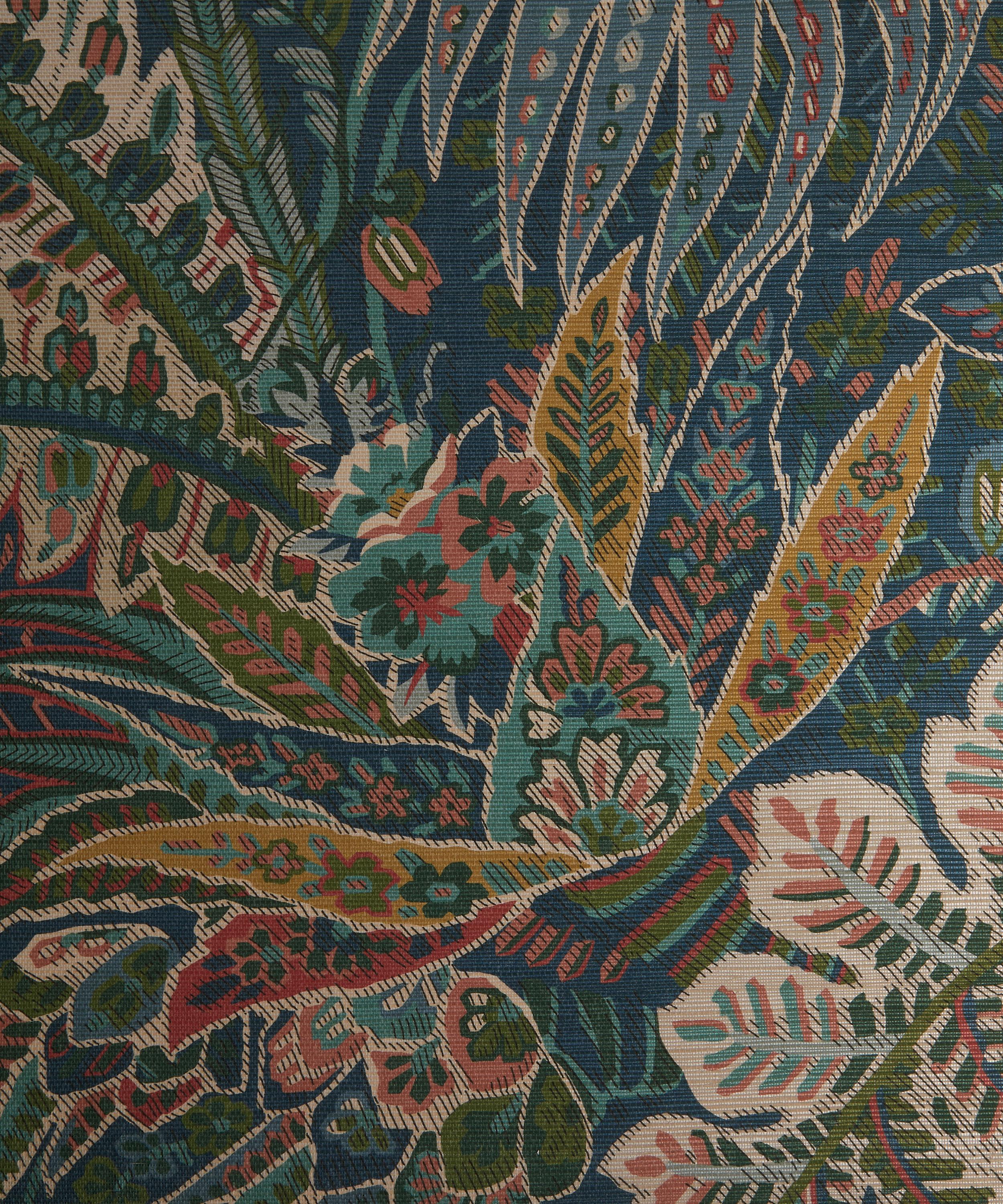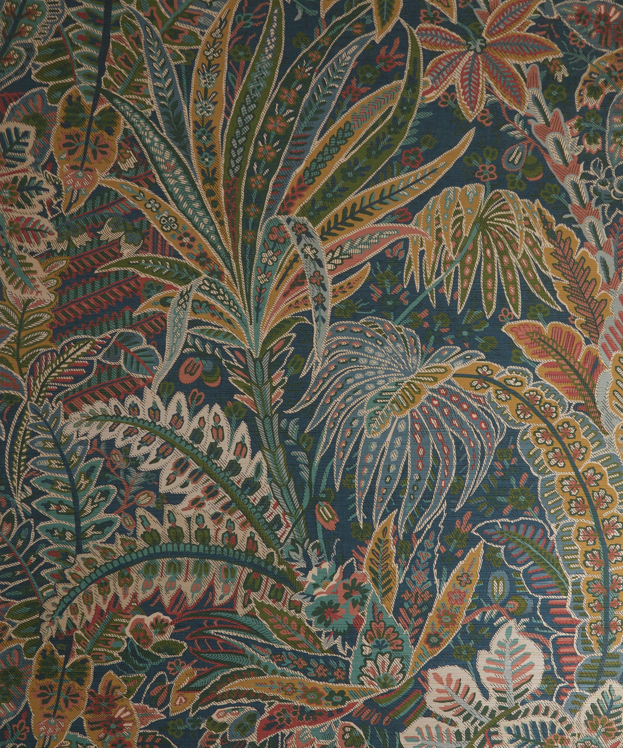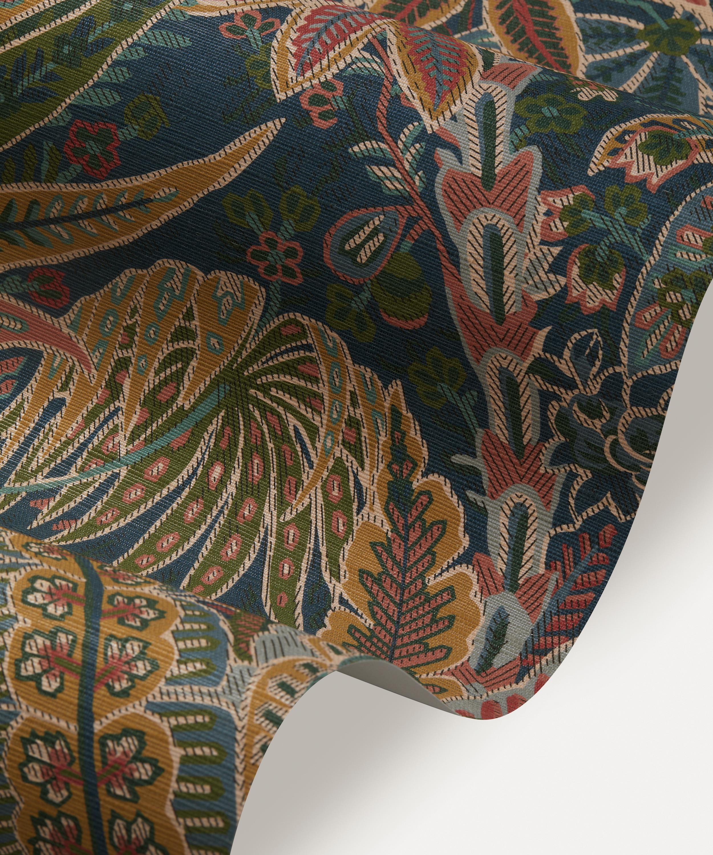 Inspired by mid-19th century hand painted shawls from the Liberty archive, Cypress Voyage has been reworked into a brand-new layout, drawing on Persian Voyage design. Printed on a grass-cloth base, it features a botanical paisley of tropical palms, feathery fronds, and ferns in vivid colours.