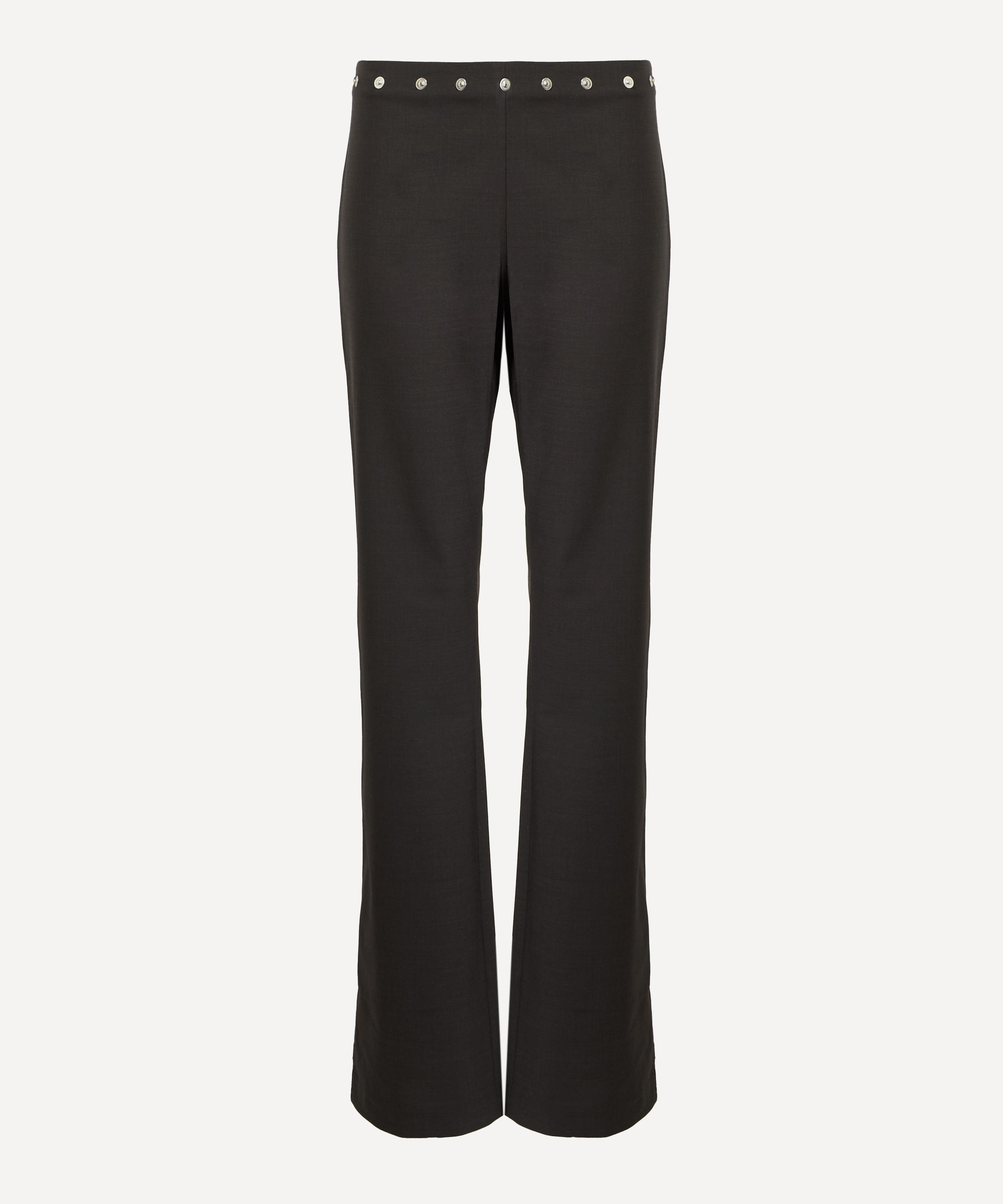 Crafted from classic suiting fabric, these brown trousers feature a loose, straight fit complete with a studded low-rise waist.