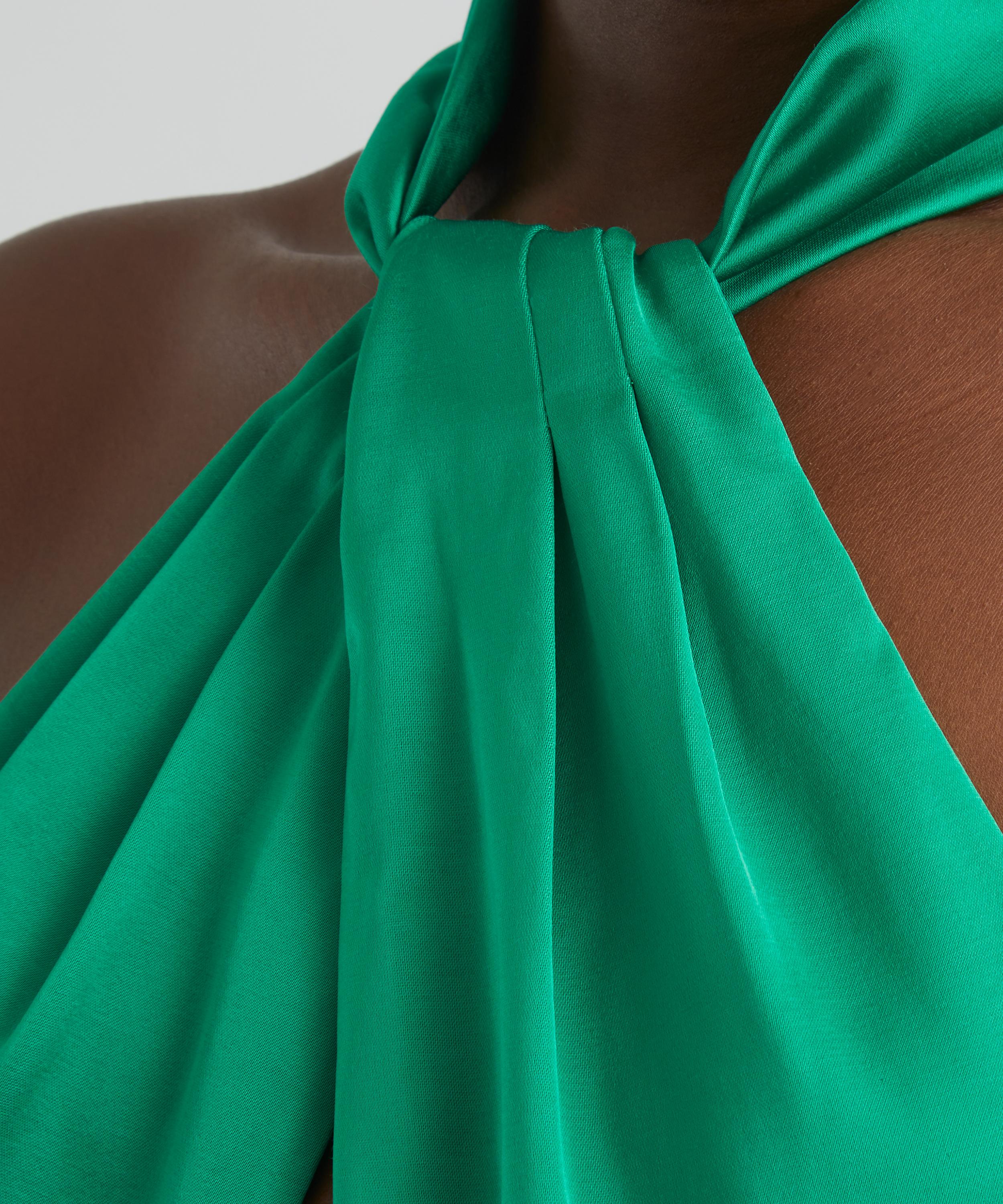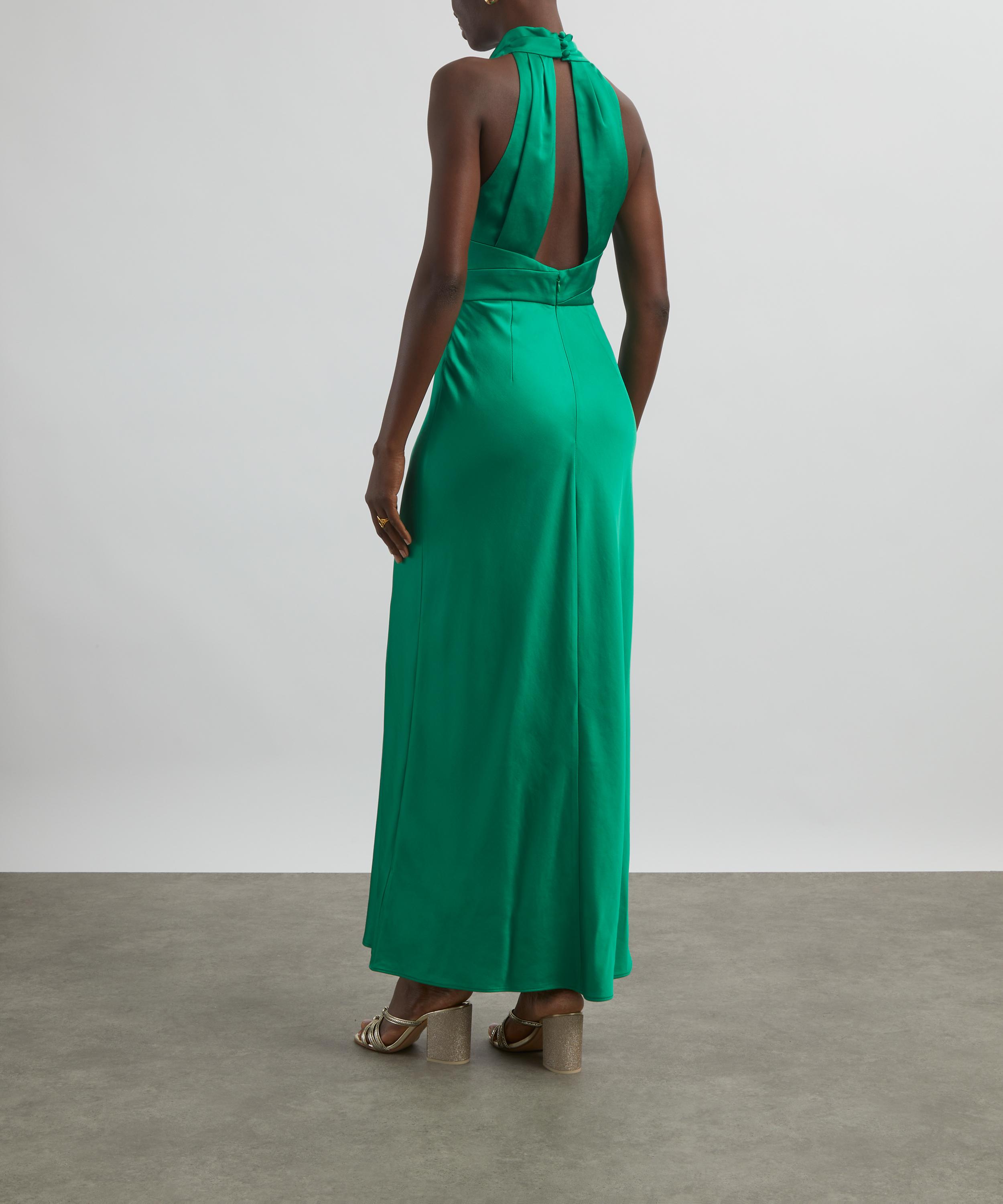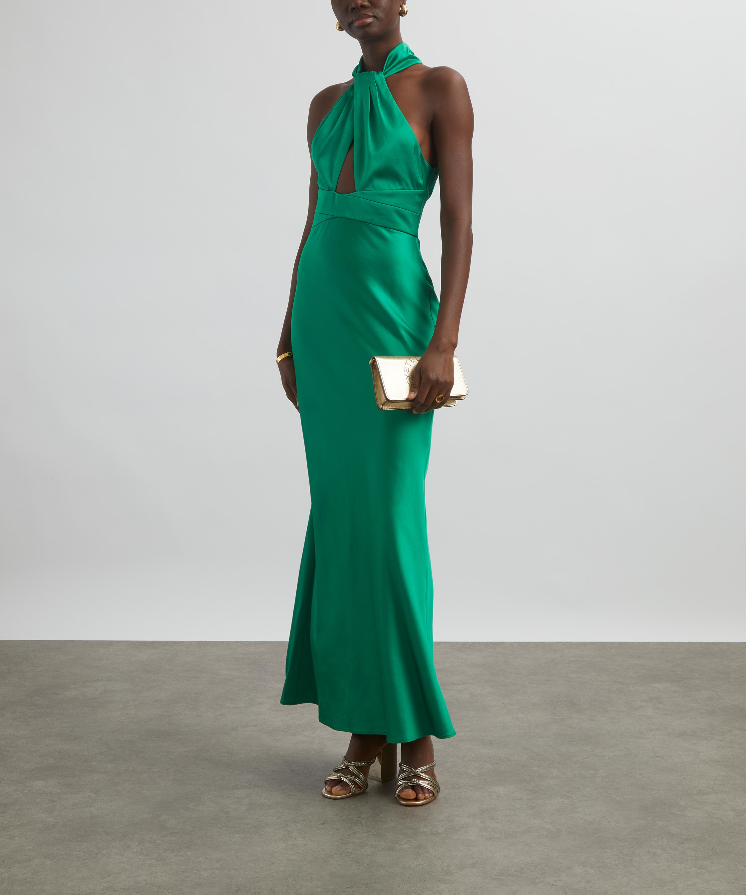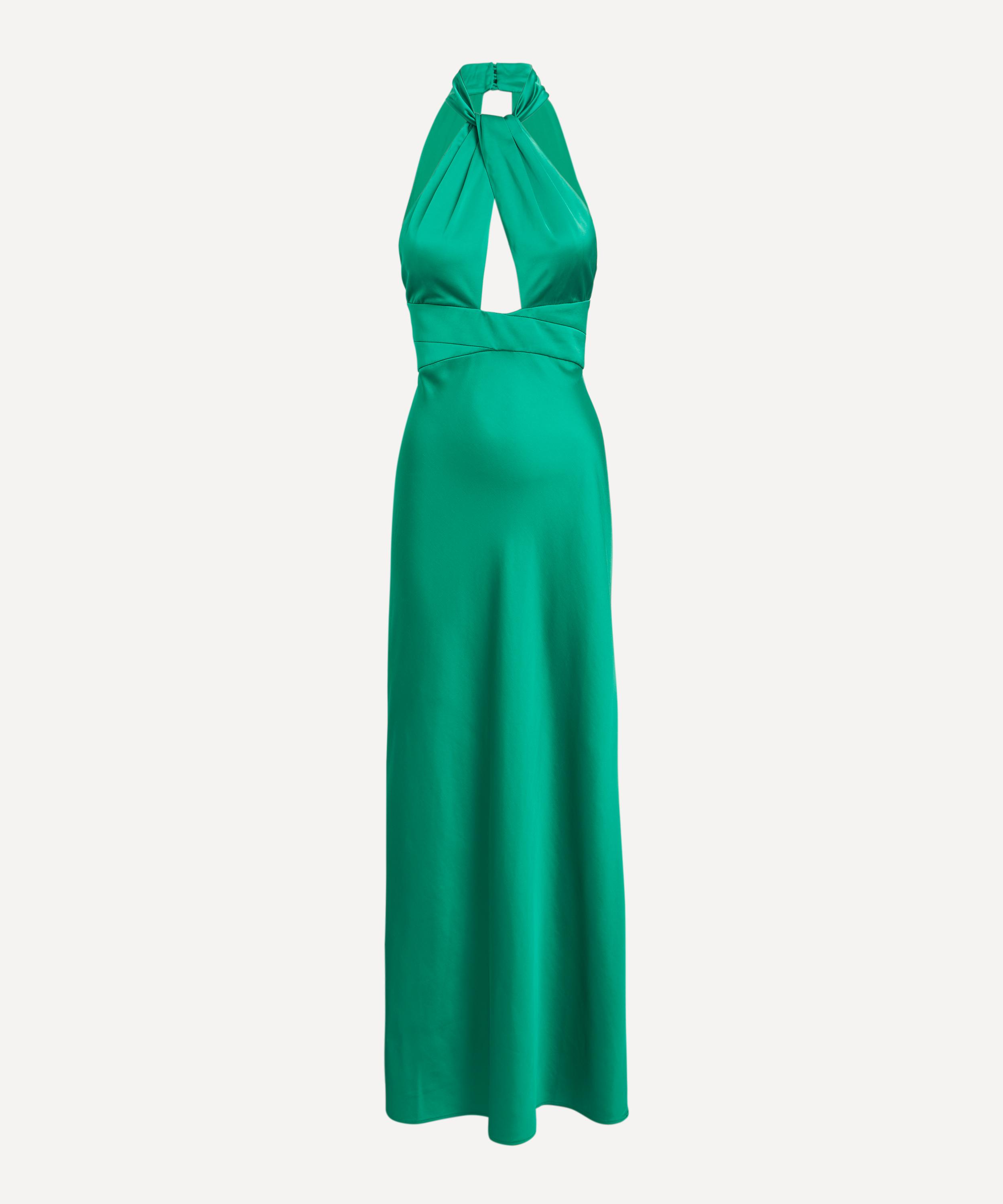 Destined for event season, the Danika Sleeveless dress in Emerald satin is a true statement piece. Designed to be fitted at the bodice before seamlessly floating towards the hem, its twisted halter neckline is complimented with a cut-out detail at the front and back.