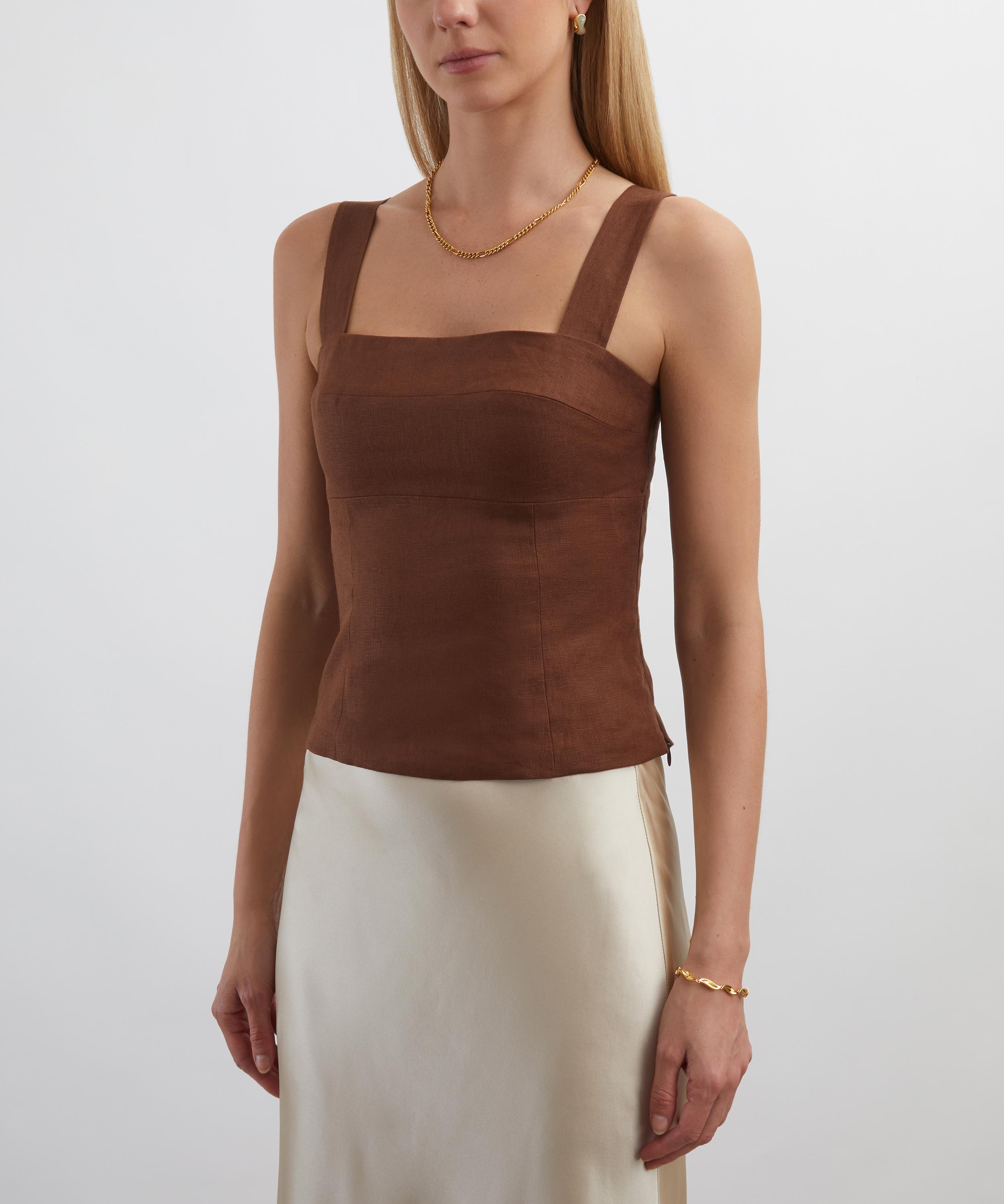 Look good and feel good in the Darci Chocolate Cake Linen Top from cult LA label Reformation, where effortless style meets conscious design.