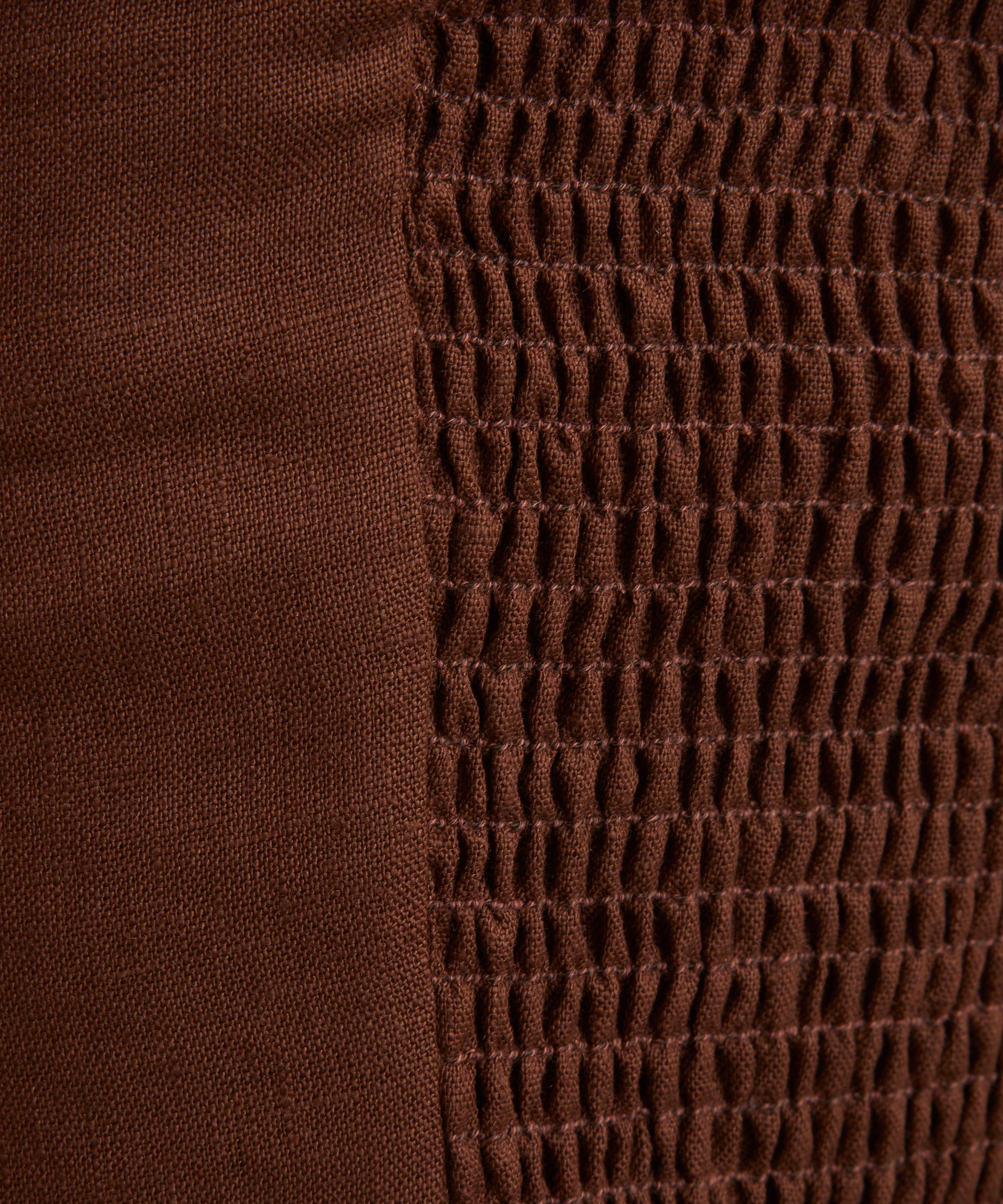 Crafted from lightweight linen in Reformation’s exclusive Chocolate Cake colourway, the Darci top exudes effortless elegance. Designed to be fitted throughout, it’s minimally detailed with a square neckline and back smocking for a flattering, feminine shape.