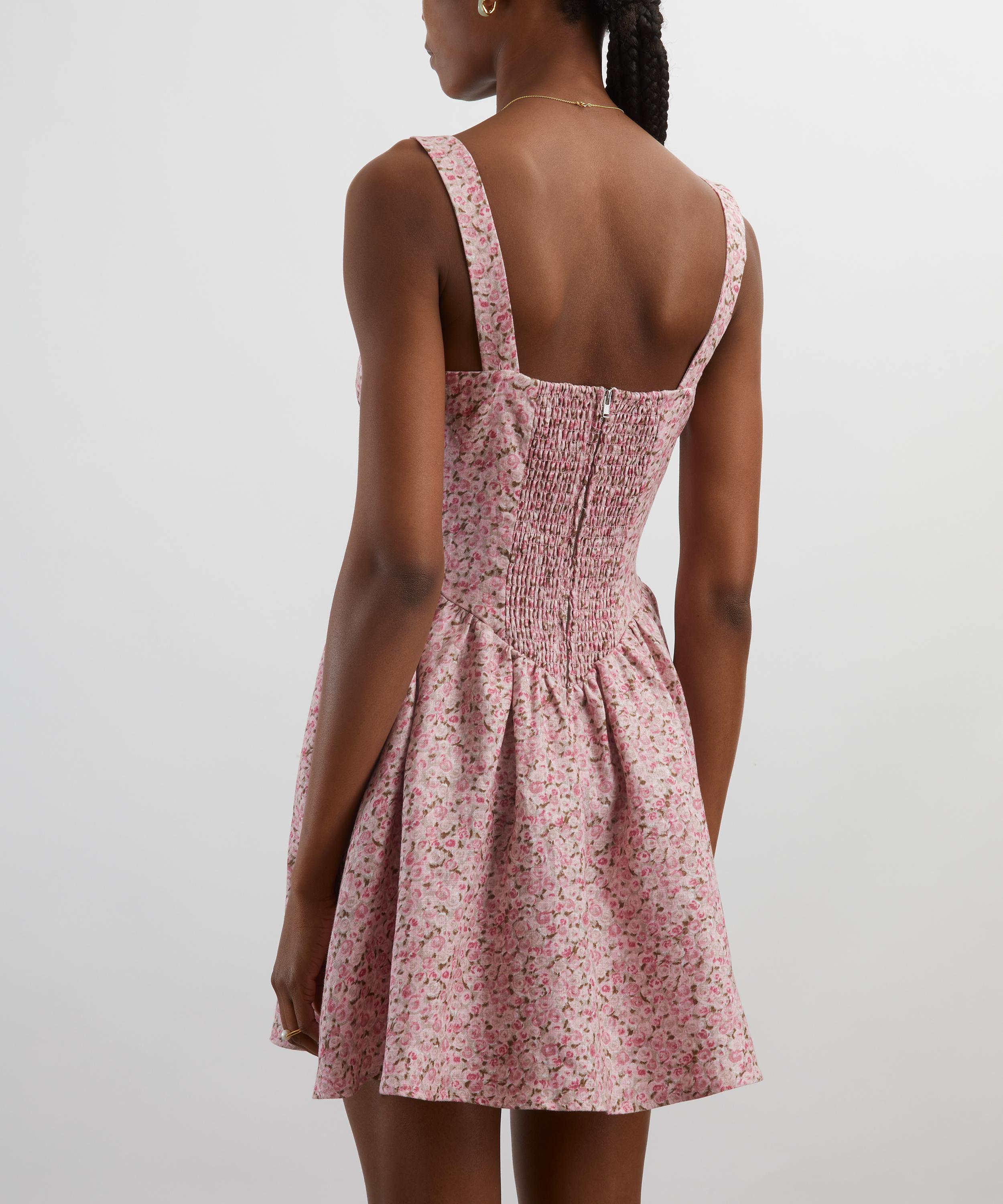 Crafted from lightweight linen featuring a delicate ditsy floral print, the Daria Dress radiates effortless charm. Designed with a scoop neckline, gathered bust, and back smocking, its figure-skimming bodice transitions into a graceful A-line mini skirt for a romantic, feminine touch.