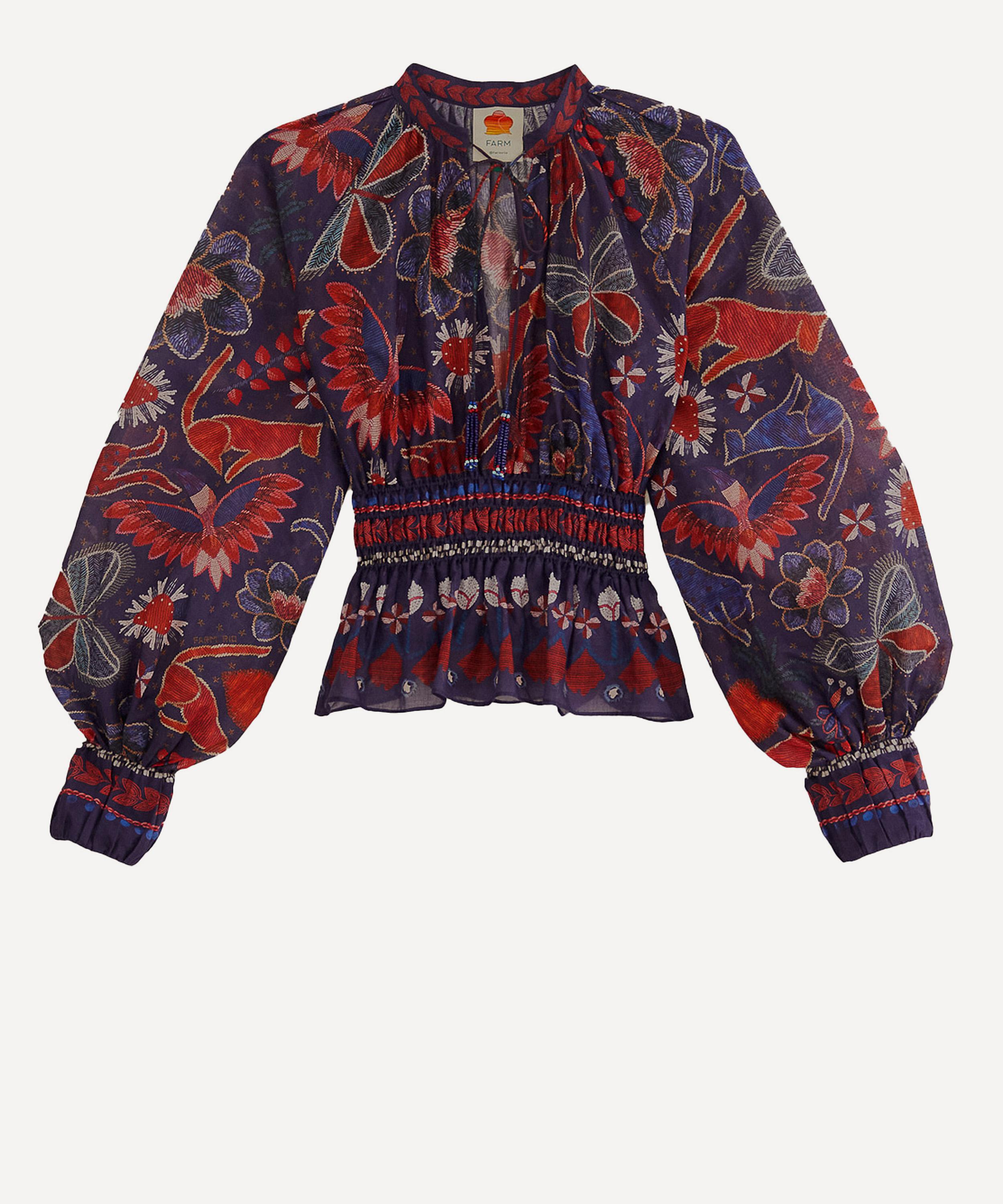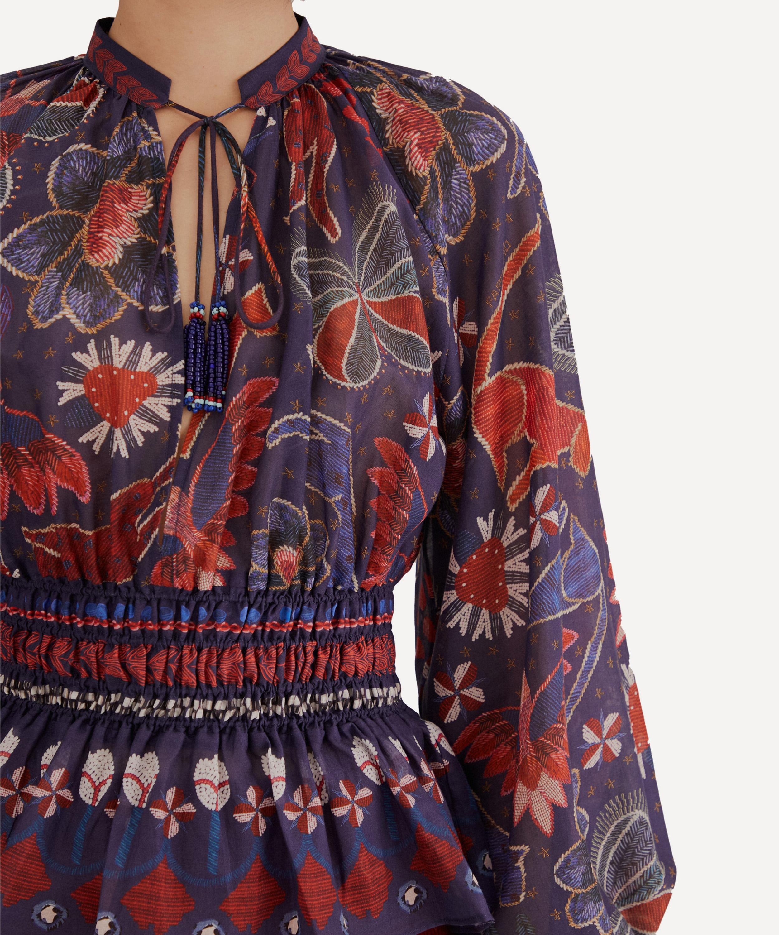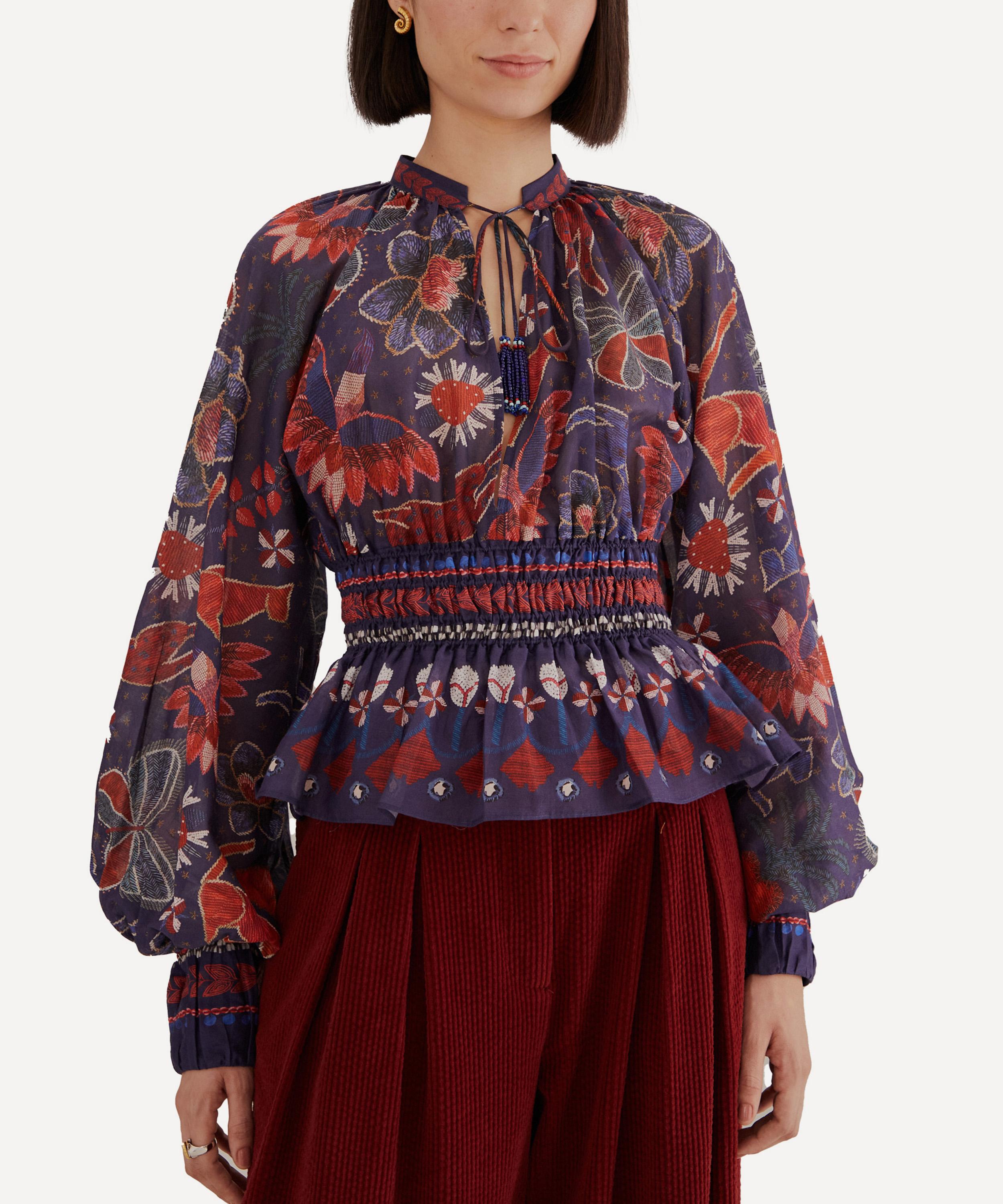 Adorned all-over in the bold and blooming Dark Blue Tropical Shine pattern, this flouncy cotton blouse features voluminous bouffant sleeves, and a deep V-neckline secured with beaded tassels. Effortlessly flattering with its fitted smocked waist, it’s finished with a peplum hem.