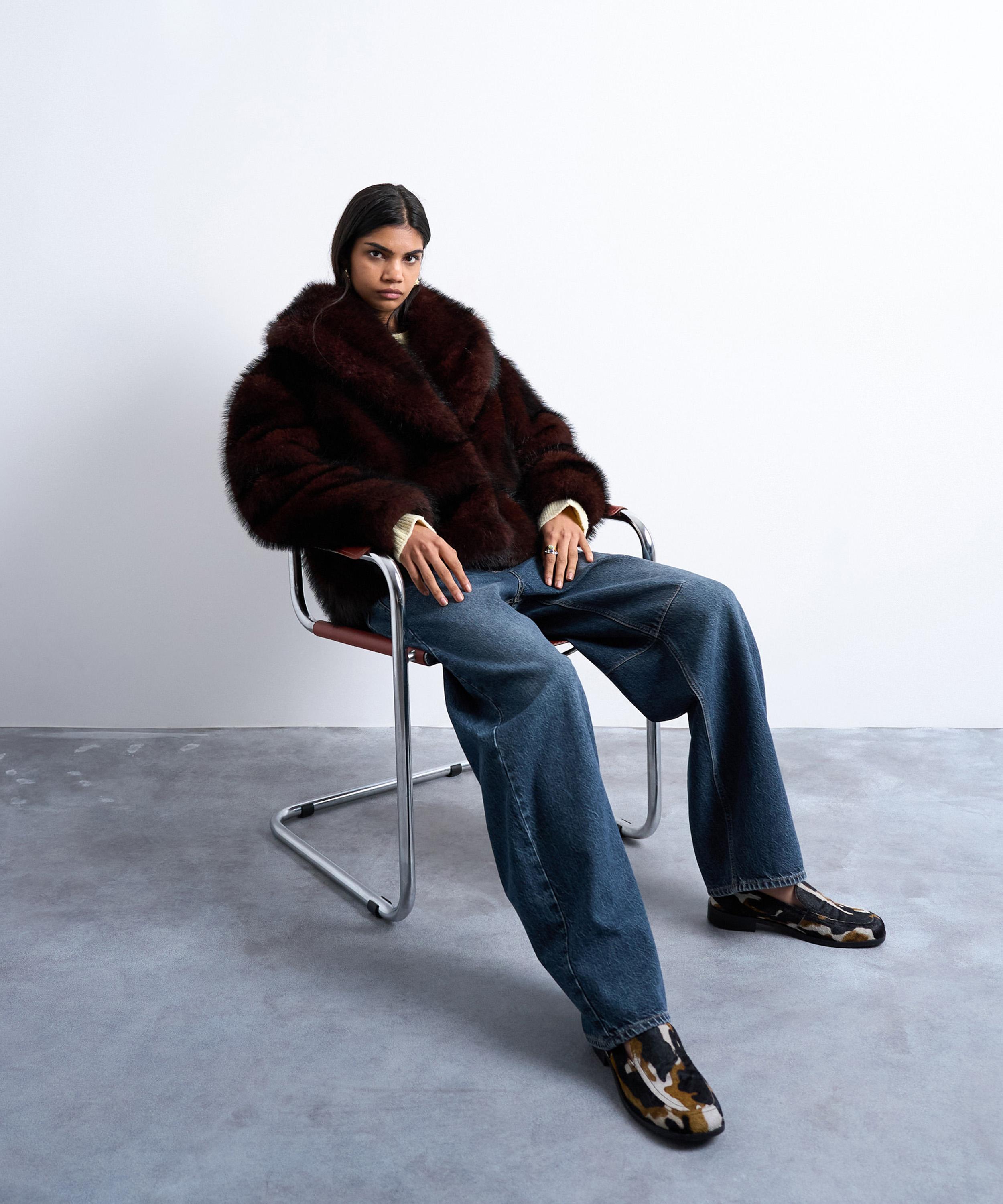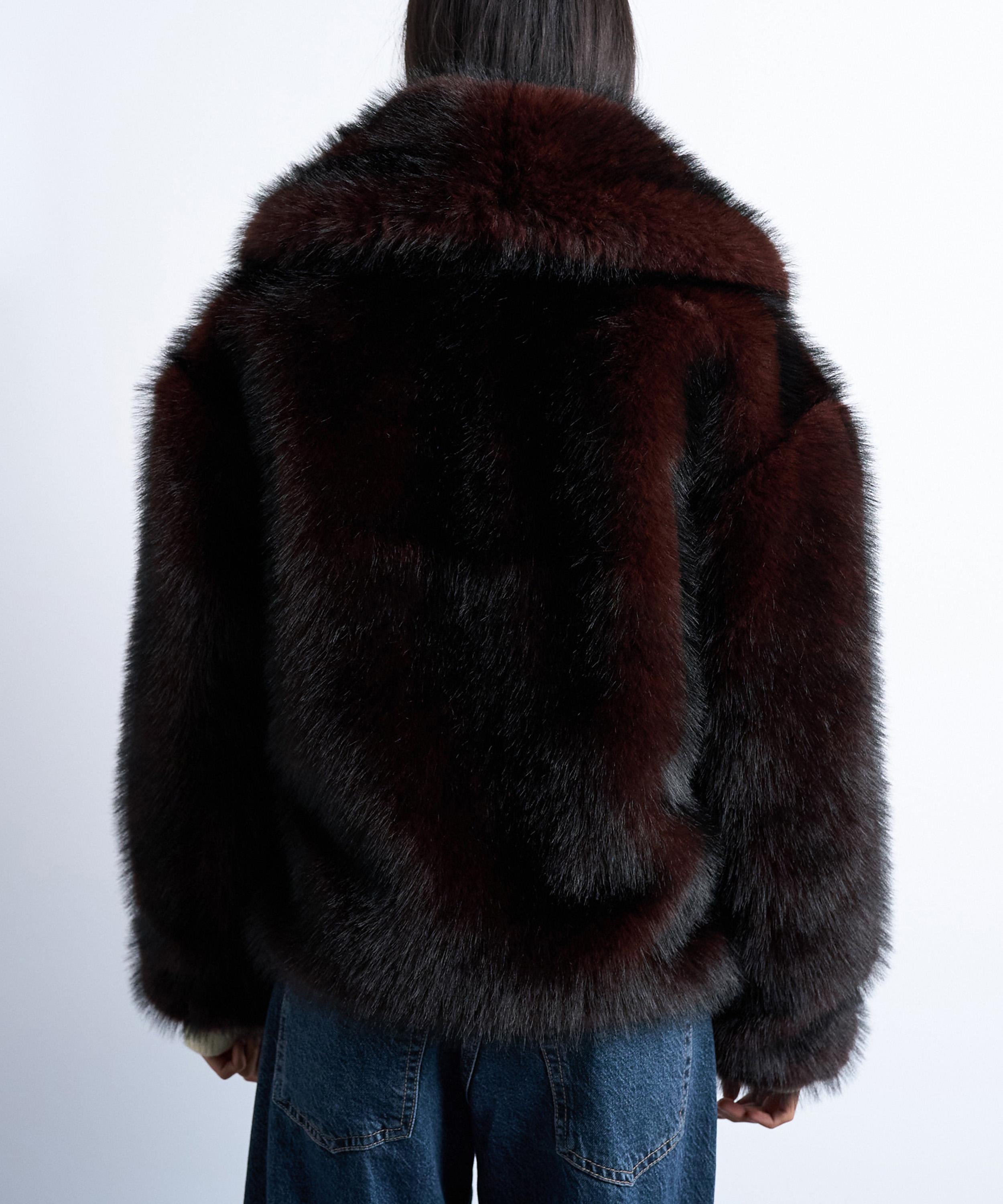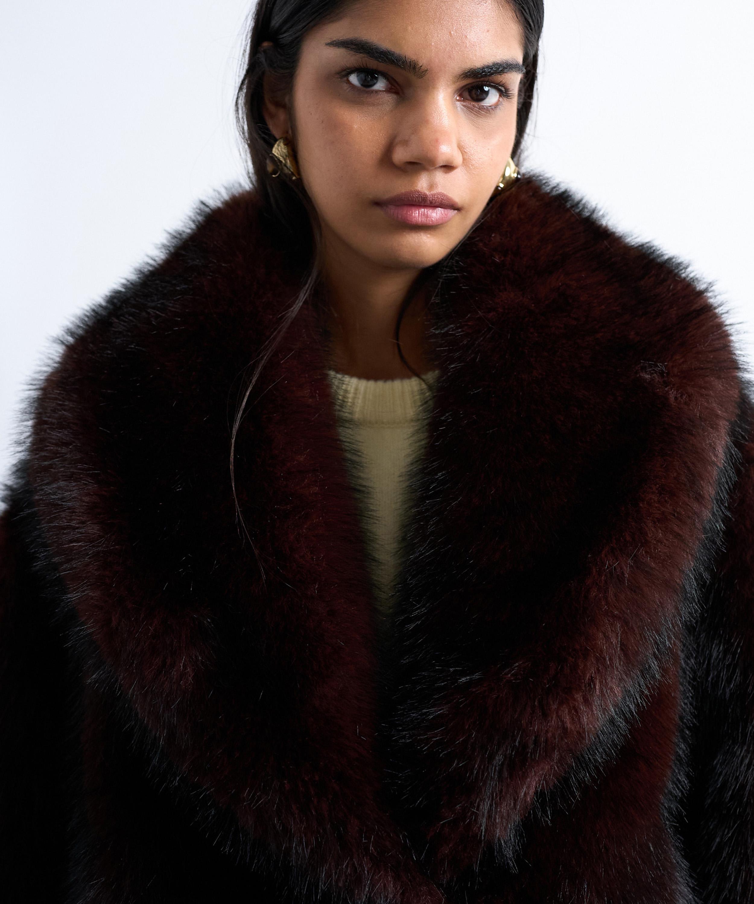 Crafted from plush, ultra-soft faux fur in a rich burgundy hue, this short coat is cut for a boxy fit and features an oversized shawl collar, concealed hook fastening, and full lining on the inside – making it the perfect winter warmer.