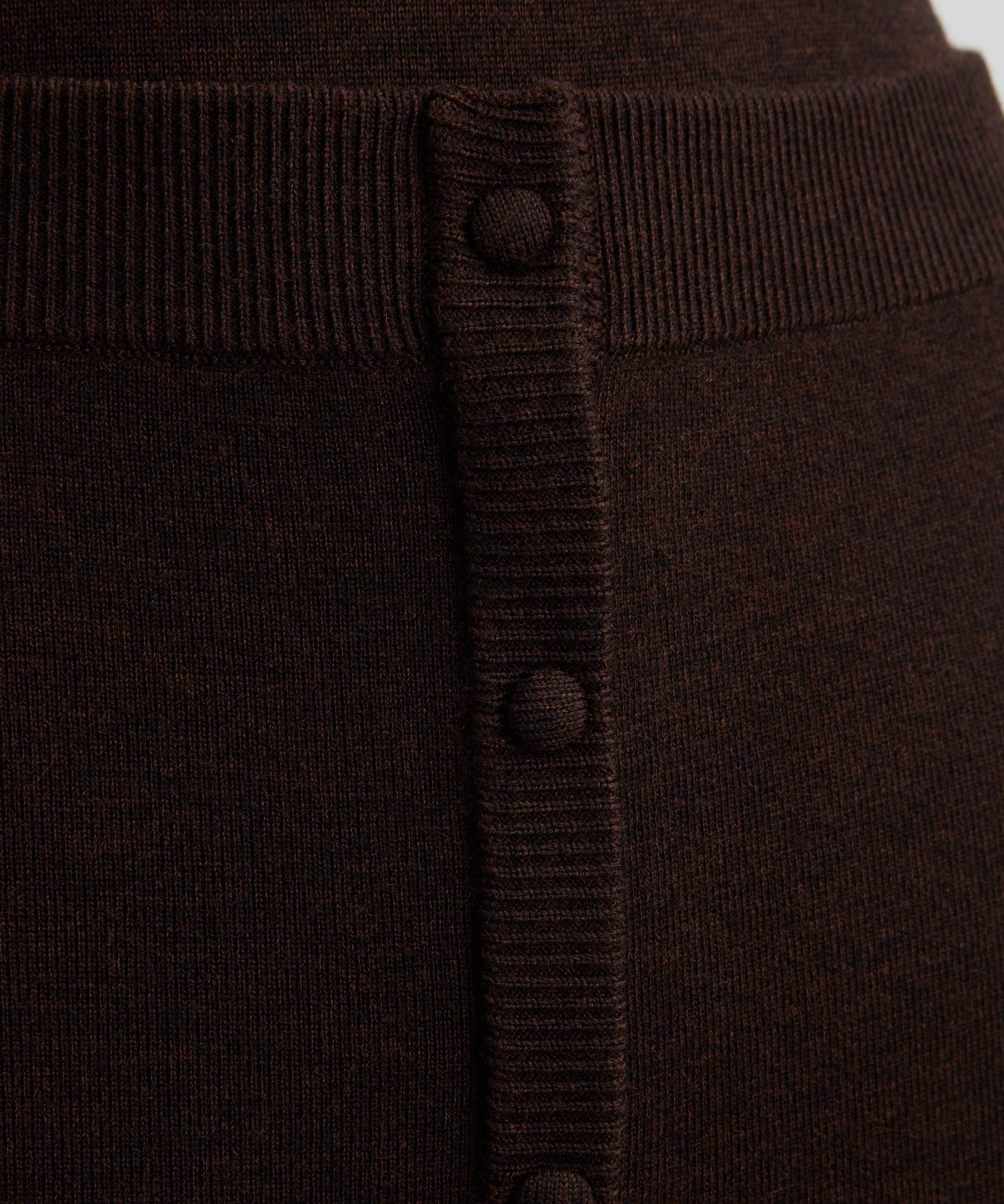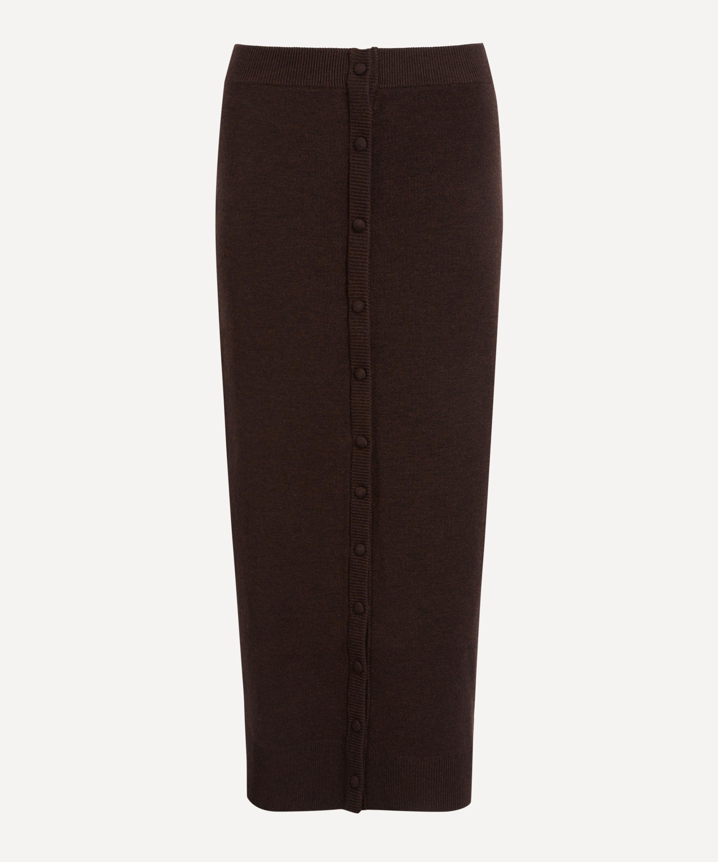 A modern twist on a classic silhouette, the Button Detail Midi Skirt features a front placket with knit-covered buttons, a ribbed stretch waistband, and a coordinating hem. In rich Dark Chocolate, its equal parts refined and contemporary.