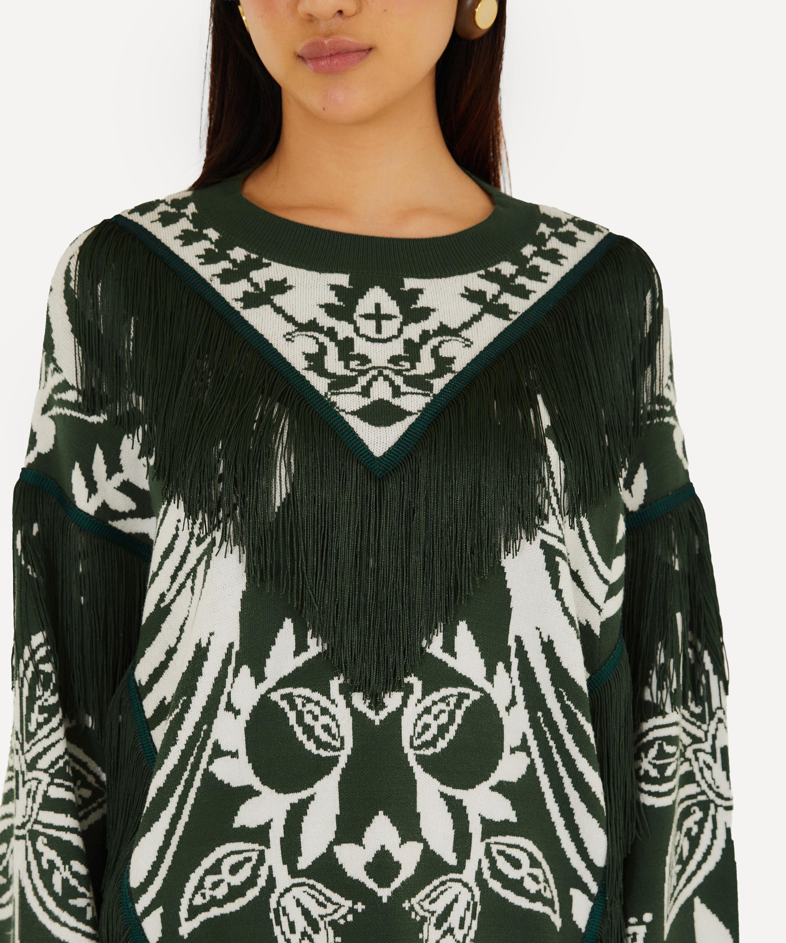 The Dark Green Miranda Fringes Knit Jumper from Rio de Janeiro-based label FARM Rio brings some Brazilian vivacity to your new-season edit.