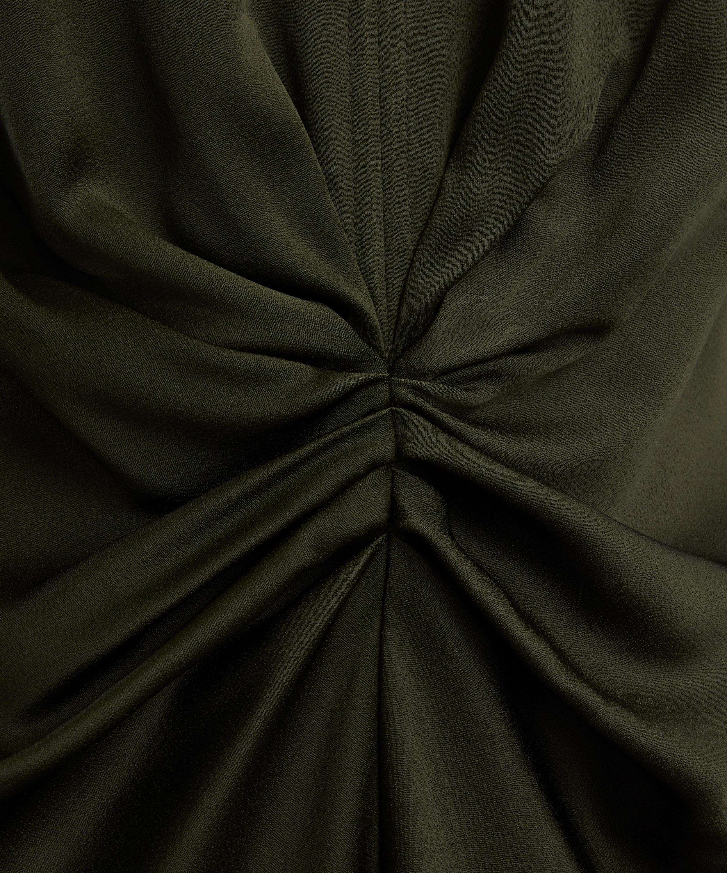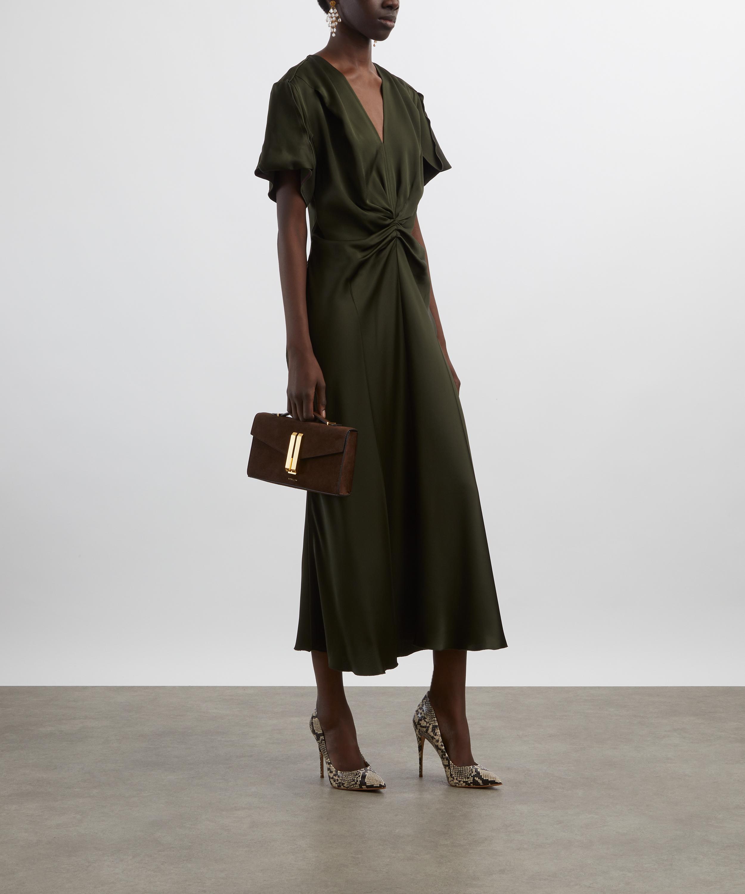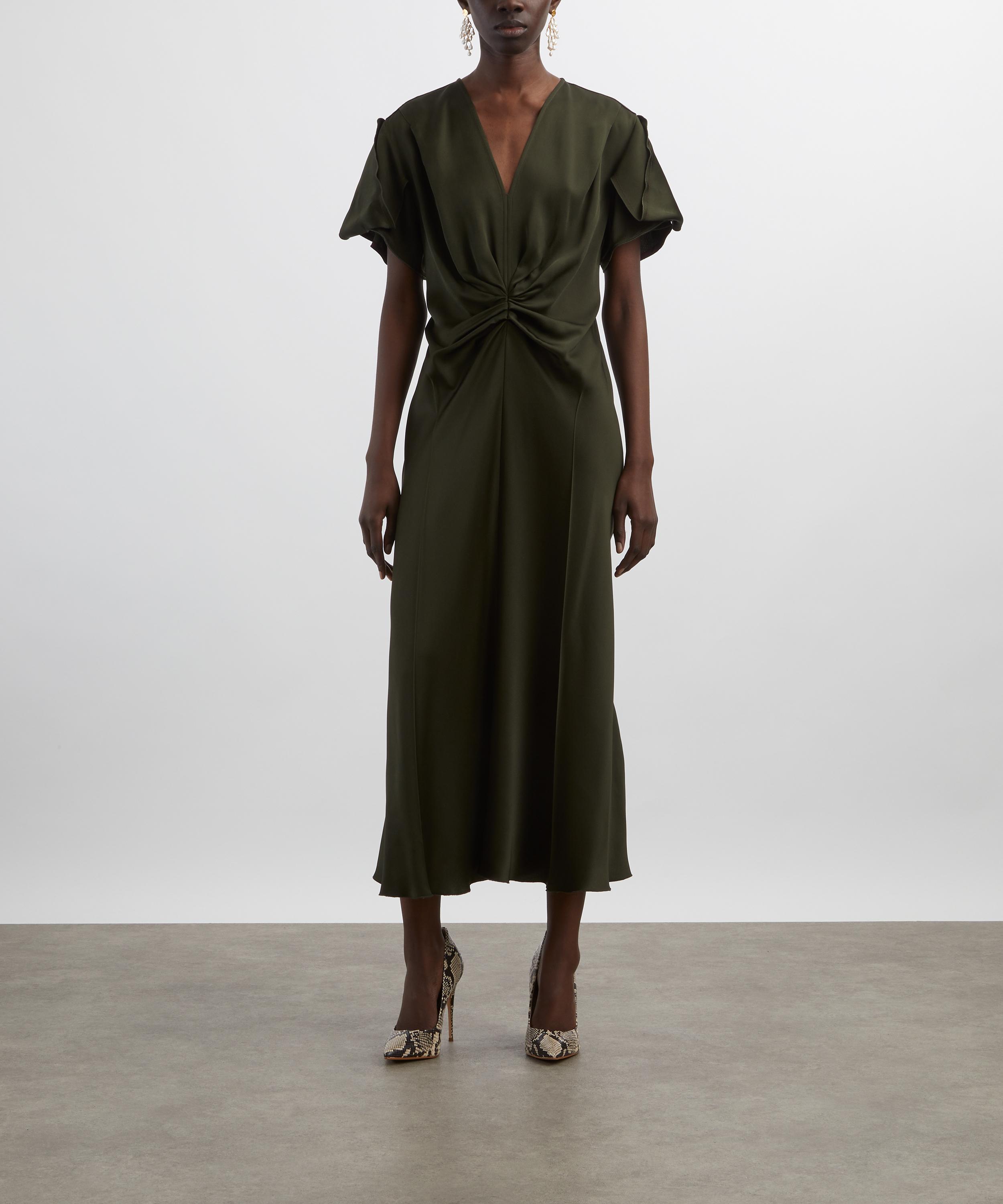 A signature house style, the Gathered V-Neck Midi Dress features a relaxed bodice and shaped waist for a flattering, informal silhouette. Pleats at the waist and shoulders add texture, while pressed details offer subtle structure. Cut in a dark olive hue for the new season, it’s finished with exposed seams, contrast topstitching, and an elongated back hem.