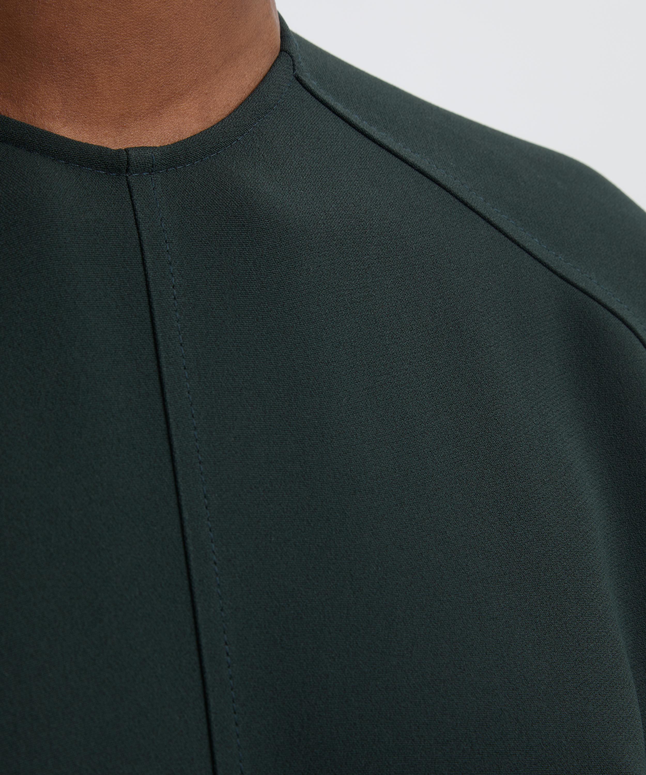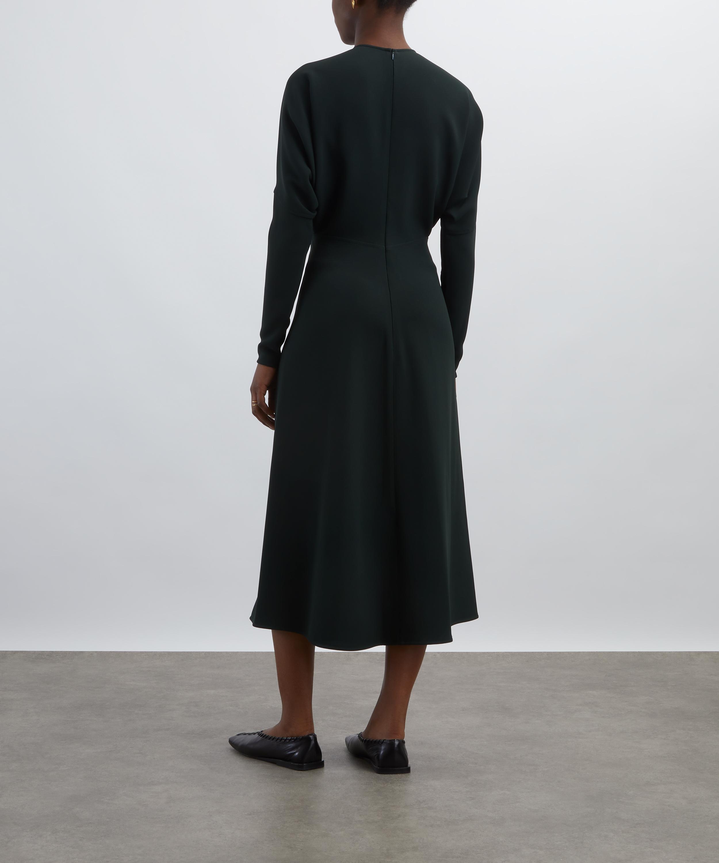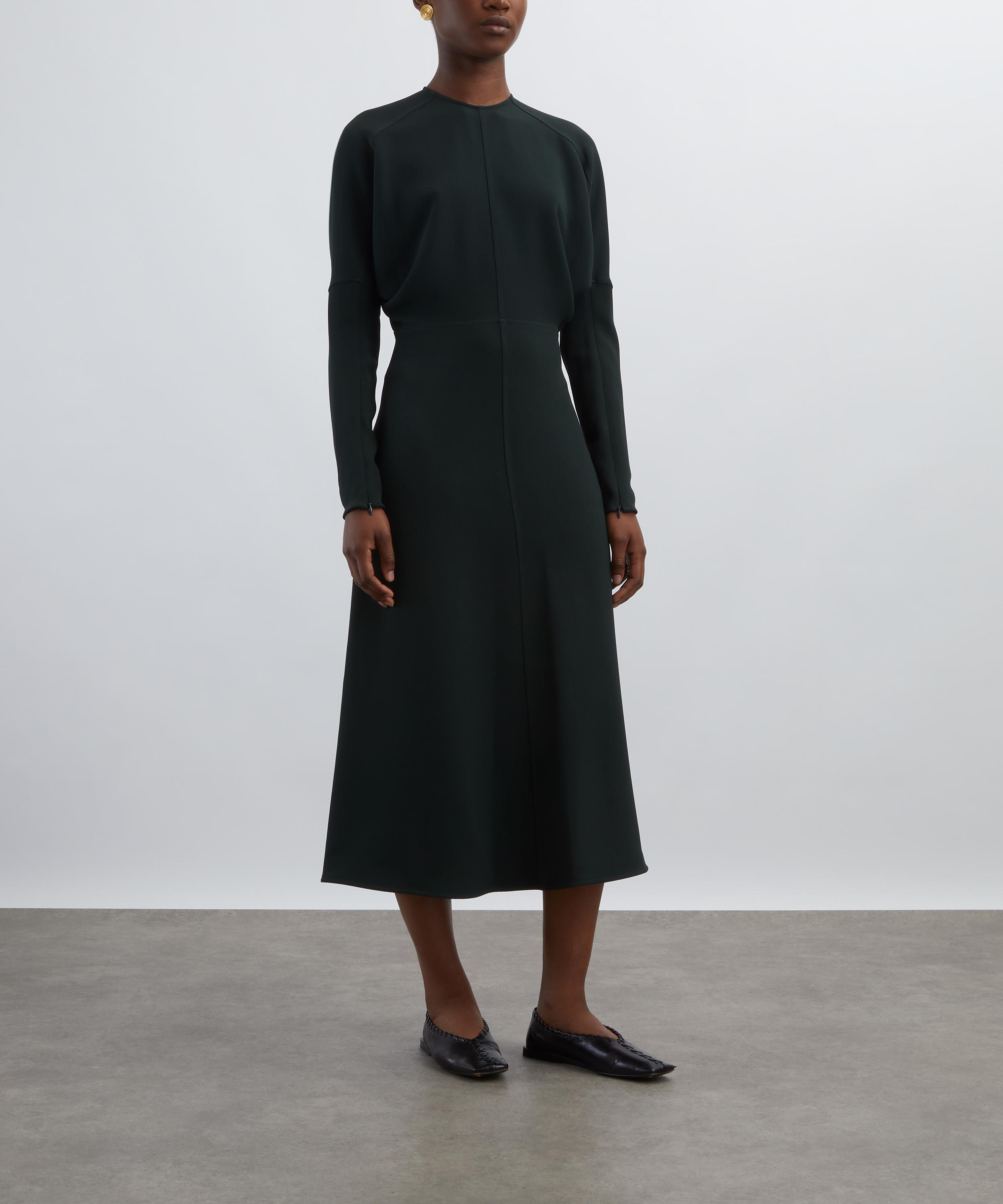 The signature Dolman Midi Dress returns in a rich Dark Pine hue. Cut from fluid cady, it features a discrete neckline, voluminous underarm drape, and concealed wrist zips for easy styling. Tonal topstitching and a softly defined waist complete its effortlessly elegant silhouette.