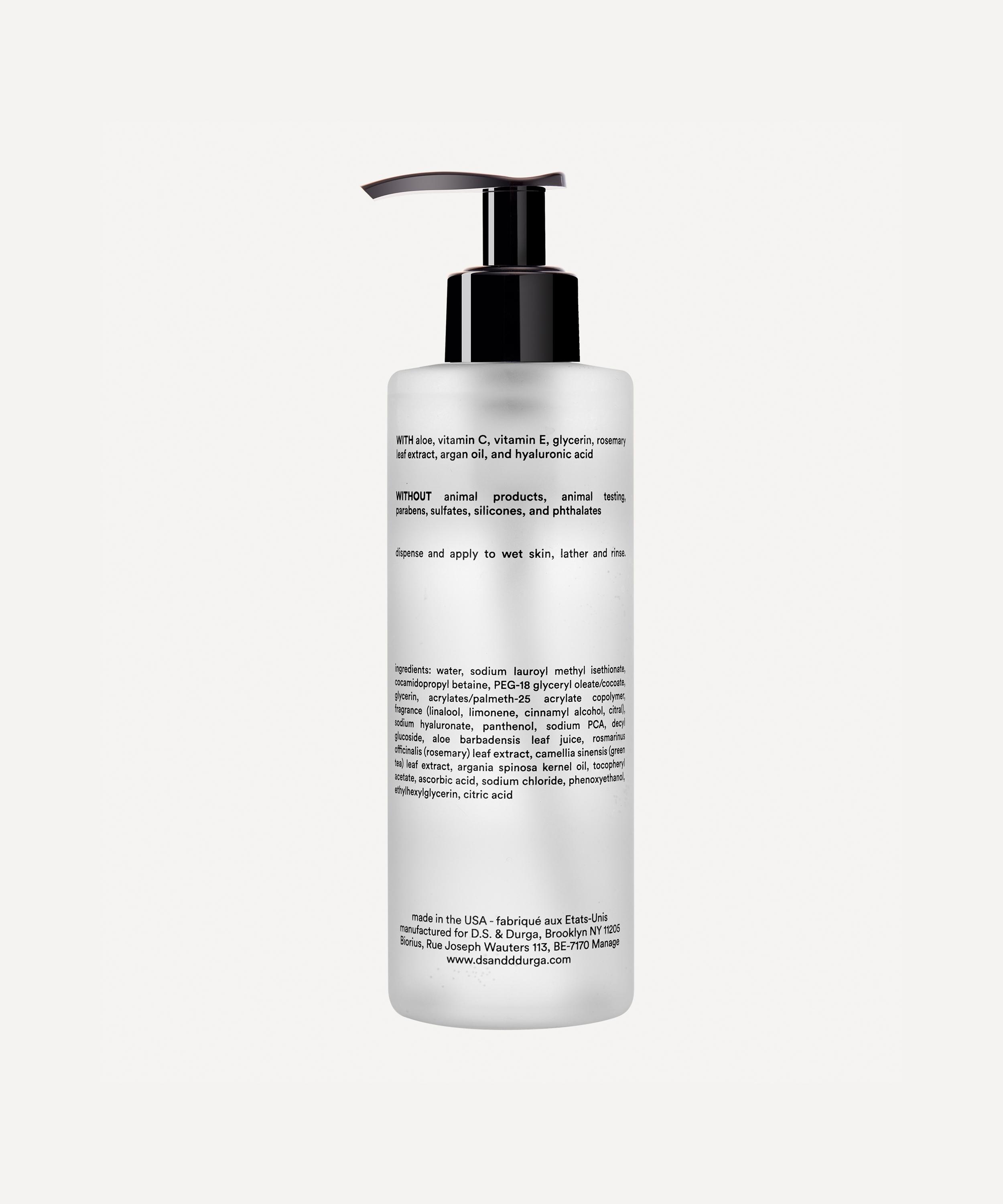 Water, Sodium Lauroyl Methyl Isethionate, Cocamidopropyl Betaine, Peg-18 Glyceryl Oleate/Cocoate, Glycerin, Acrylates/Palmeth-25 Acrylate Copolymer, Fragrance (Coumarin, Hydroxyisohexyl-3-cyclohexene-carboxaldehyde, Linalool, Citral, Citronellol, Eugenol, Geraniol, Limonene), Sodium Hyaluronate, Panthenol, Sodium PCA, Decyl Glucoside, Aloe Barbadensis Leaf Juice, Rosmarinus Officinalis (Rosemary) Leaf Extract, Camellia Sinensis (Green Tea) Leaf Extract, Argania Spinosa Kernel Oil, Tocopheryl Acetate, Ascorbic Acid, Sodium Chloride, Phenoxyethanol, Ethylhexylglycerin, Citric Acid