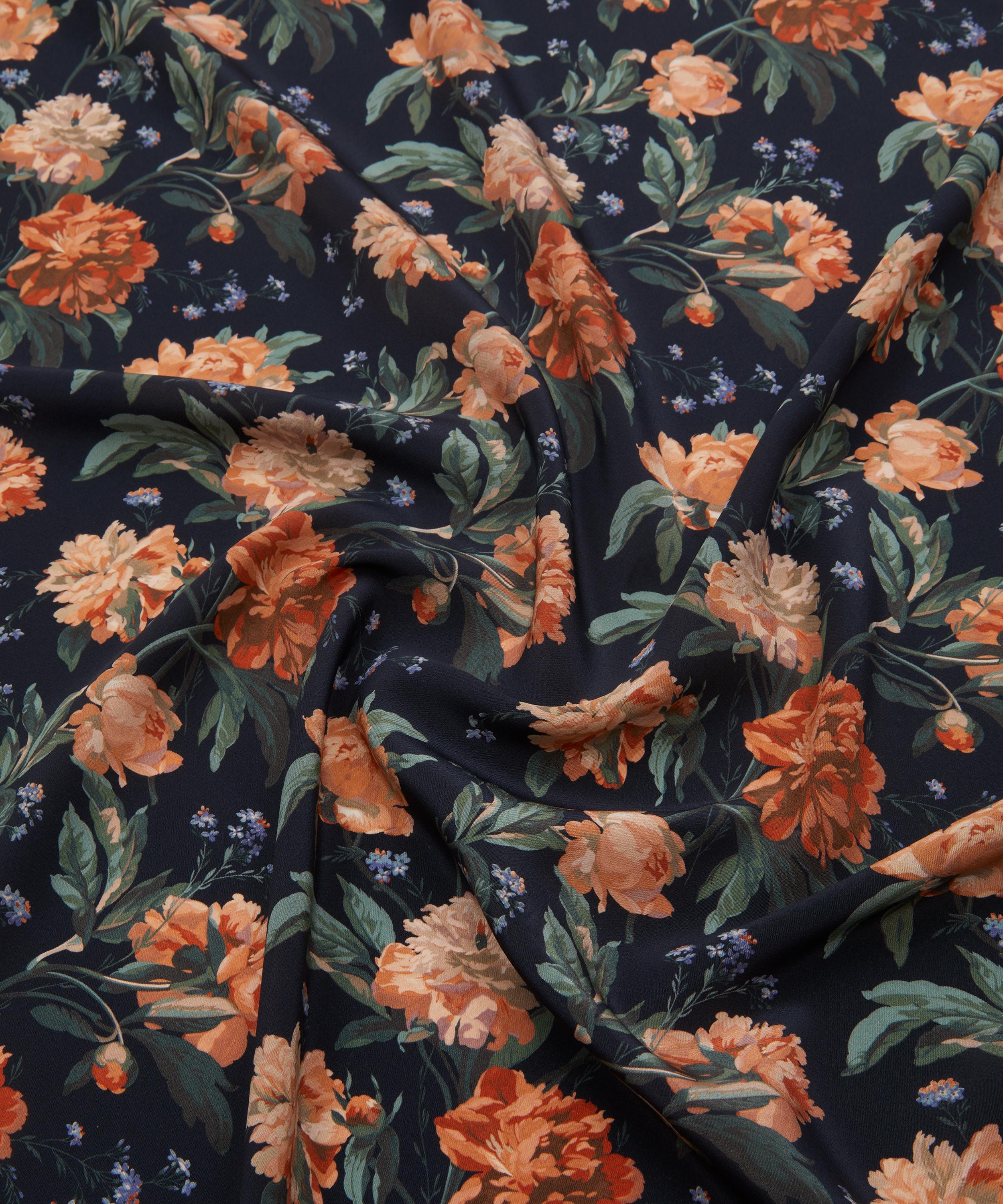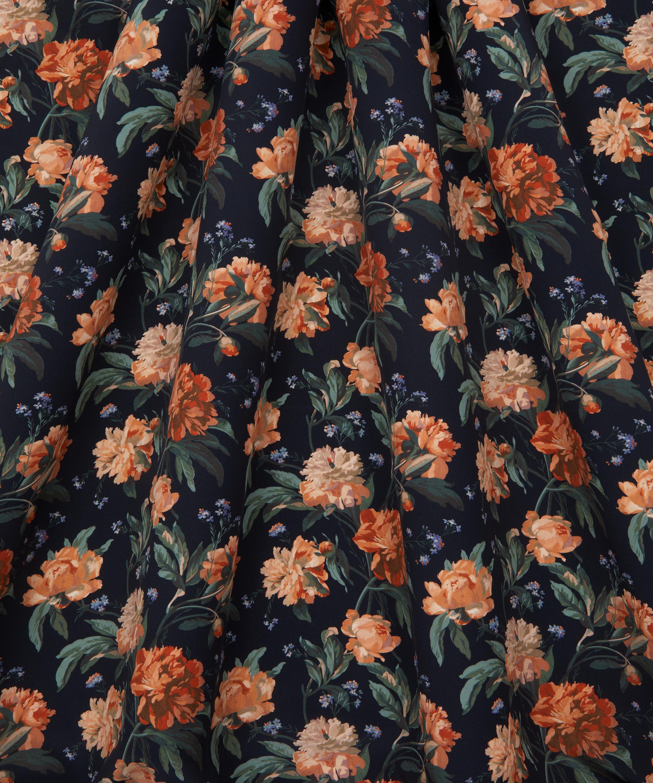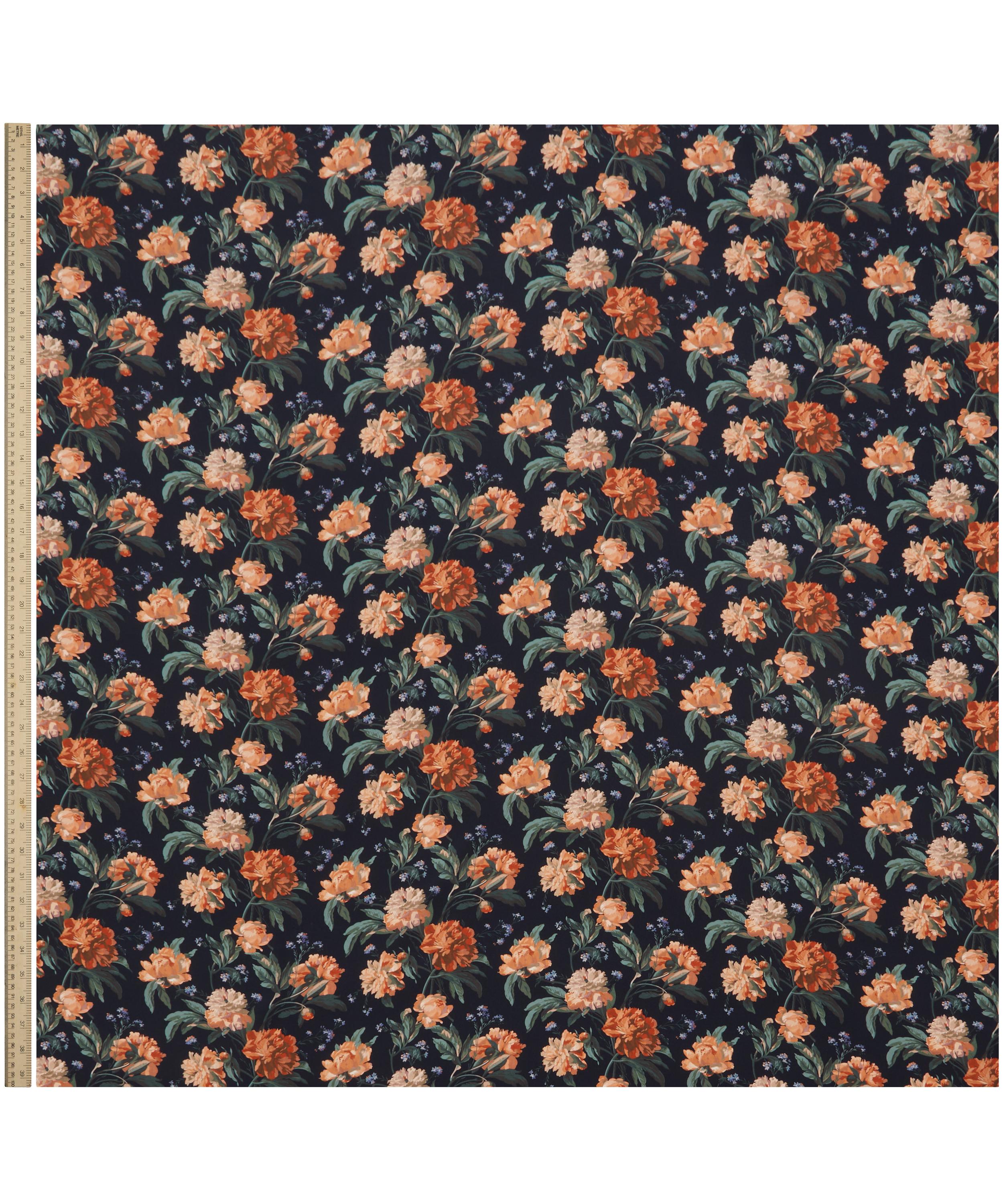 Decadent Blooms draws inspiration from a hand-painted artwork discovered in the Liberty archive. First introduced as a furnishing fabric in 1989, this magnificent botanical features large and bounteous bunches of roses, peonies, and forget-me-nots, gracefully trailing across the fabric. Set against richly dark backdrops, these flowers take centre stage, their warm hues accentuated and intensified, to add depth and visual contrast.