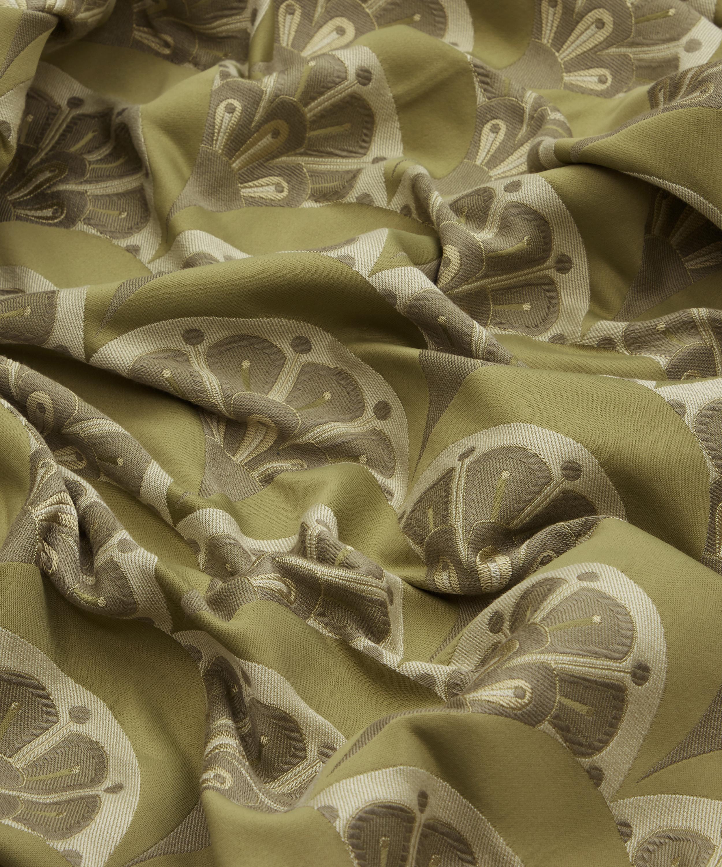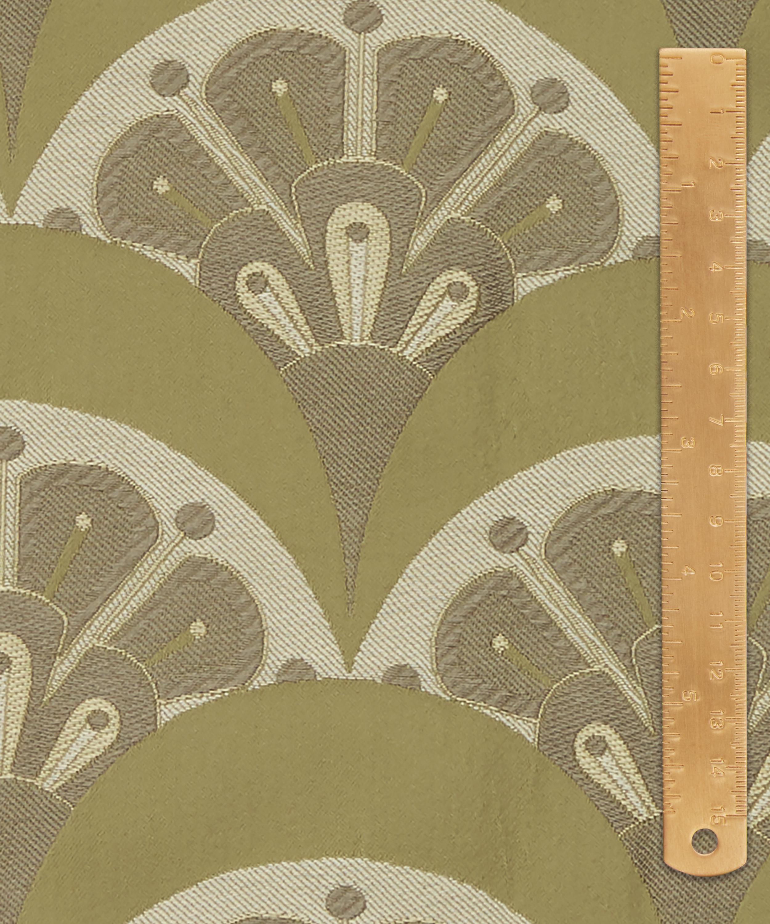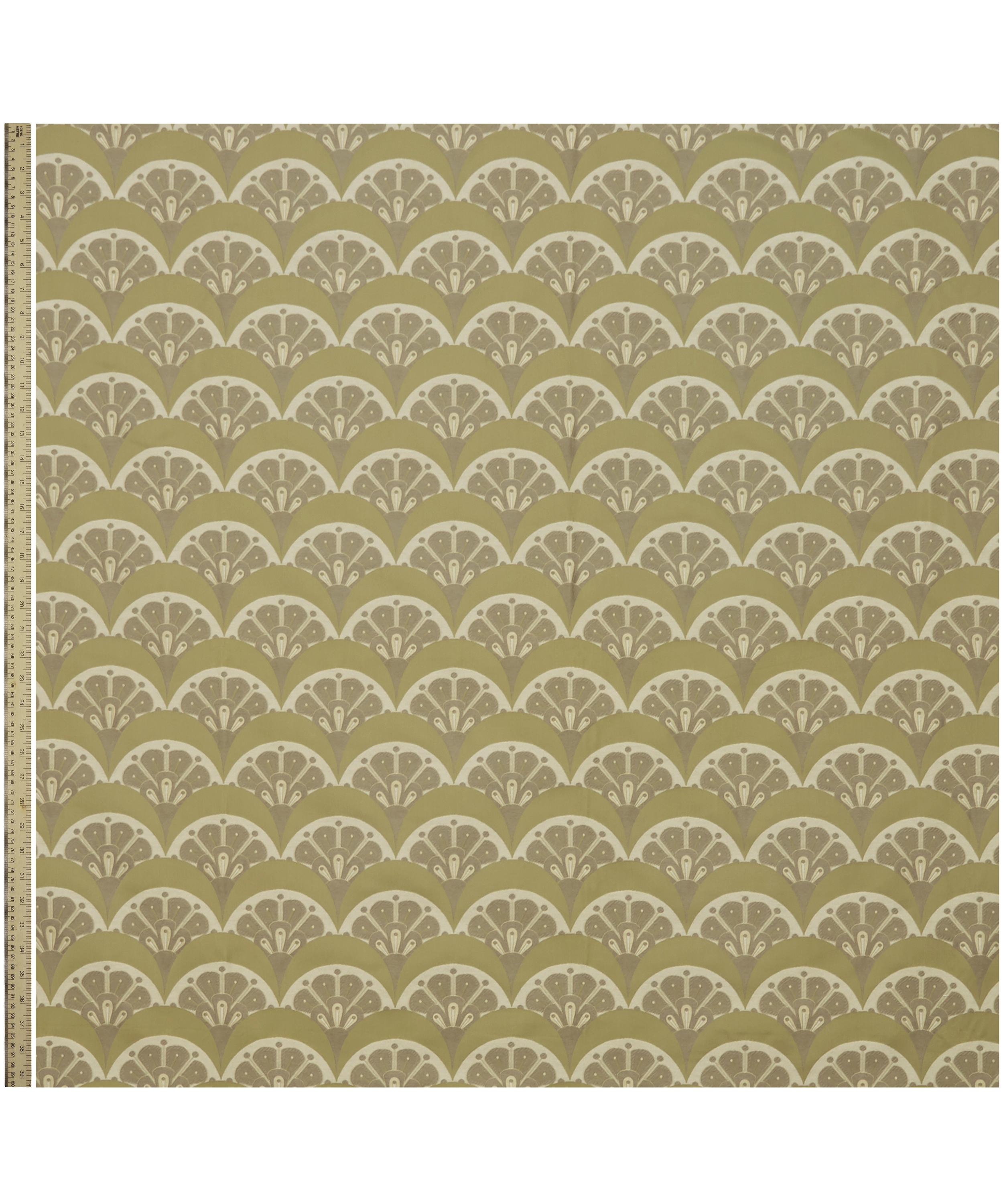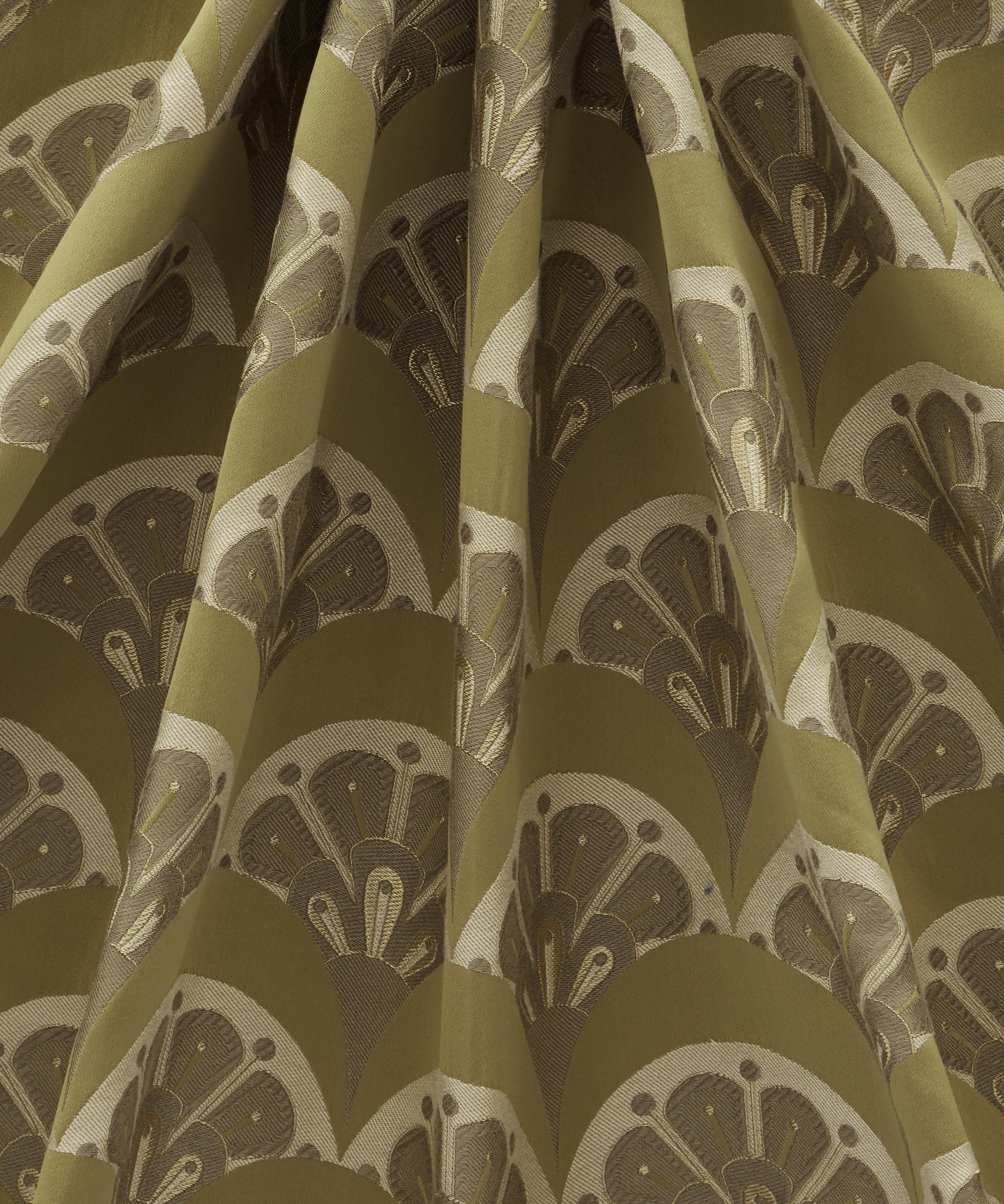 Deco Scallop is inspired by Liberty’s archive catalogues of the late 1890s to 1910s, when beautiful Japanese Art Deco fans and wallpapers were imported alongside fabrics, jewellery, porcelain, screens, and rugs. The motif was developed by the Liberty design studio as a simple contemporary woven jacquard design – a modern take on the Liberty peacock feather and Art Deco fan.